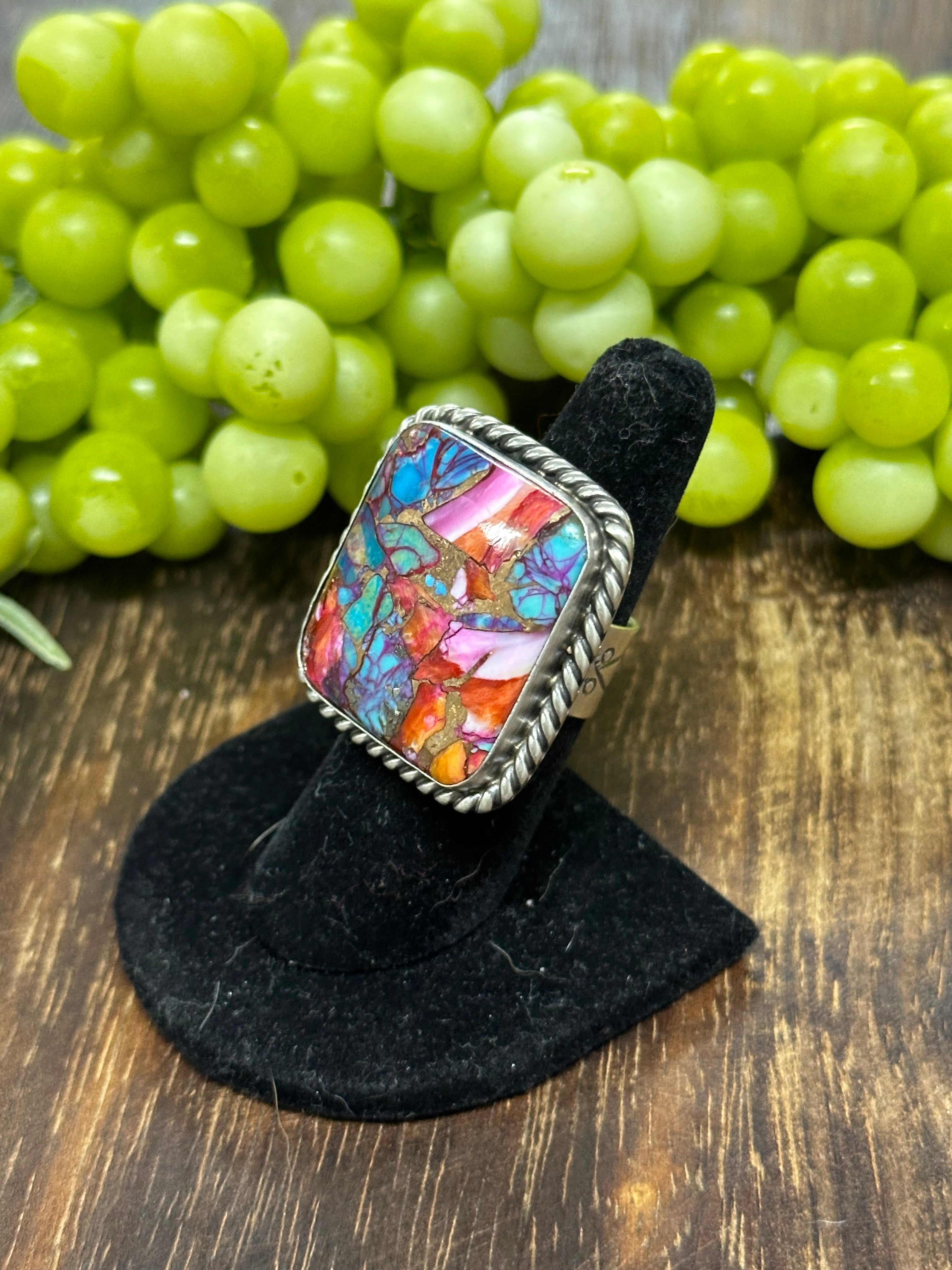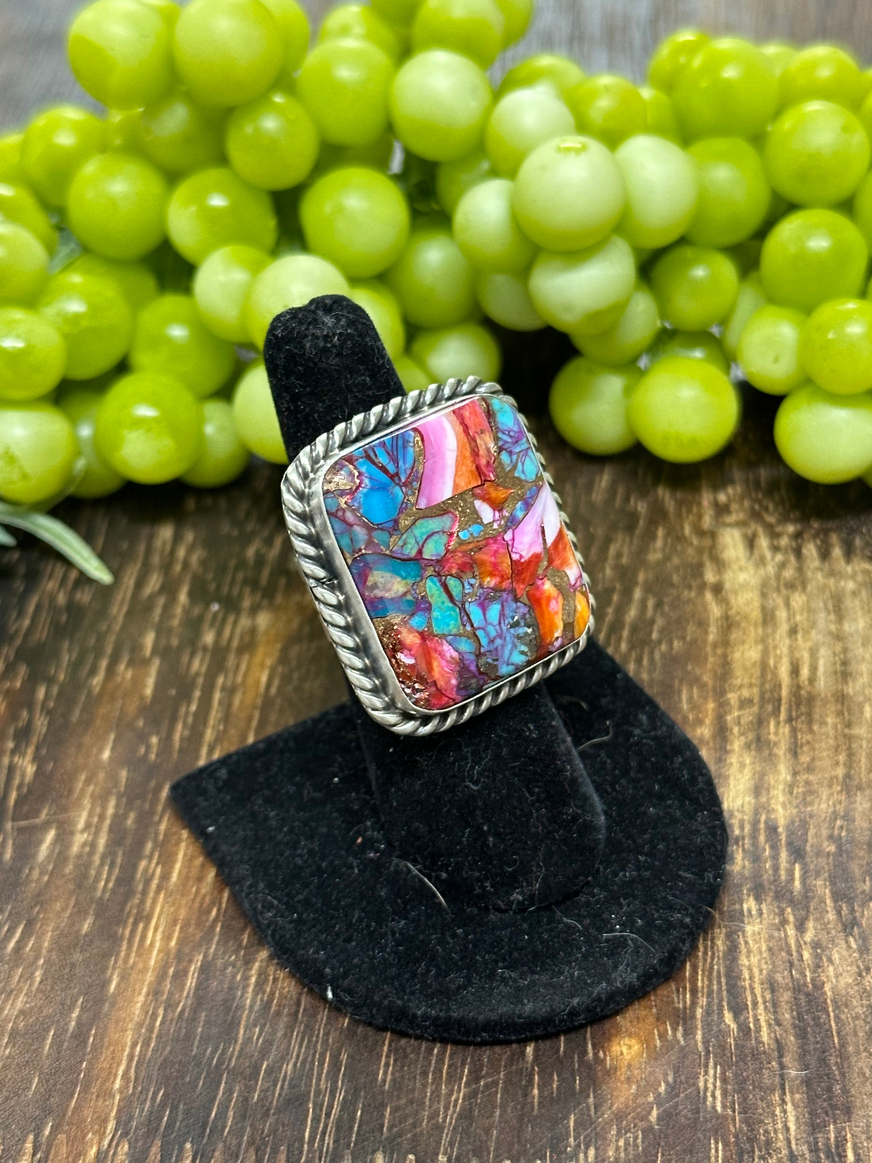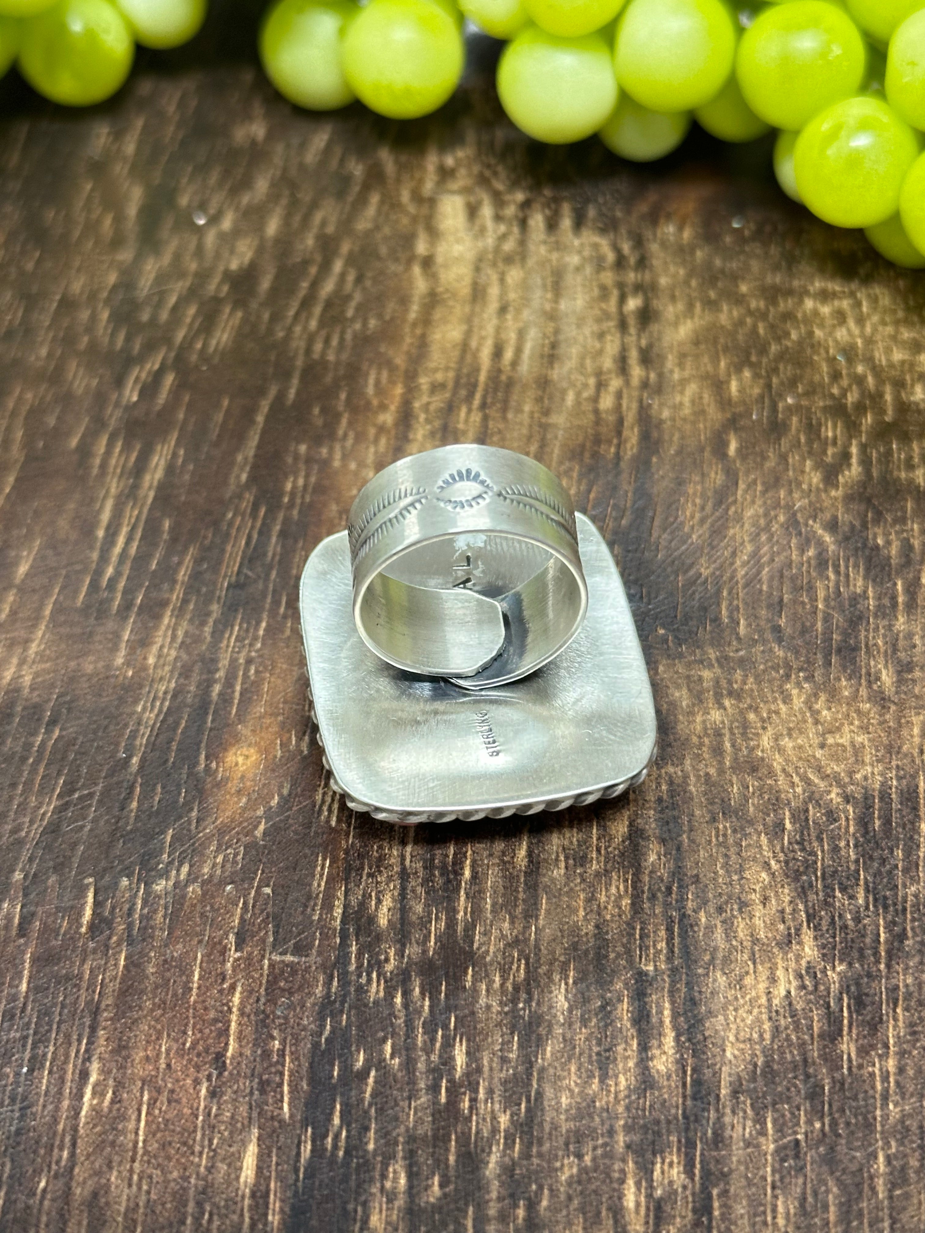 Beautiful ring, Augustine Largo Mohave Turquoise & Sterling Silver Adjustable Ring. It measures 1 3/8 inches long and 1 3/8 inches wide. Signed by the artist and stamped sterling silver.