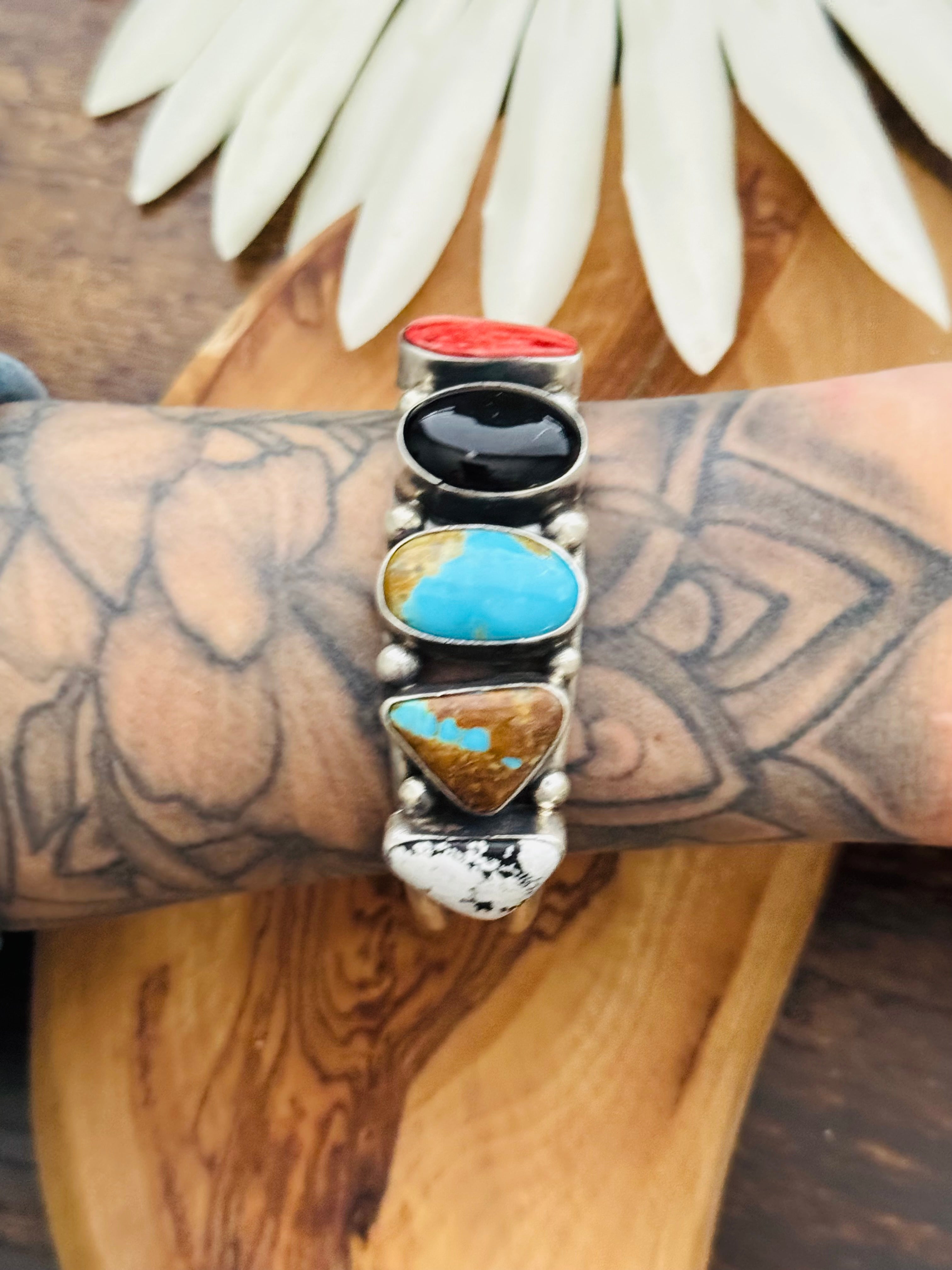 Augustine Largo Multi Stone & Sterling Silver Cuff Bracelet. It measures 3/4 of an inch wide with an inside circumference of 5 1/2 inches and a gap of 1 inch. Signed by artist and stamped sterling silver.