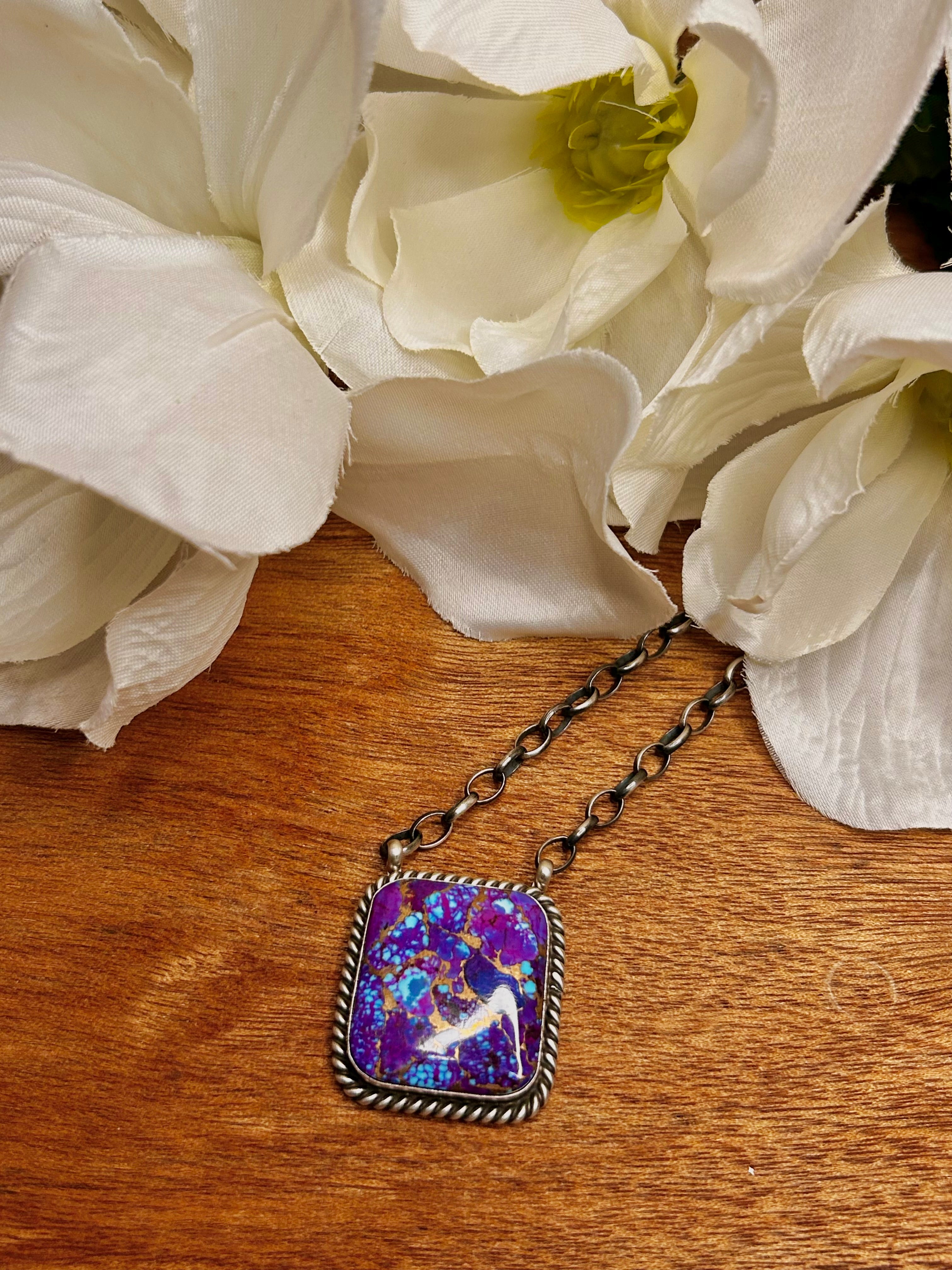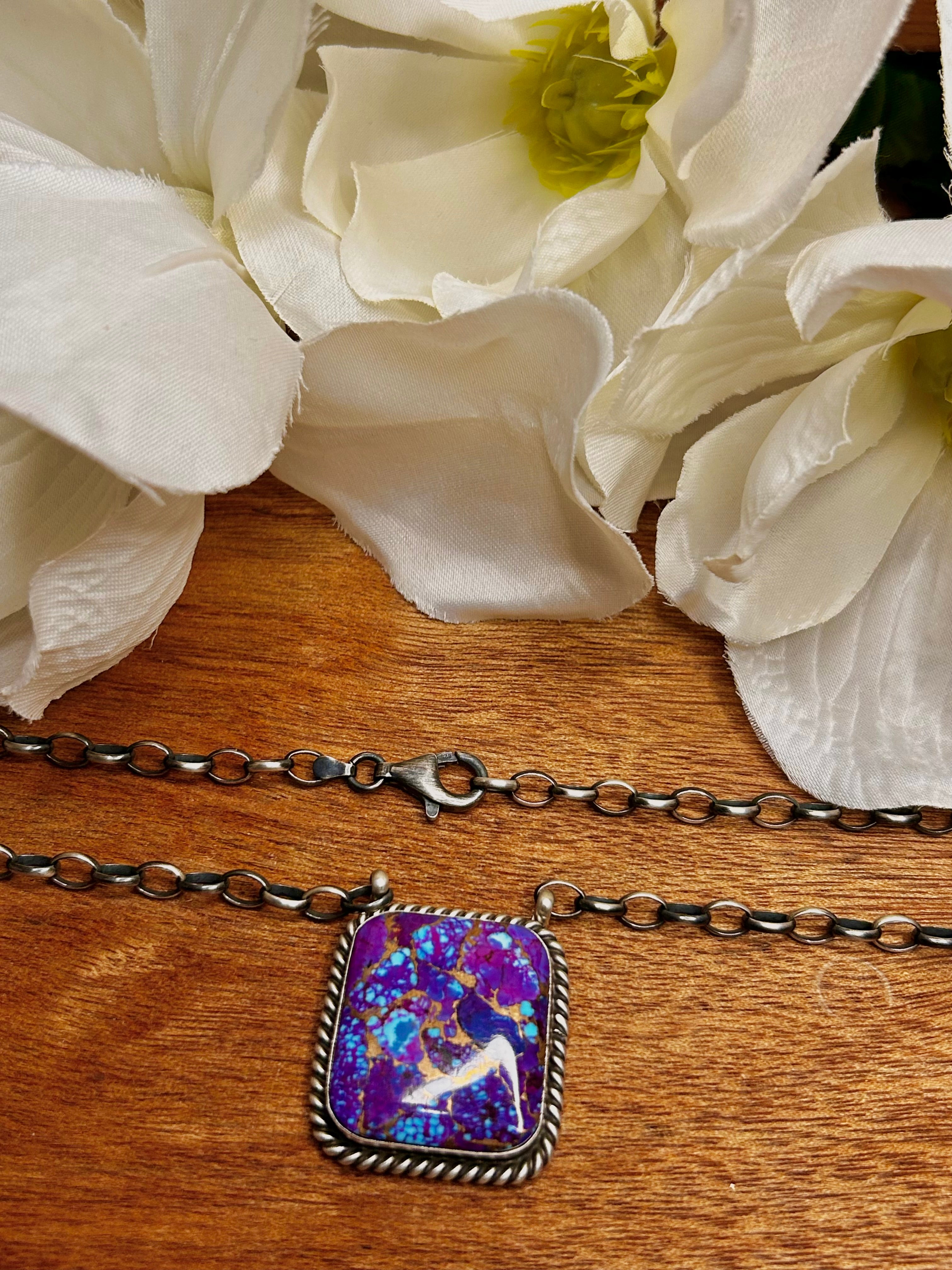 Augustine Largo Purple Mohave Turquoise & Sterling Silver Necklace. It measures 18 1/2 inches long with hang while the chain measures 15 1/4 inches long. Signed by the artist and stamped sterling silver.