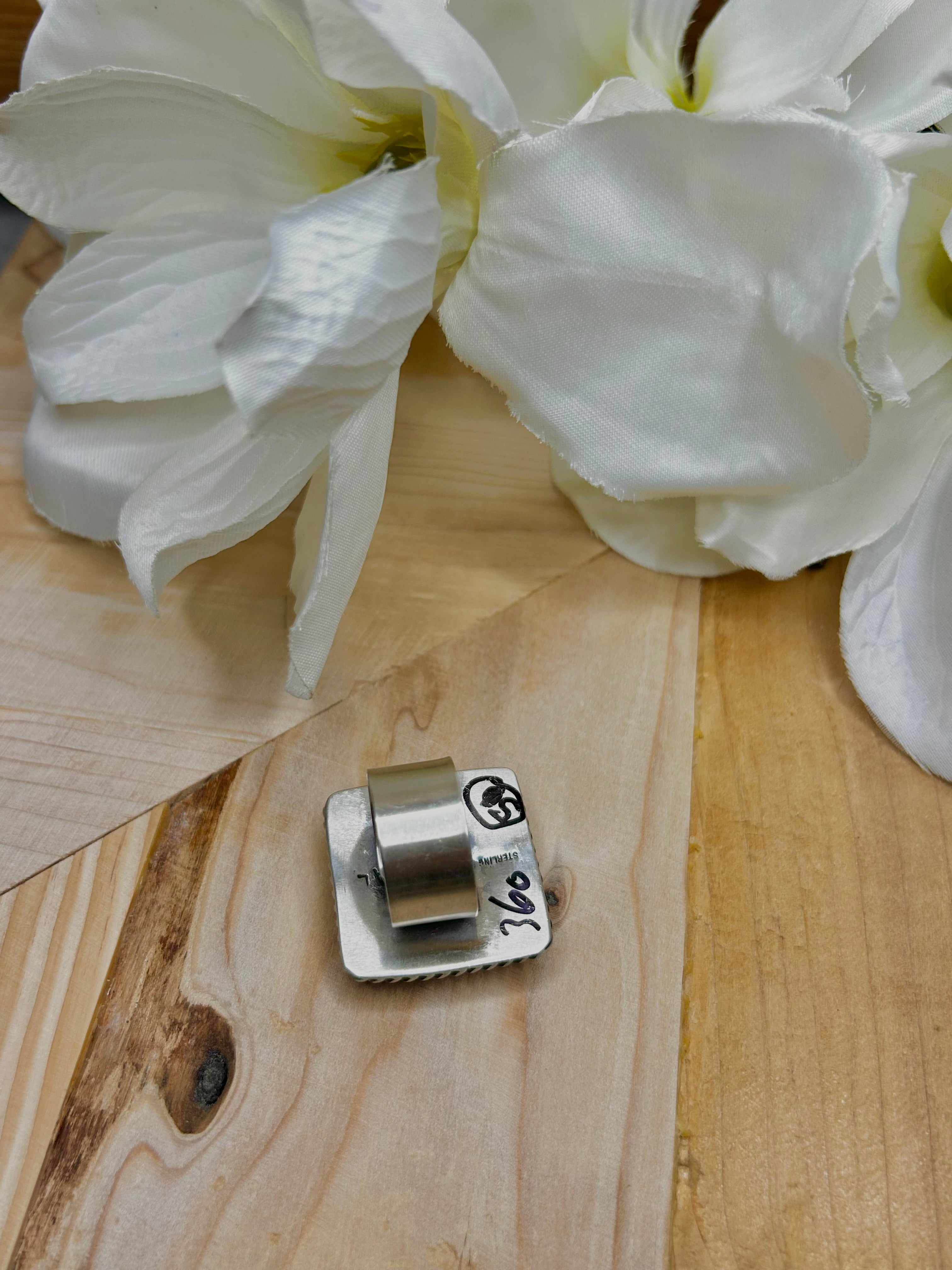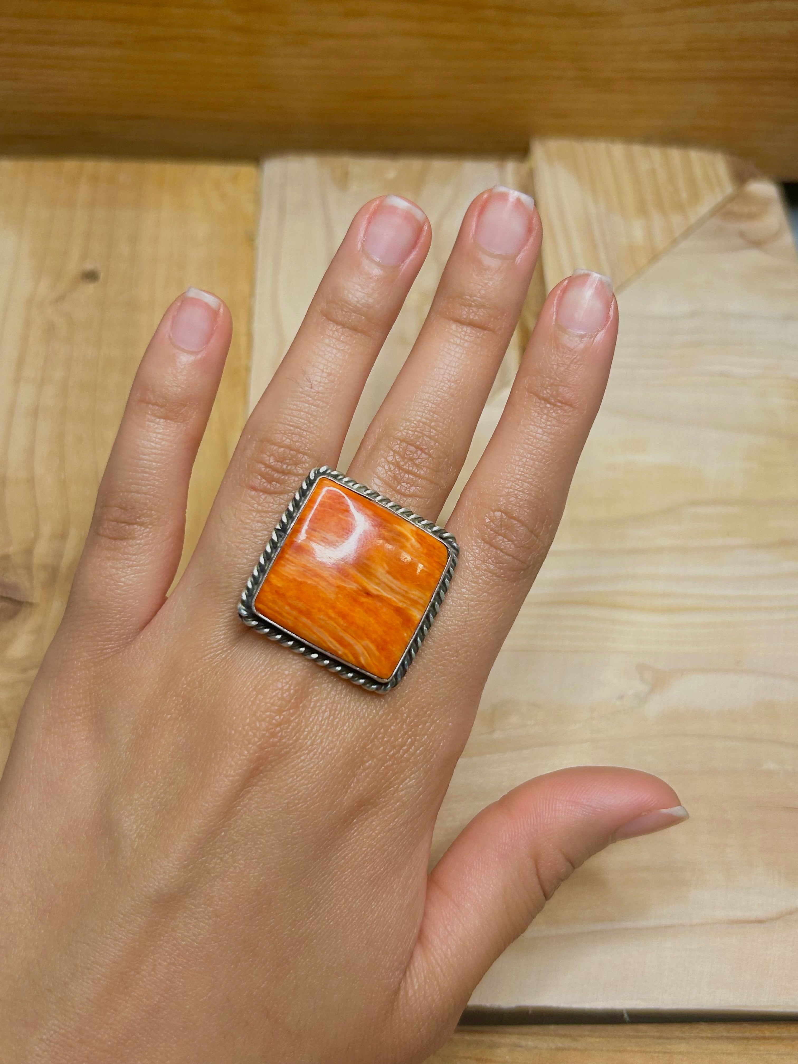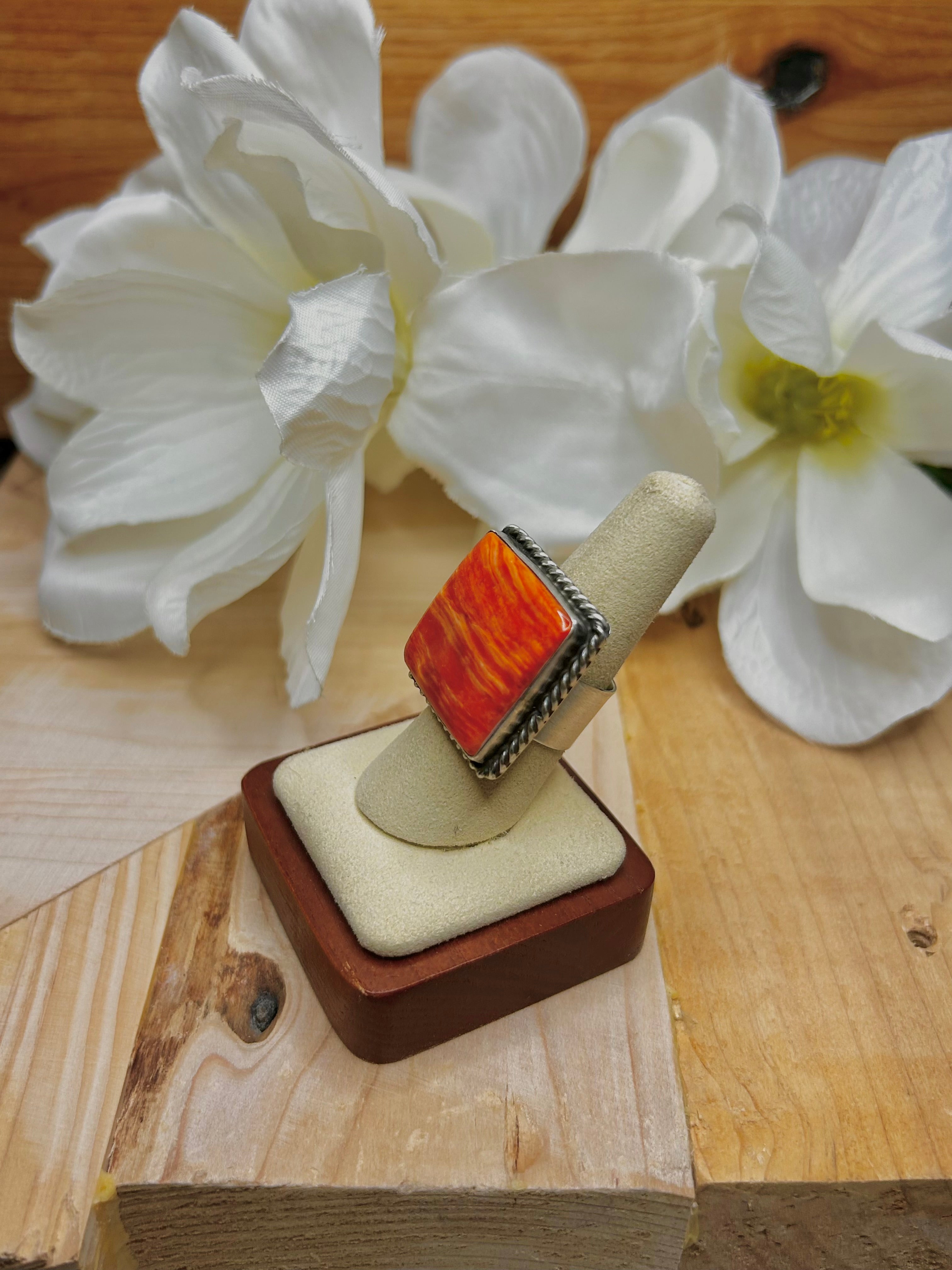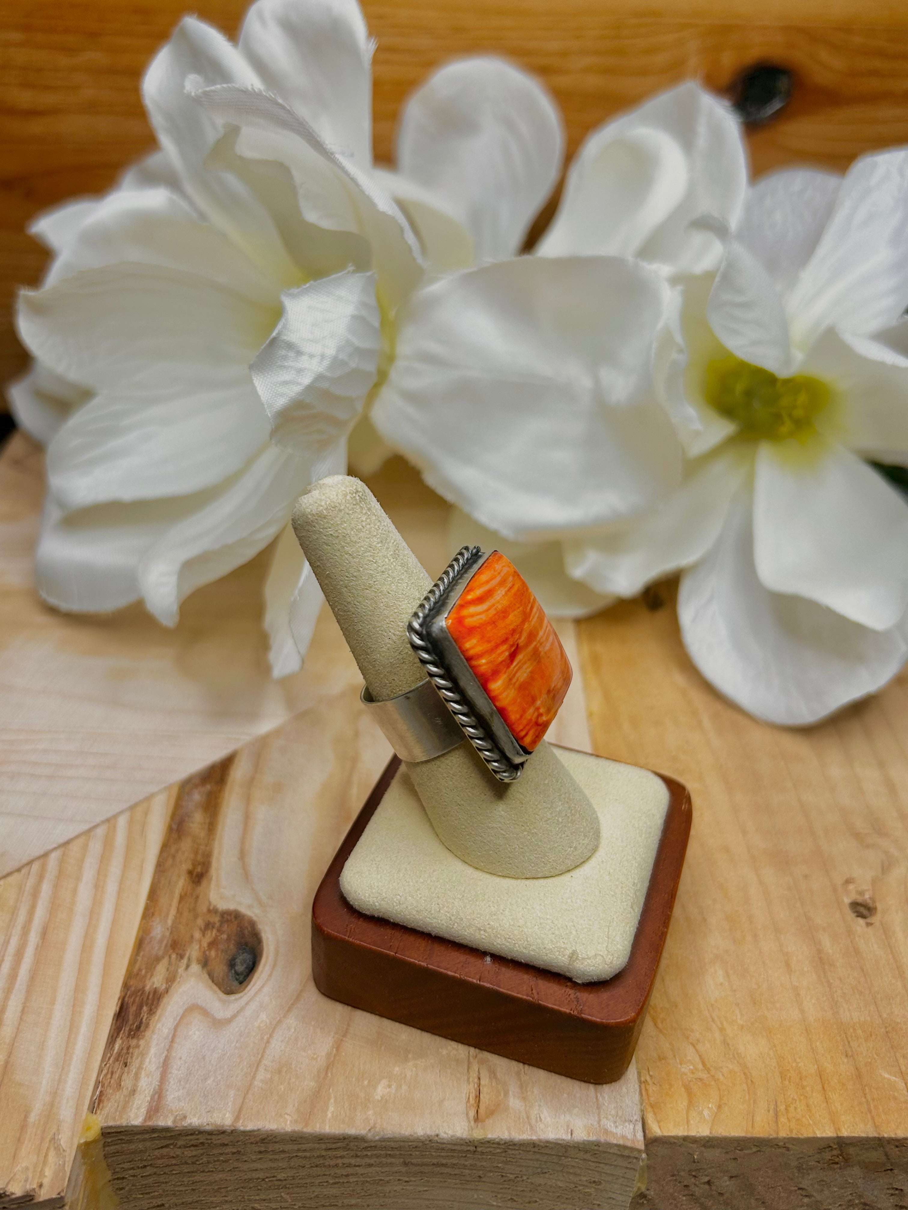 Augustine Largo Spiny Oyster & Sterling Silver Cluster Adjustable Ring. It measures 1 inch long and 1 inch wide. Signed by artist and stamped sterling silver.