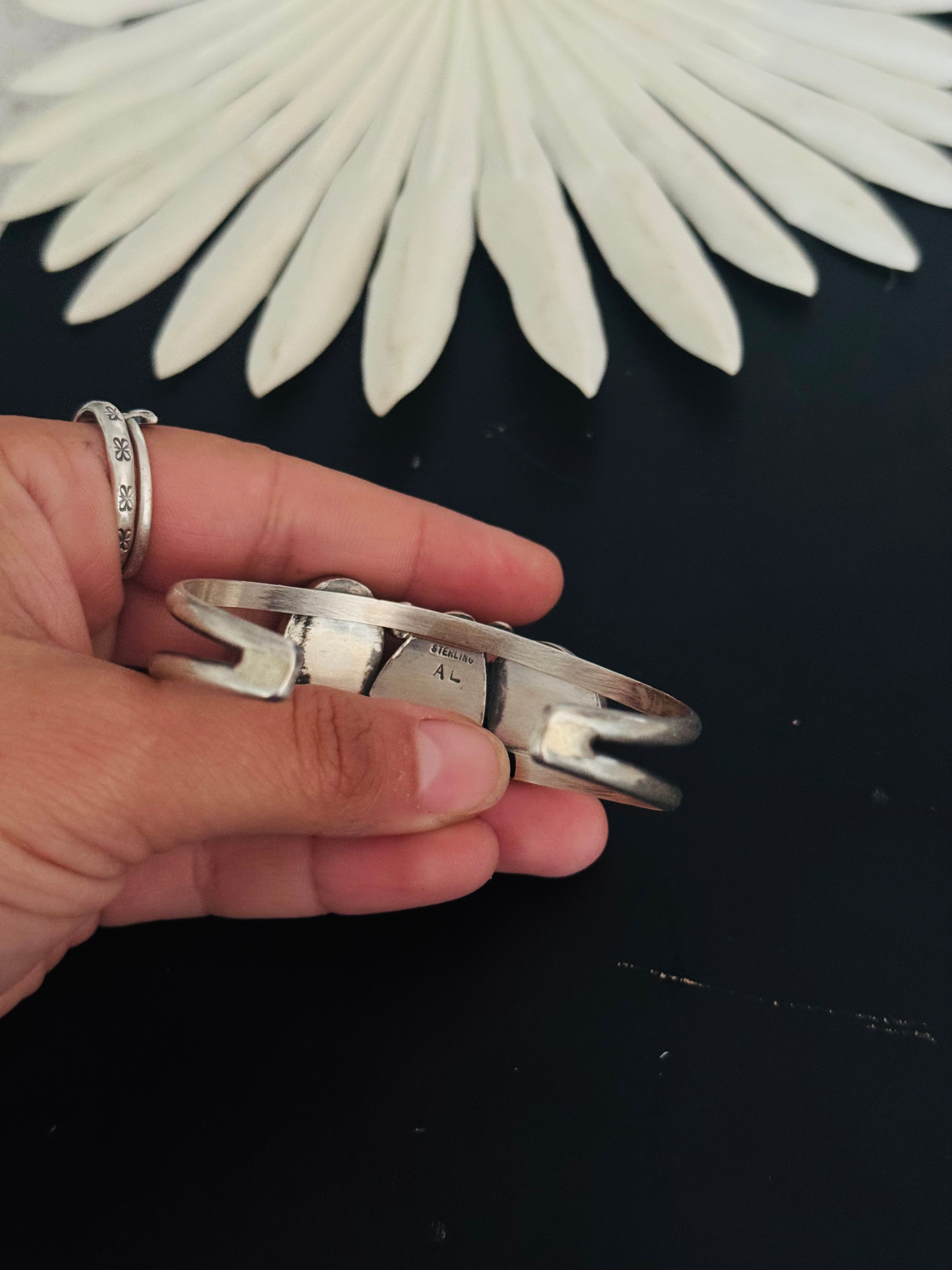Augustine Largo Royston Turquoise & Sterling Silver Cuff Bracelet. It measures 3/4 of an inches wide with an inside circumference of 5 1/2 inches and a gap of 1 inch Signed by the artist and stamped sterling silver.