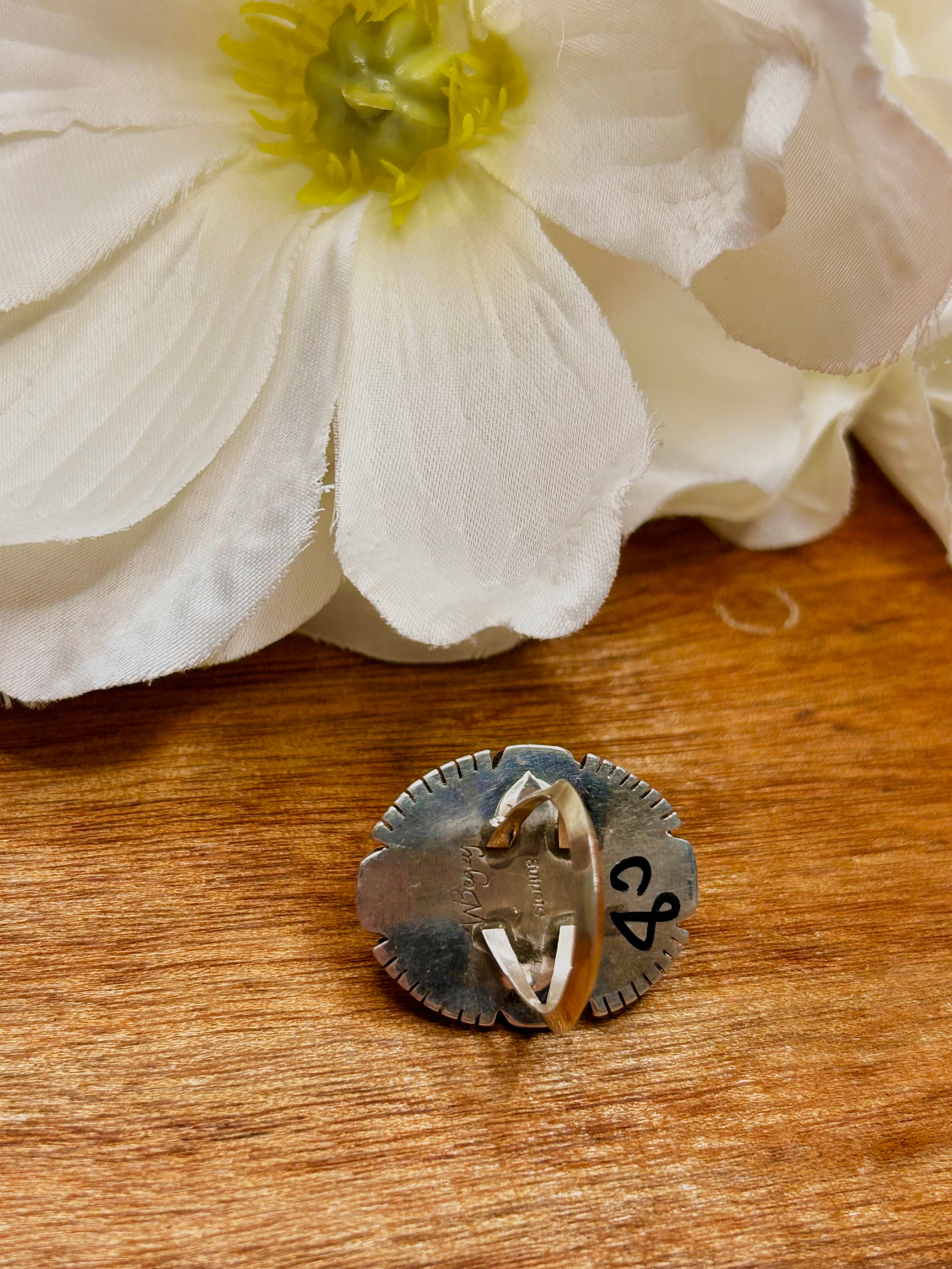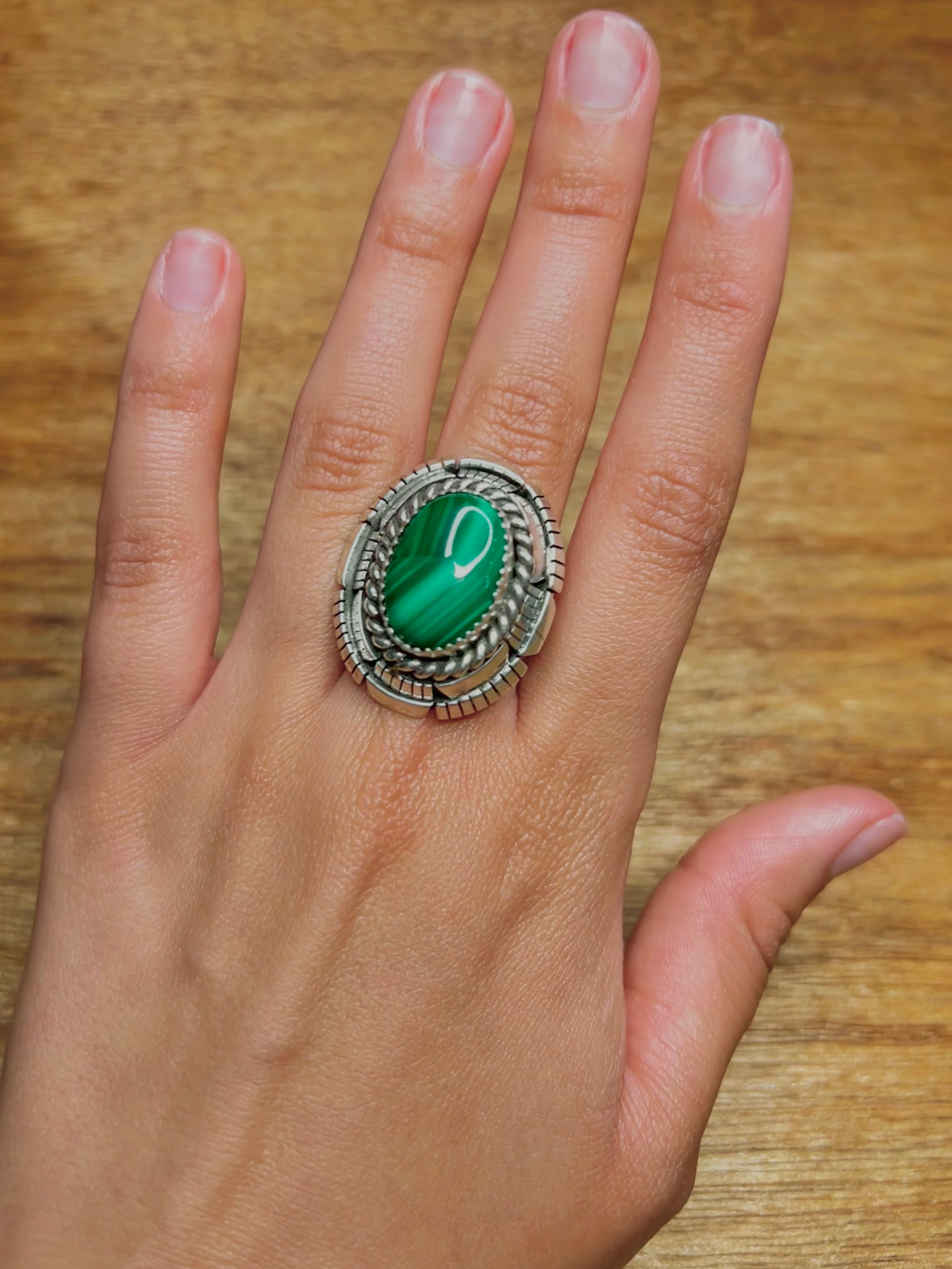 Navajo Made Malachite & Sterling Sliver Cluster Ring Size 7. It measures 1 1/4 inches long and 1 inch wide. Signed by the artist and stamped sterling silver.