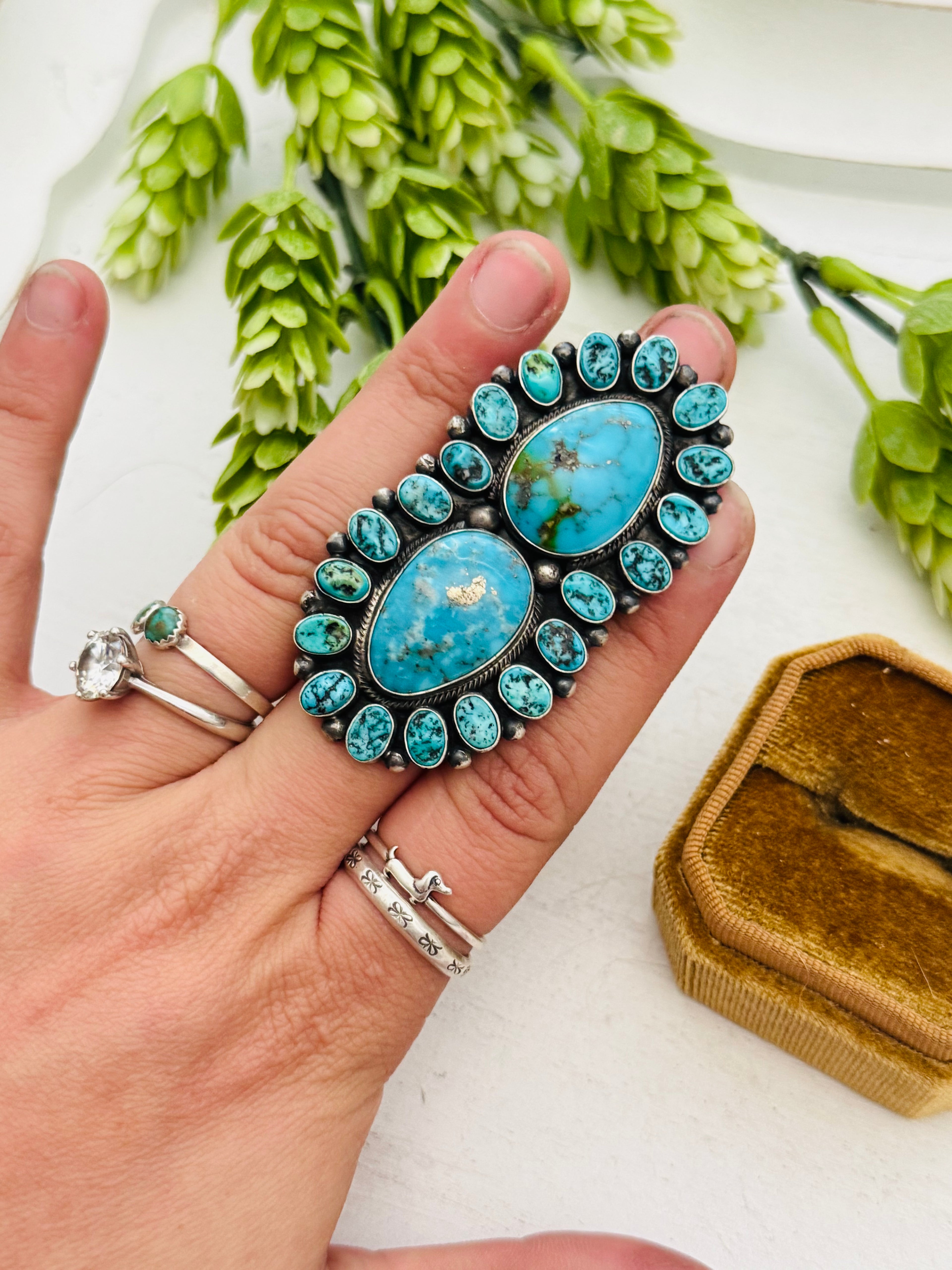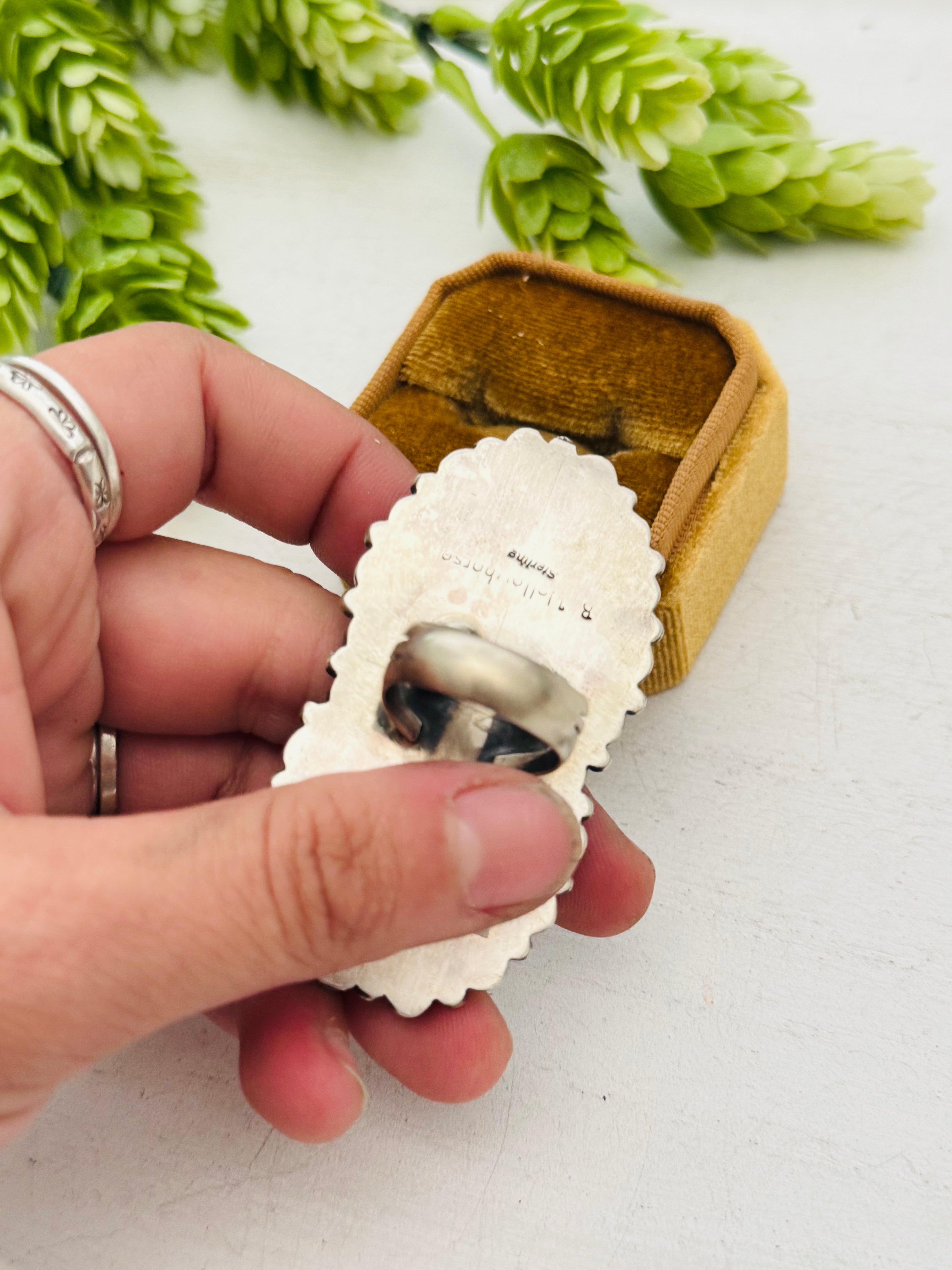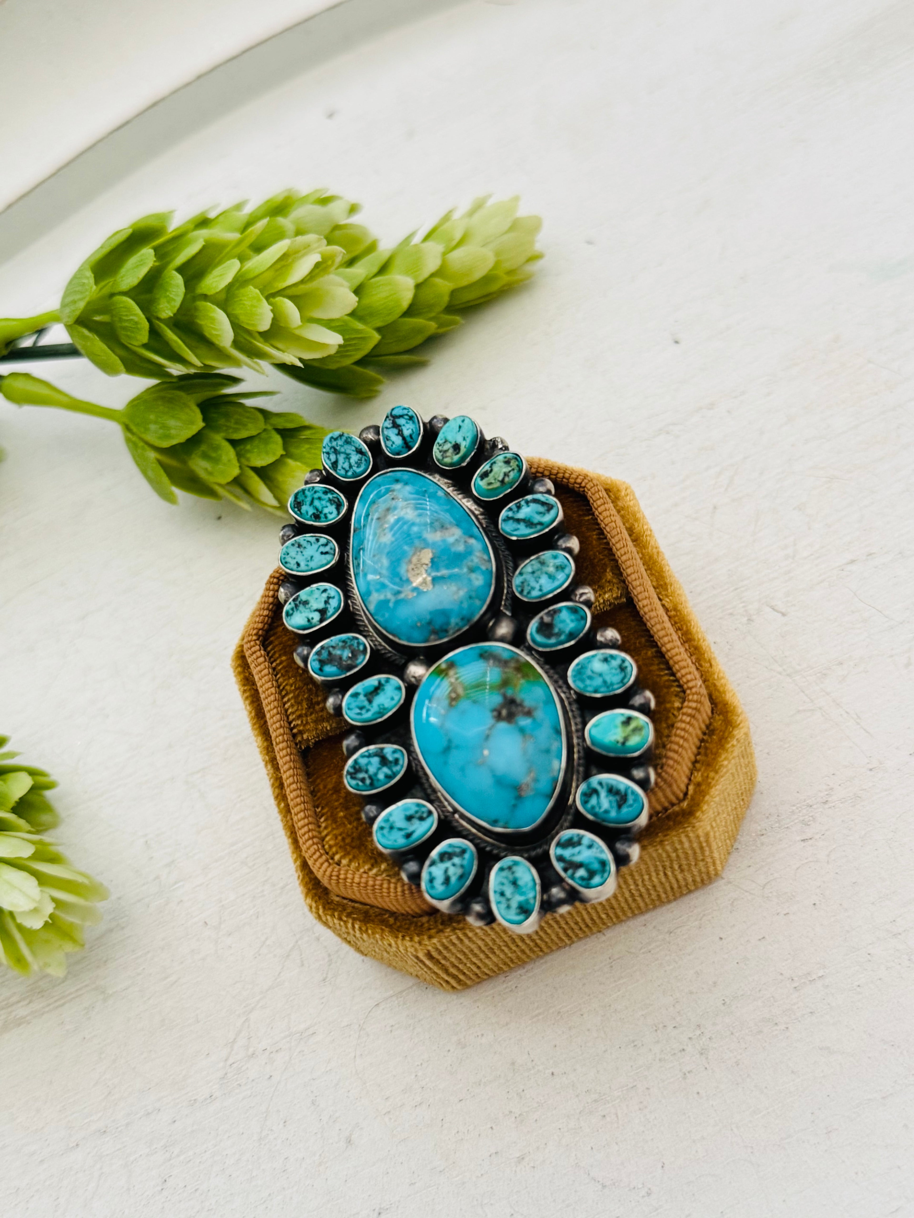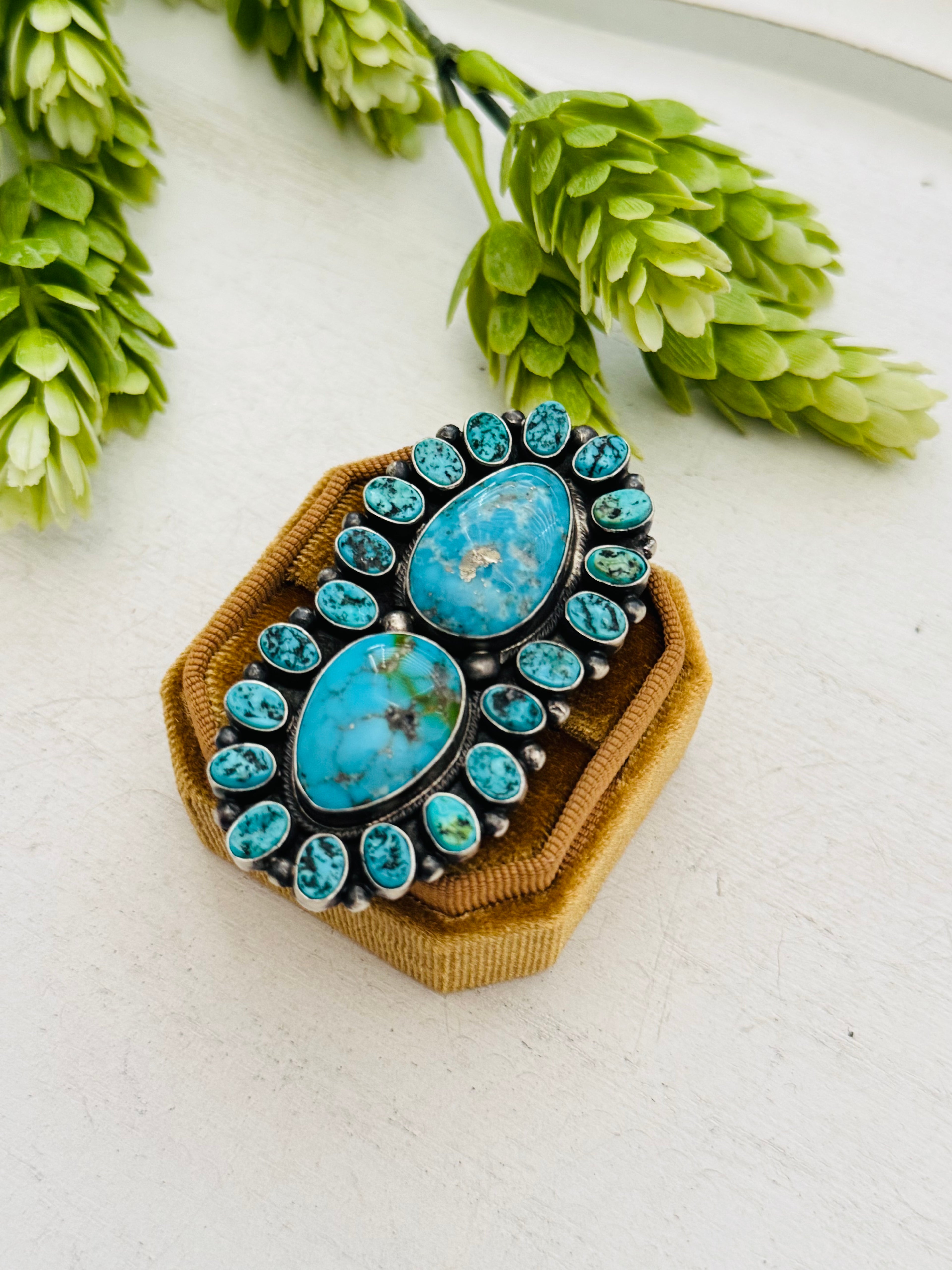Beautiful ring. Blaine Yellowhorse Kingman Turquoise & Sterling Silver Ring Size 5.5. It measures 2 1/2 inches long and 1 1/4 inches wide. Stamped sterling silver and signed by artist.