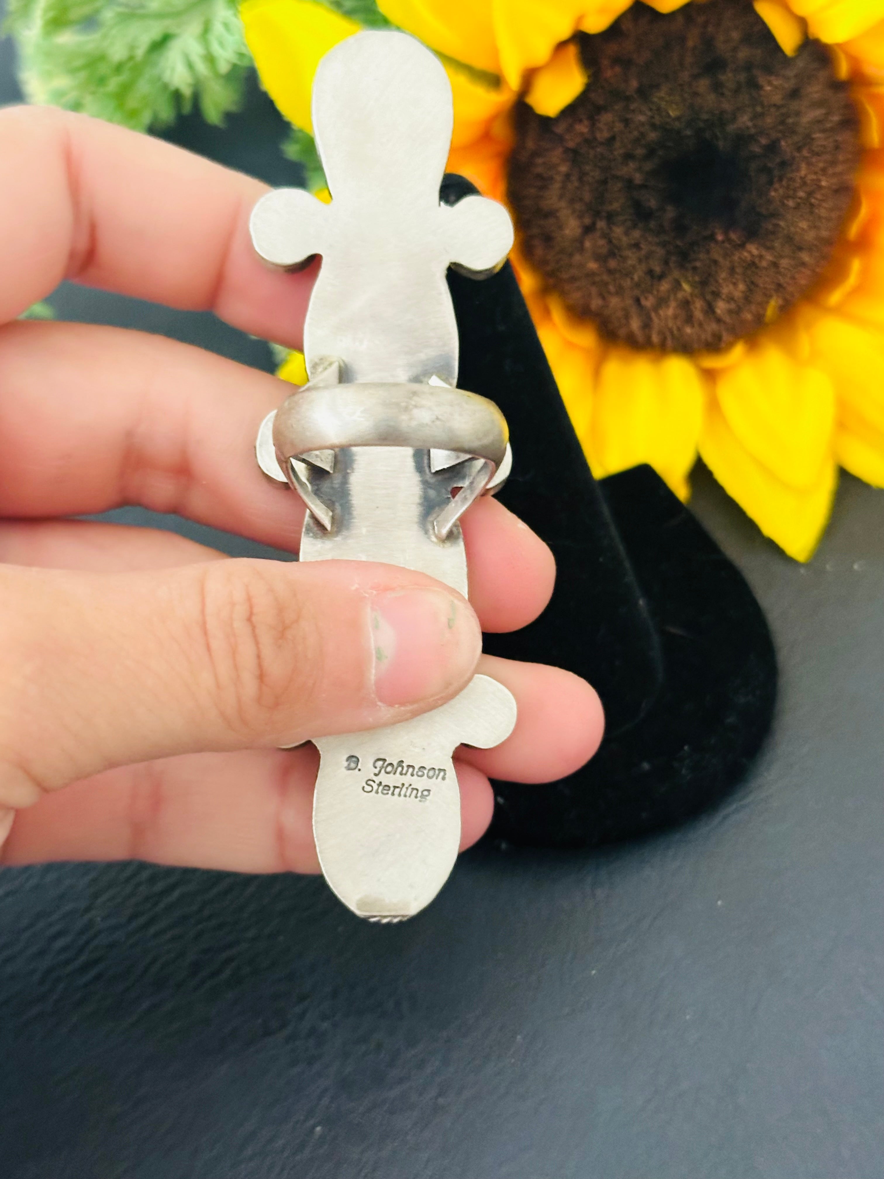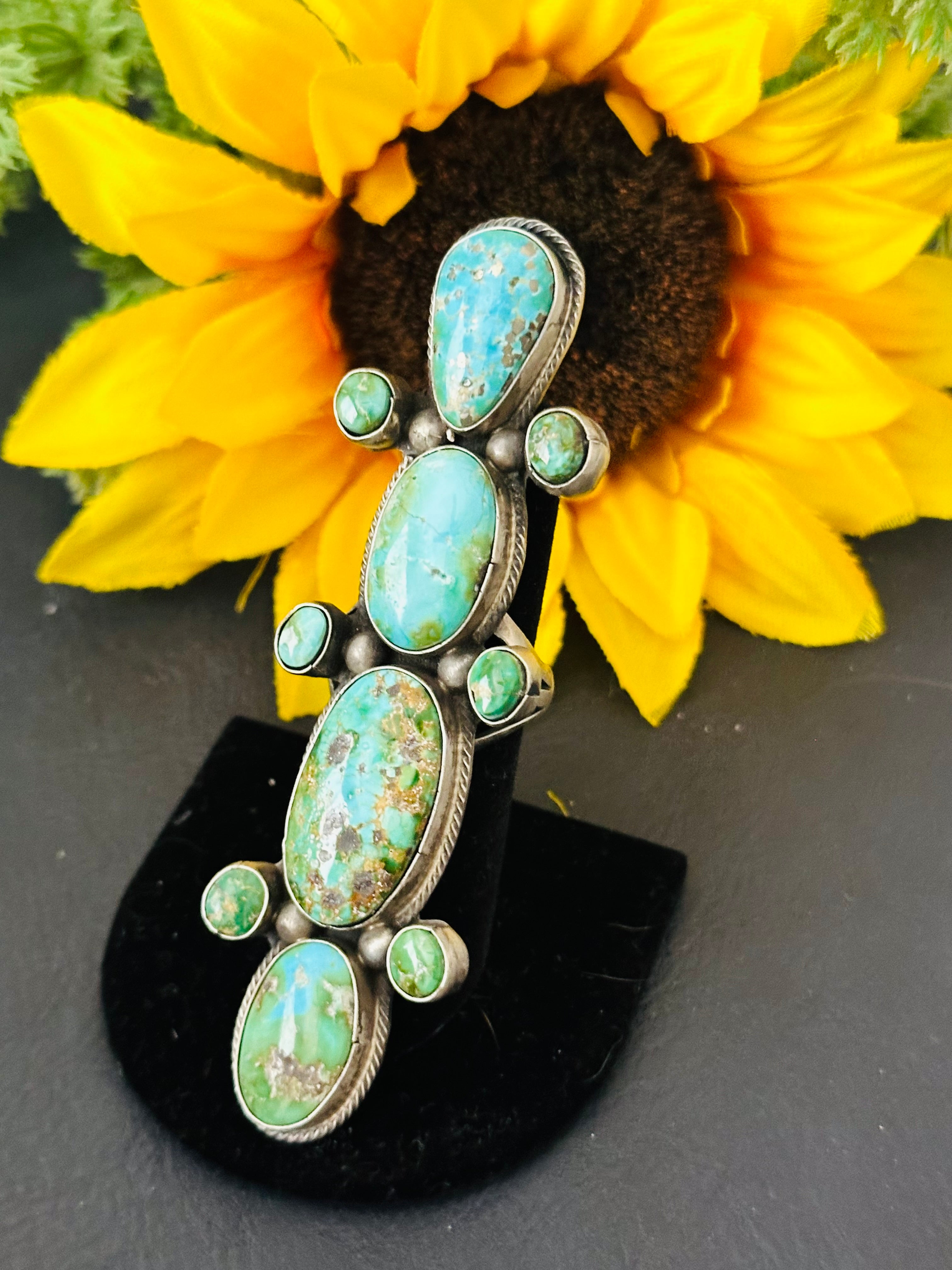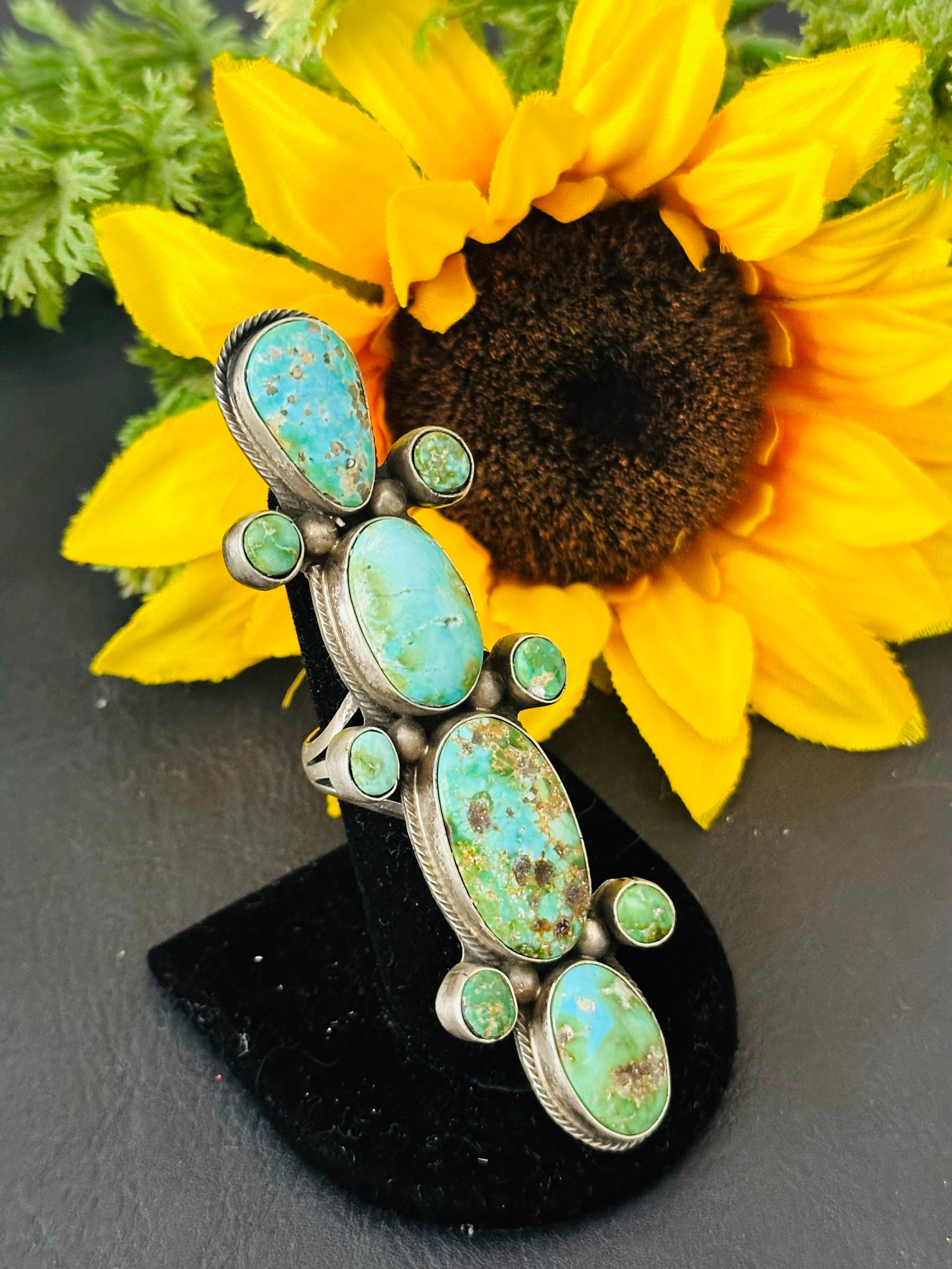 Bobby Johnson Sonoran Gold Turquoise & Sterling Silver Cluster Ring Size 8.5. It measures 3 5/8 inches long and 1 inch wide. Signed by artist and stamped sterling silver.