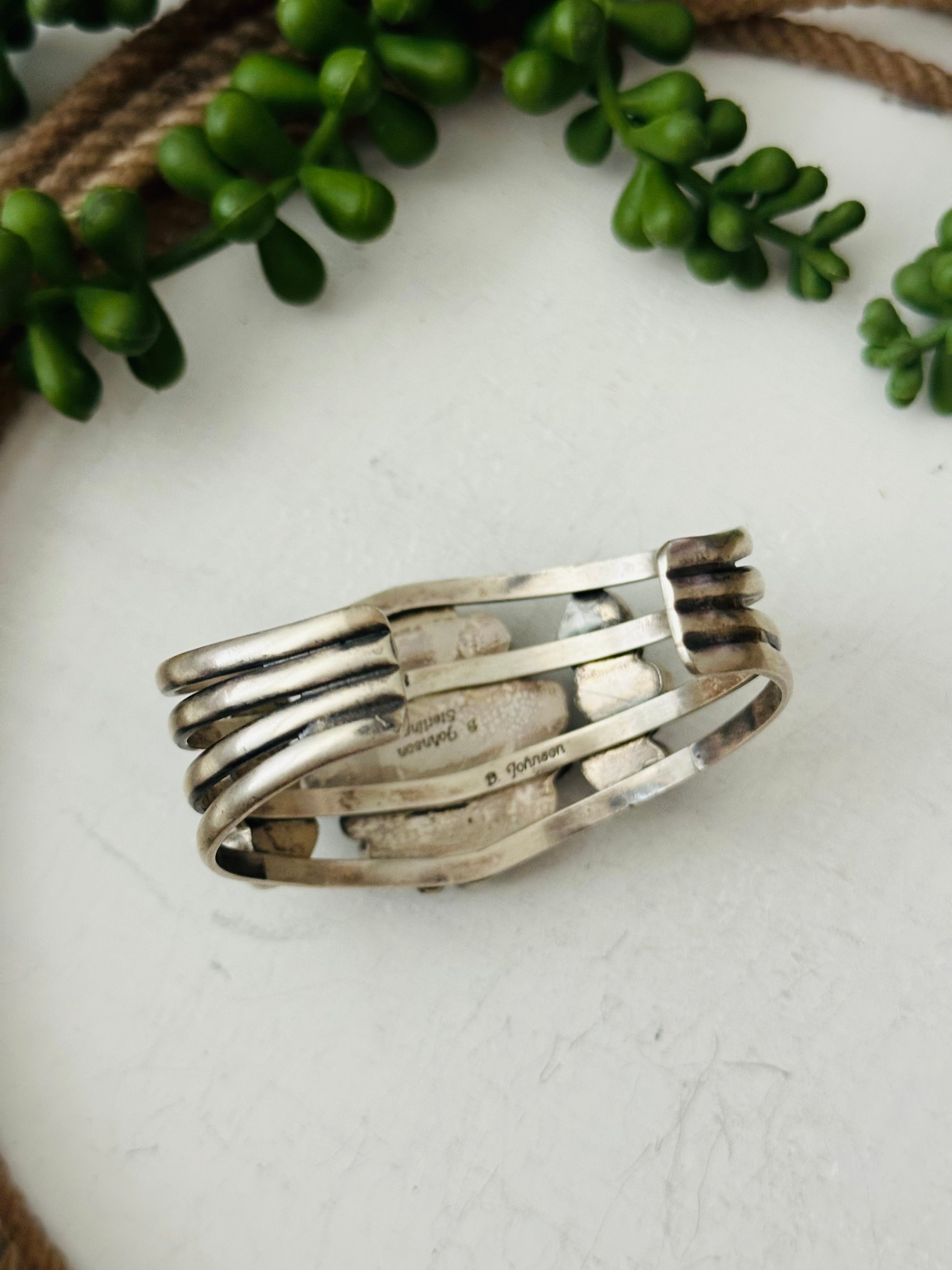 Bobby Johnson Golden Hills Turquoise & Sterling Silver Cuff Bracelet. It measures 1 1/2 inches wide with an inside circumference of 5 5/8 inches and a gap 1 inch. Signed by the artist and stamped sterling silver.