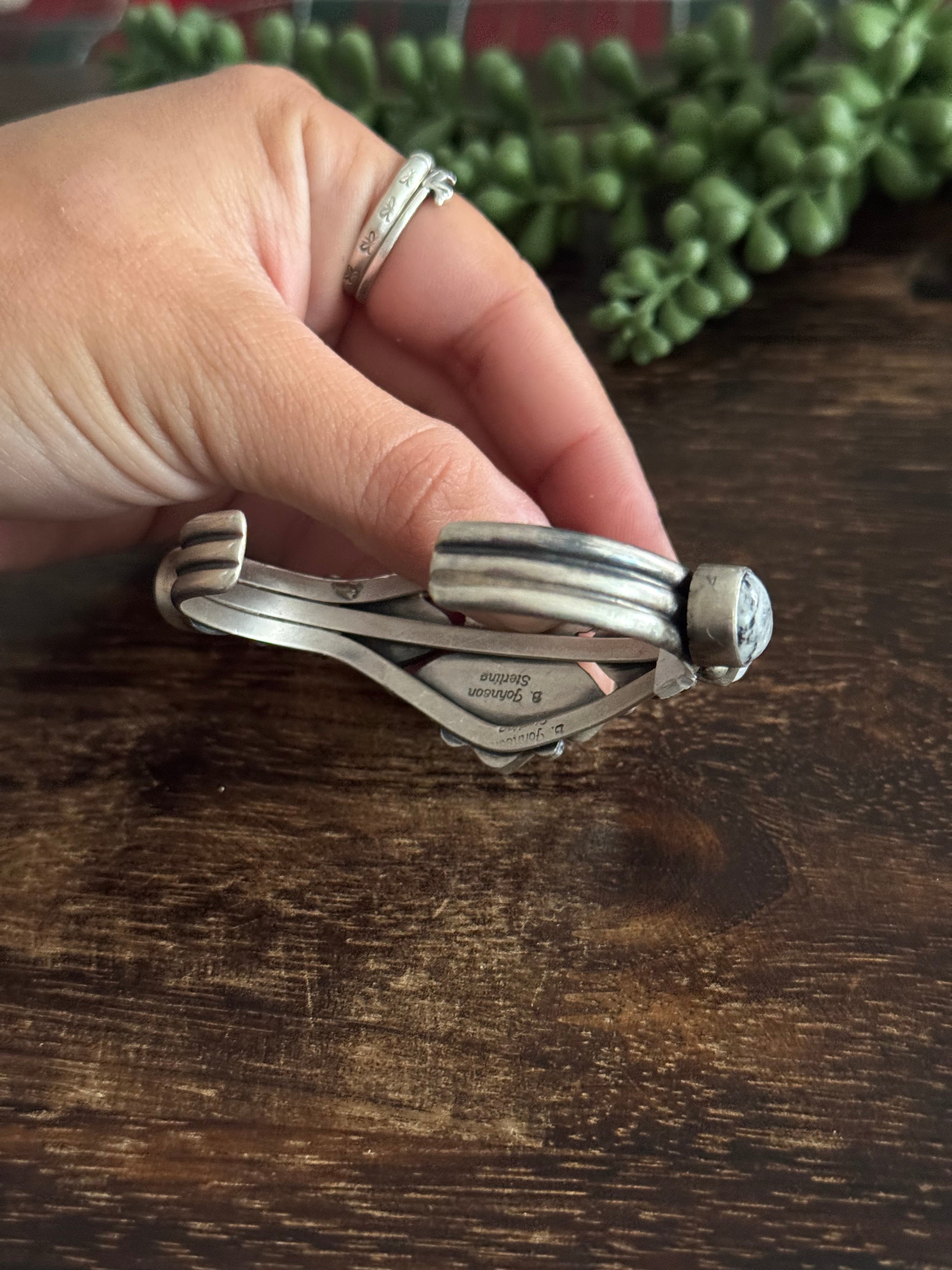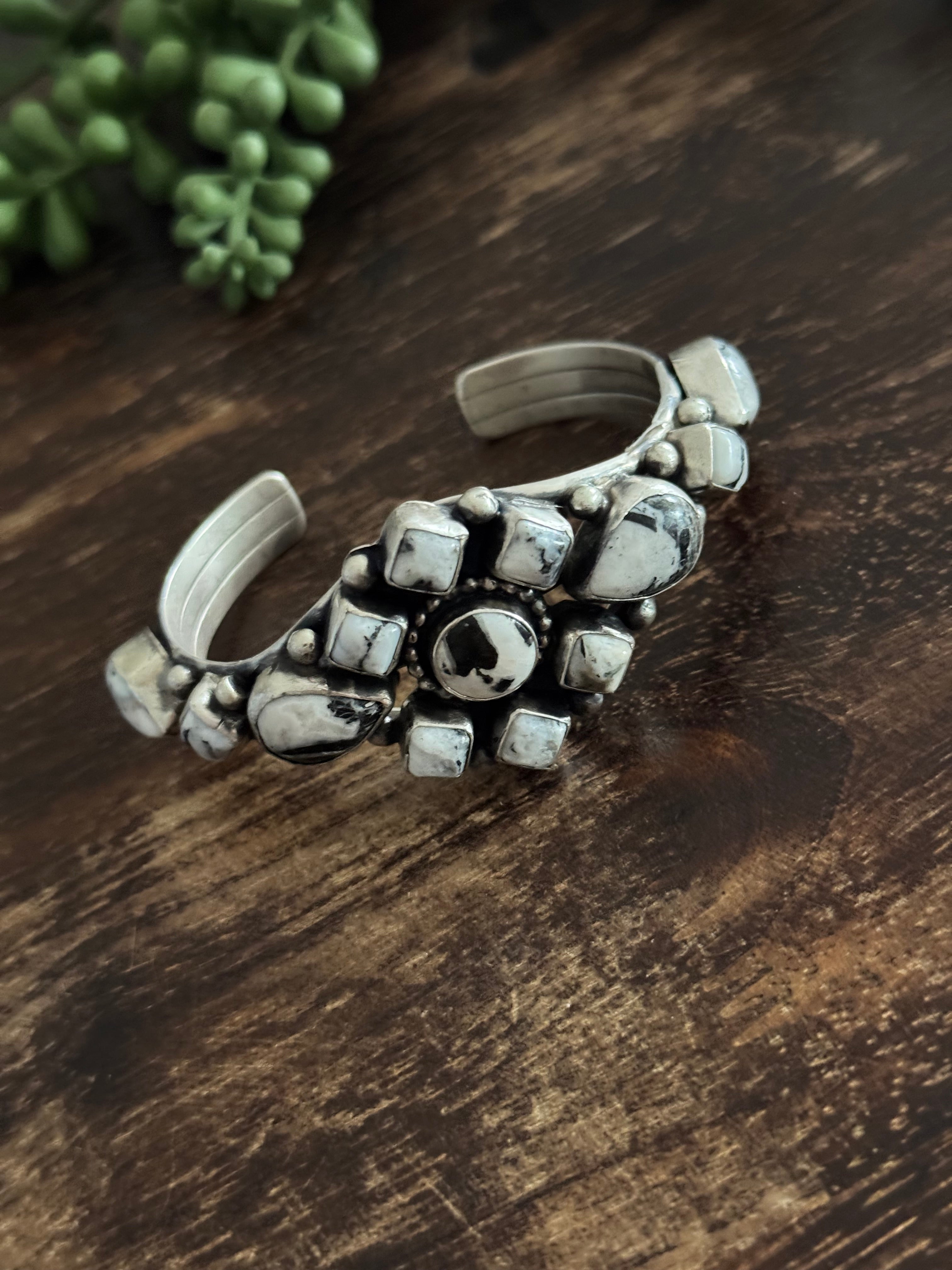 Bobby Johnson White Buffalo & Sterling Silver Cluster Cuff Bracelet. It measures 1 1/4 inches wide with an inside circumference of 5 5/8 inches and a gap of 1 inch. Signed by the artist and stamped sterling silver.