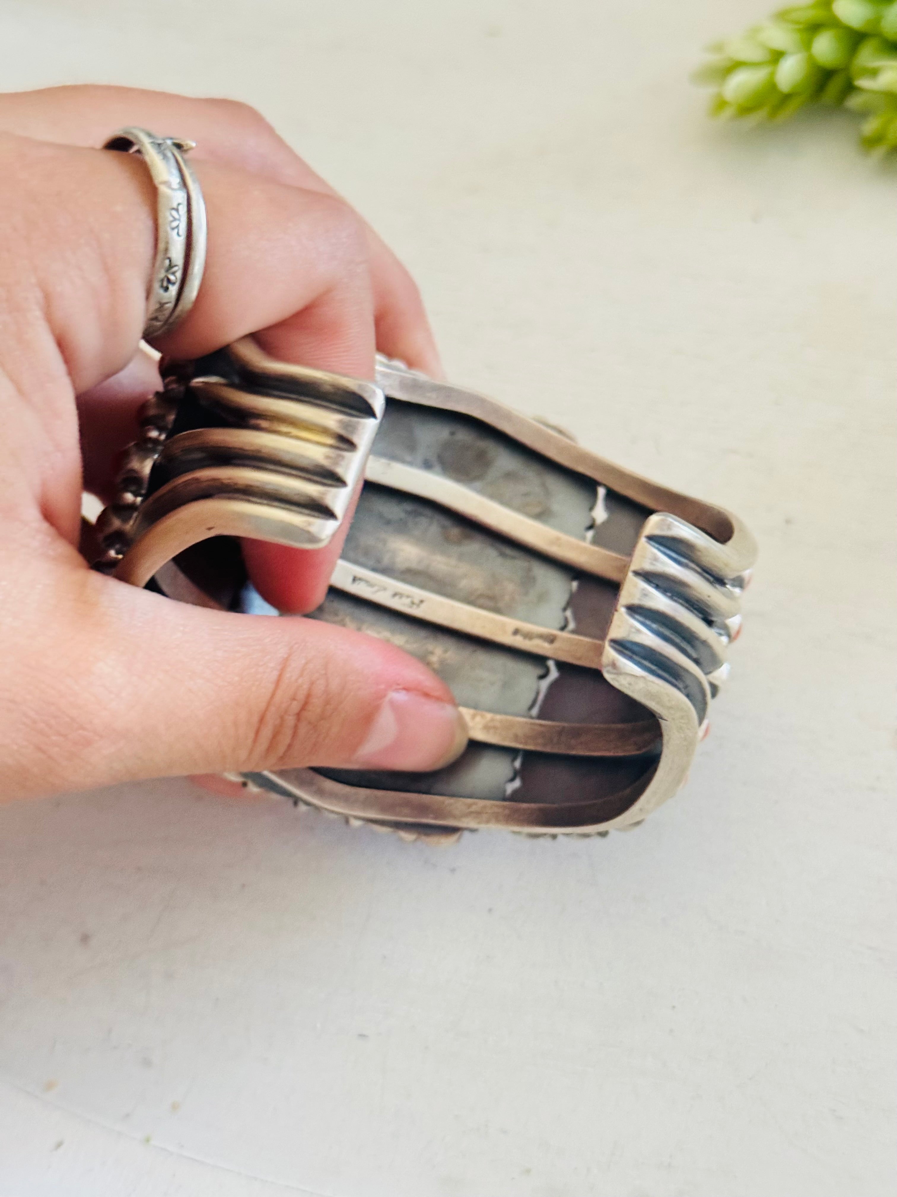 Kirk Smith Multi Stone & Sterling Silver Cluster Cuff Bracelet. It measures 2 3/8 inches wide with an inside circumference of 5 1/2 inches and a gap of 1 1/8 inches. Signed by artist and stamped sterling silver.