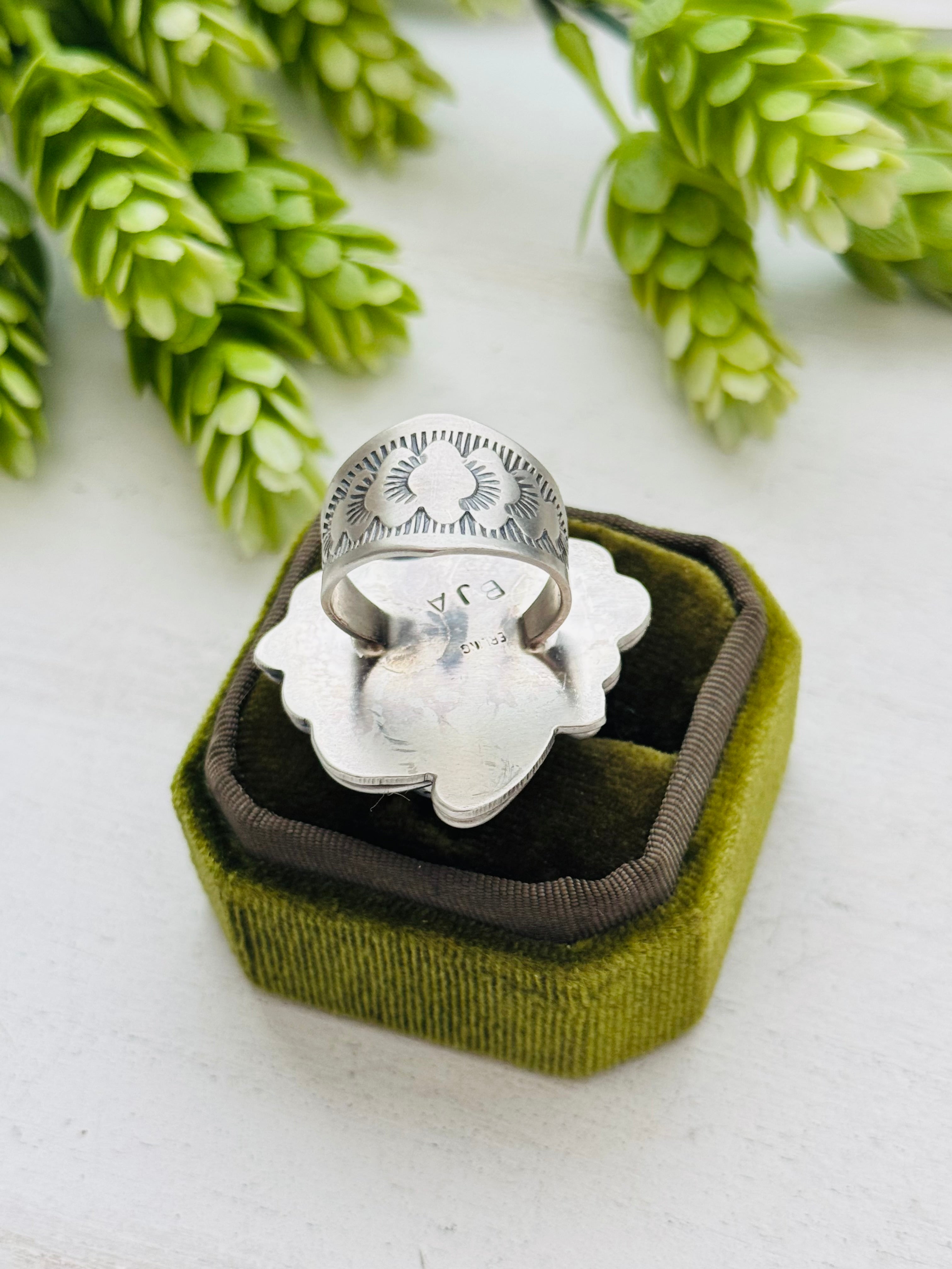 Bobby Johnson Royston Turquoise & Sterling Silver Ring Size 8. It measures 1 1/2 inches long and just over 1 3/8 inches wide. Signed by the artist and stamped sterling silver.