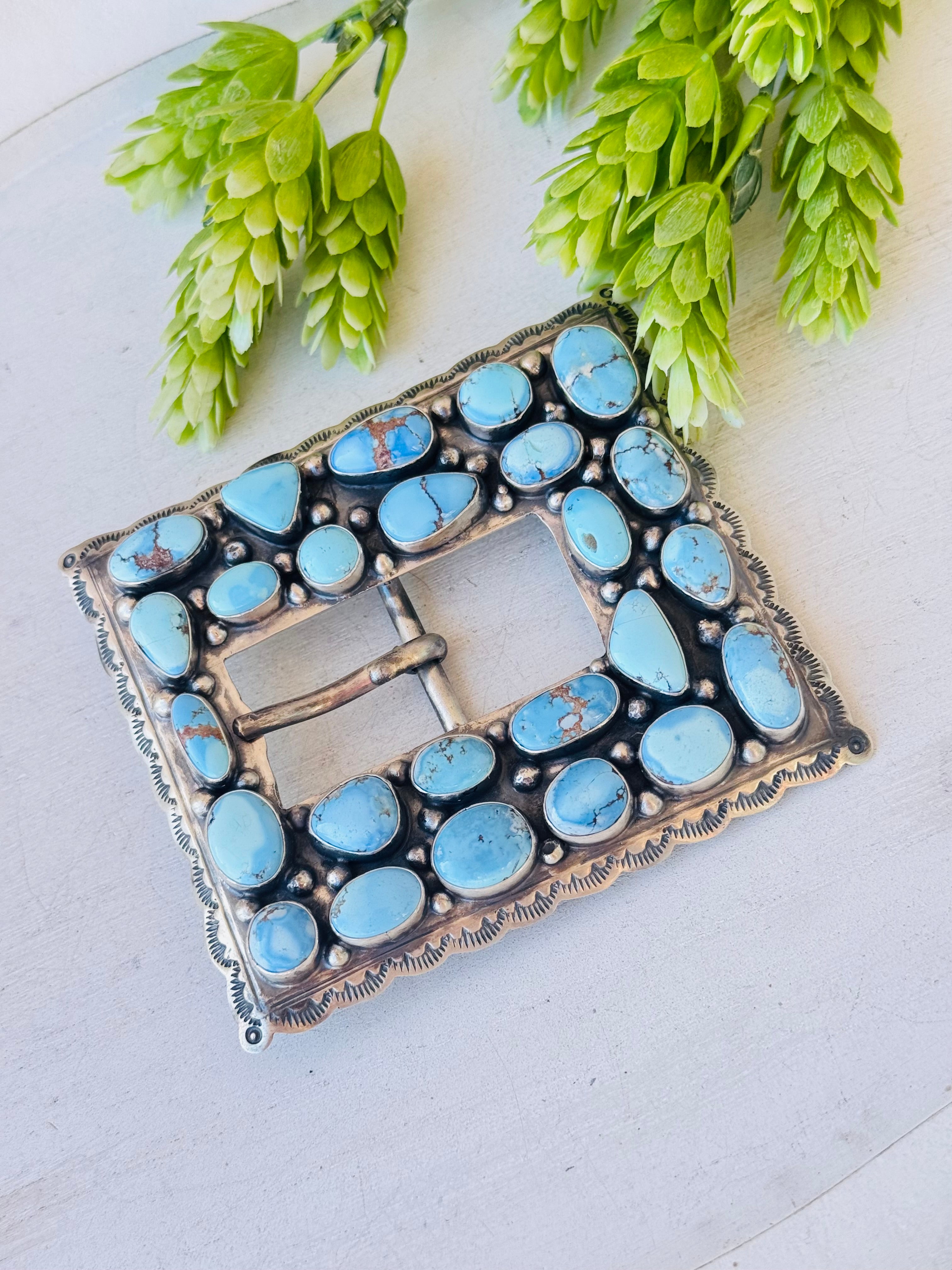 Bobby Johnson Golden Hills Turquoise & Sterling Silver Belt Buckle. It measures 4 1/8 inches long and 3 1/2 inches wide. Signed by the artist and stamped sterling silver.