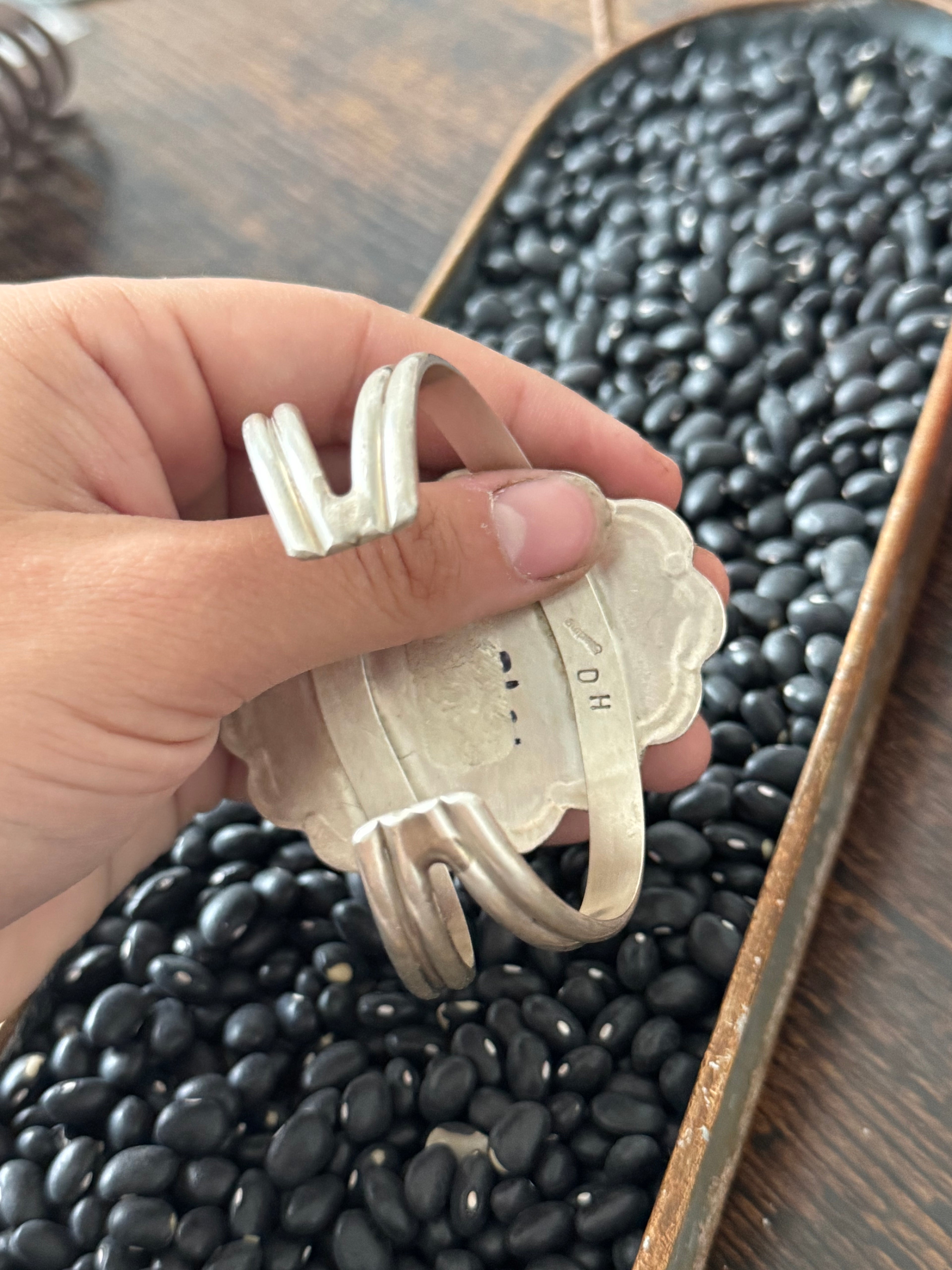 Danny Hinio Royston Turquoise & Sterling Silver Cuff Bracelet. It measures 2 5/8 inches wide with an inside circumference of 5 3/4 inches and a gap of 1 inch. Signed by the artist and stamped sterling silver.
