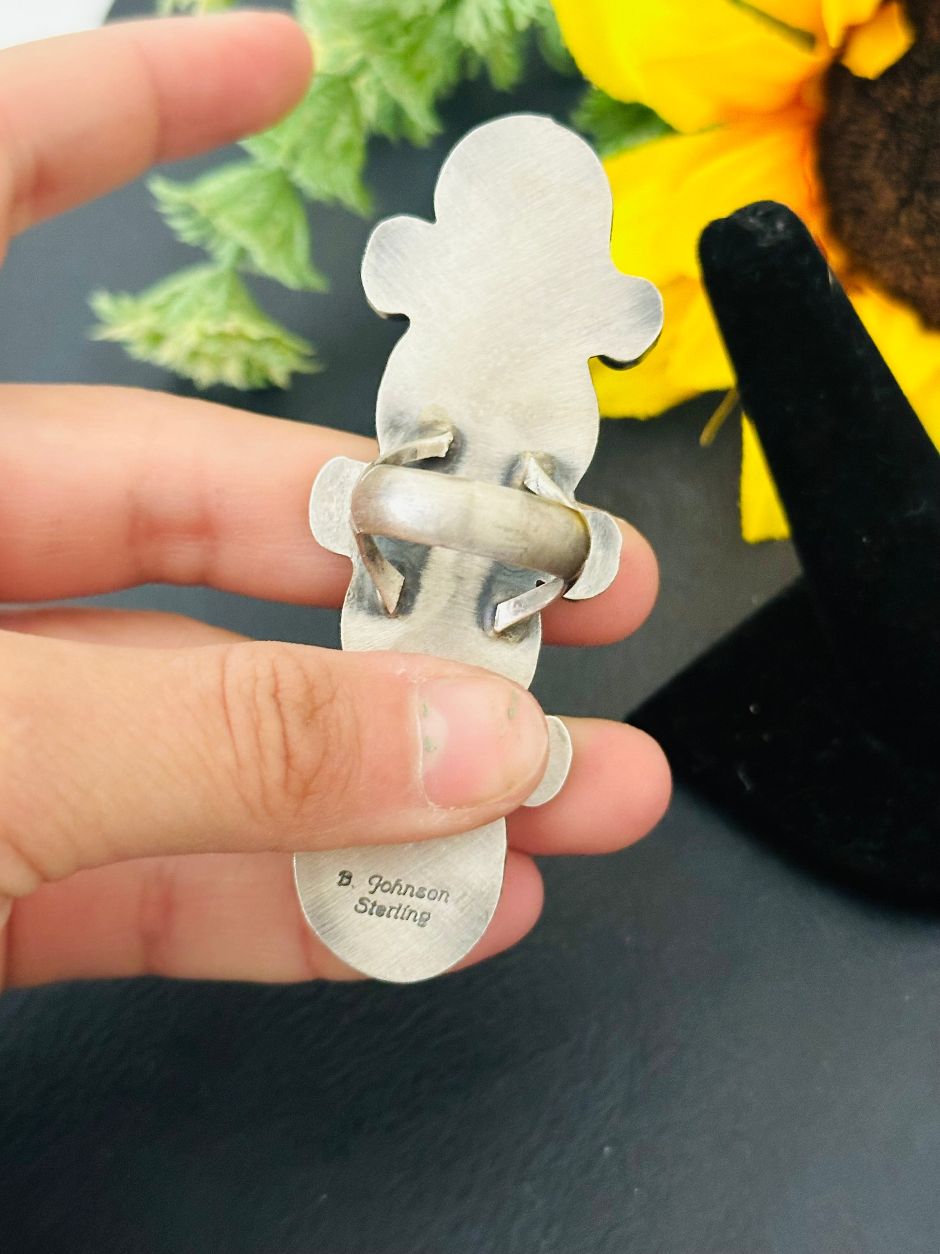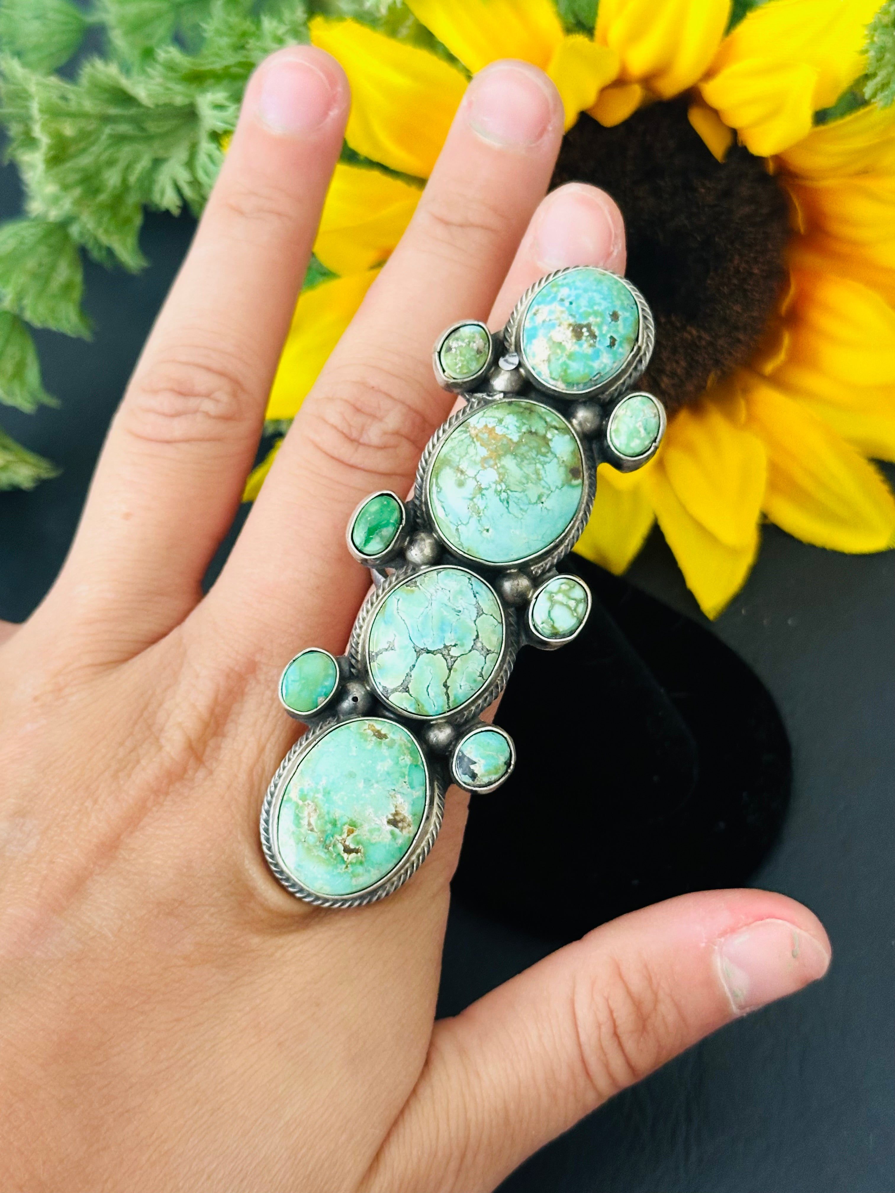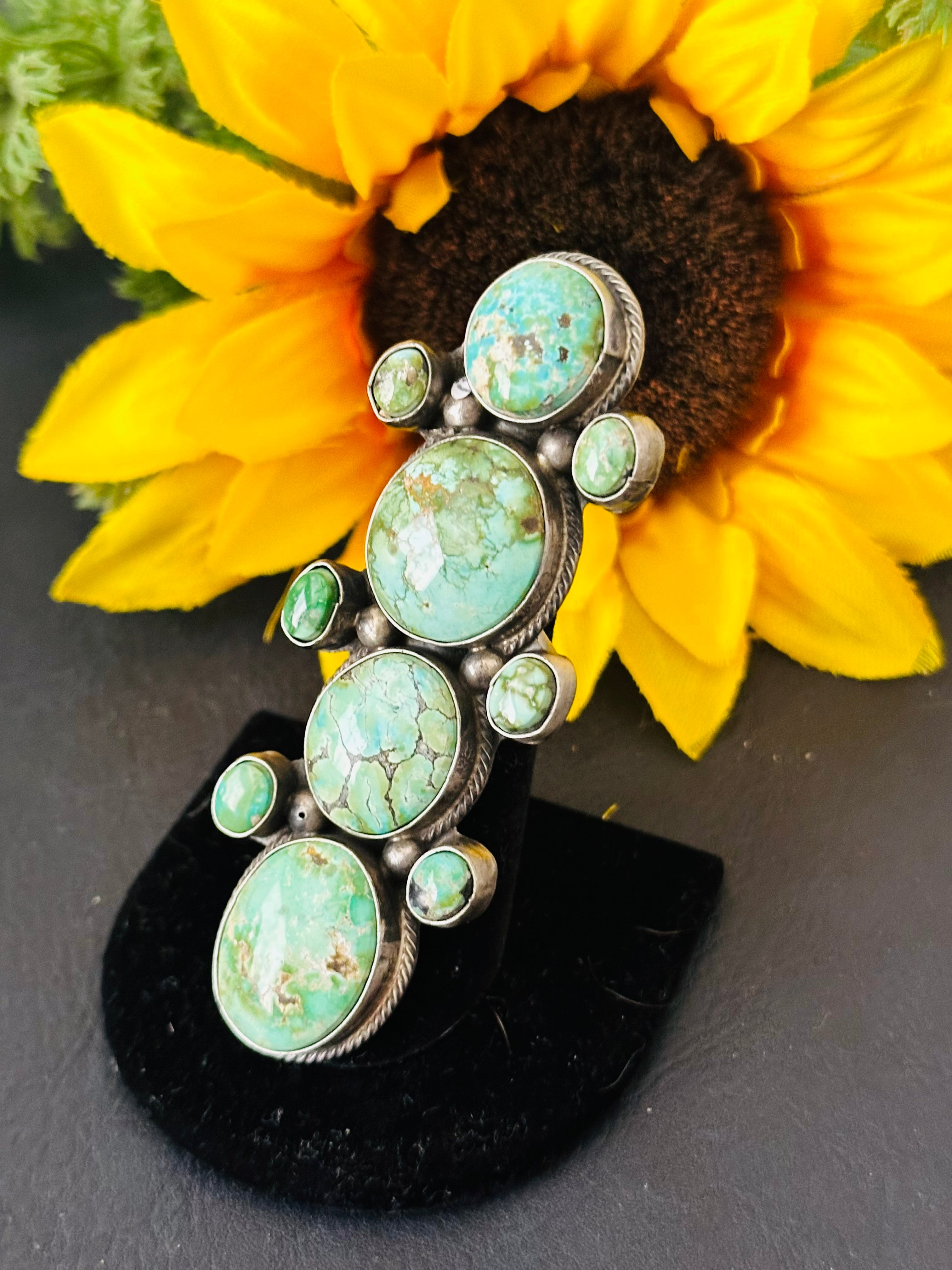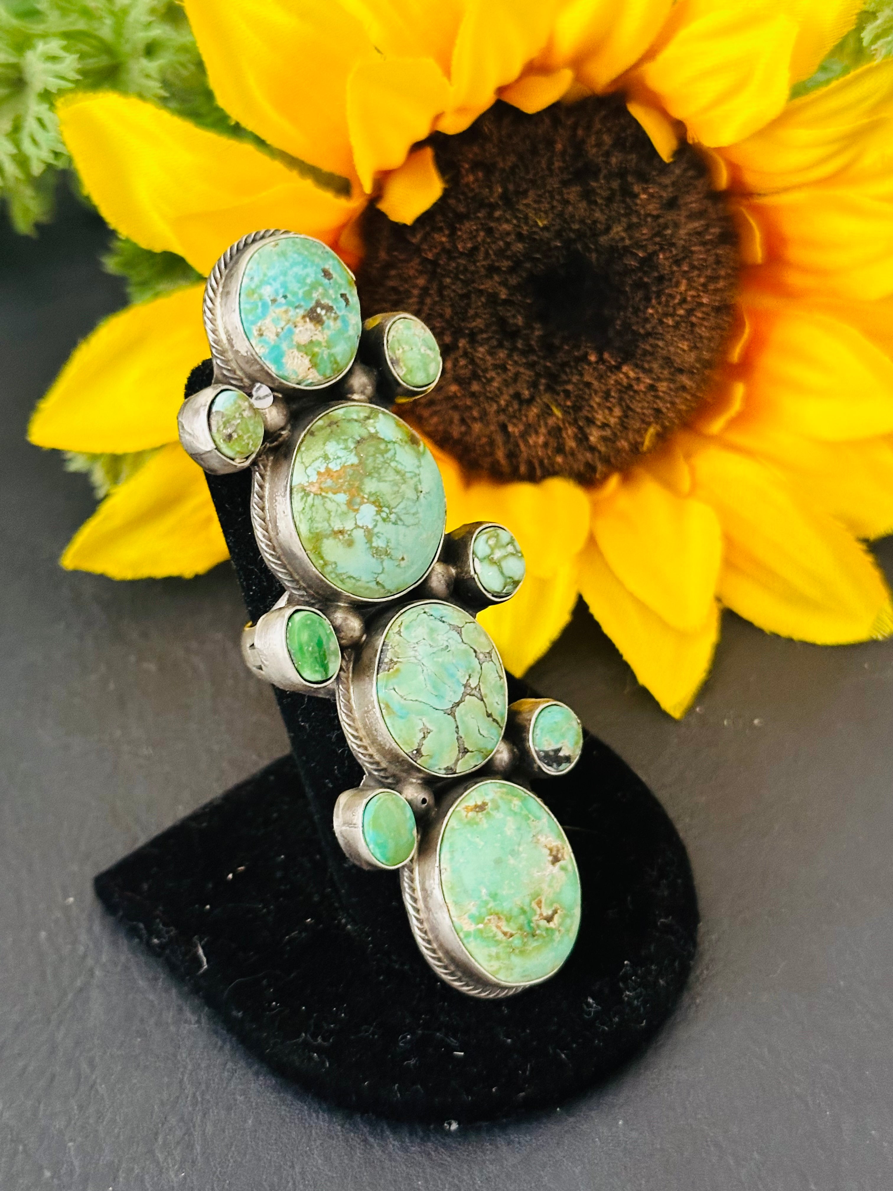 Bobby Johnson Sonoran Gold Turquoise & Sterling Silver Cluster Ring Size 6.5. It measures 3 1/8 inches long and 1 1/8 inches wide. Signed by artist and stamped sterling silver.