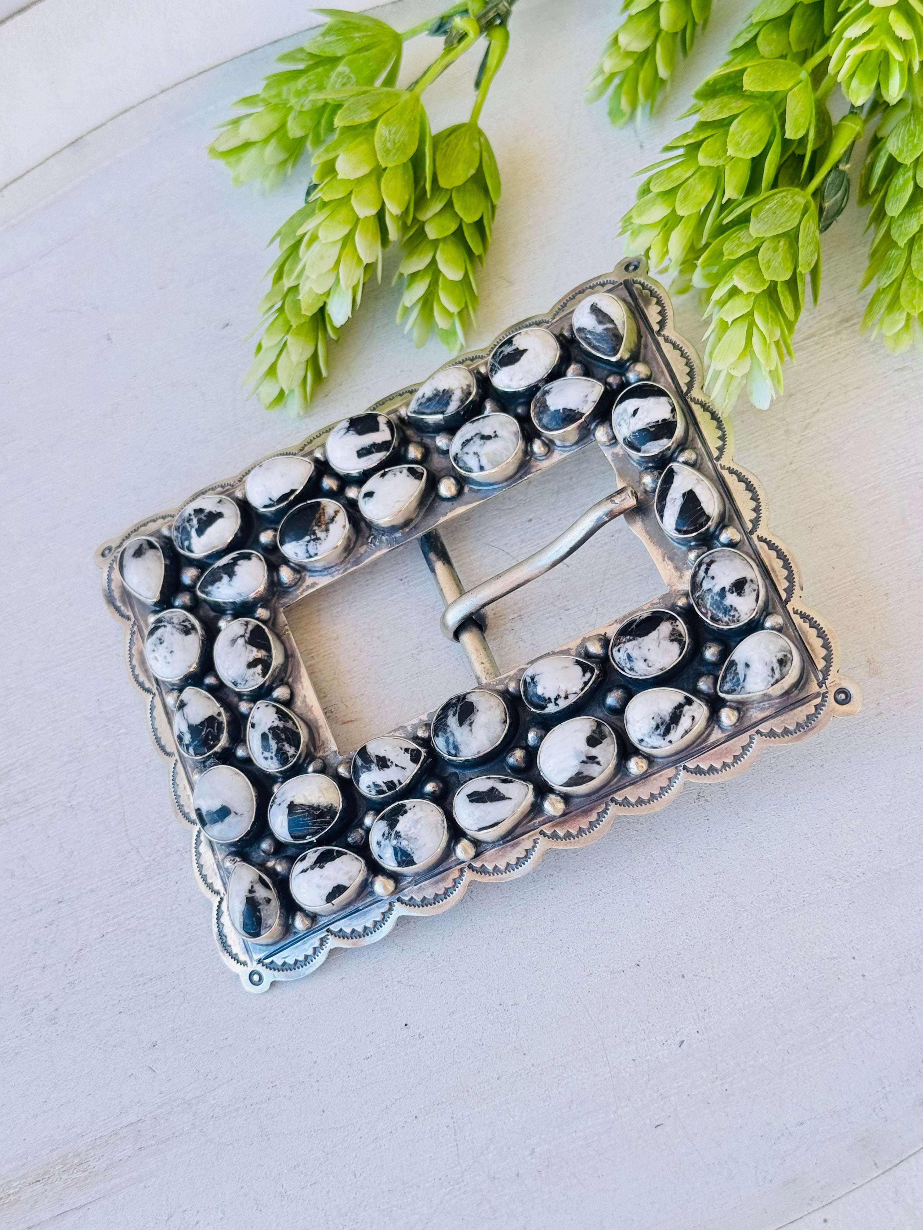 Bobby Johnson White Buffalo & Sterling Silver Belt Buckle. It measures 4 3/8 inches long and 3 5/8 inches wide. Signed by the artist and stamped sterling silver.