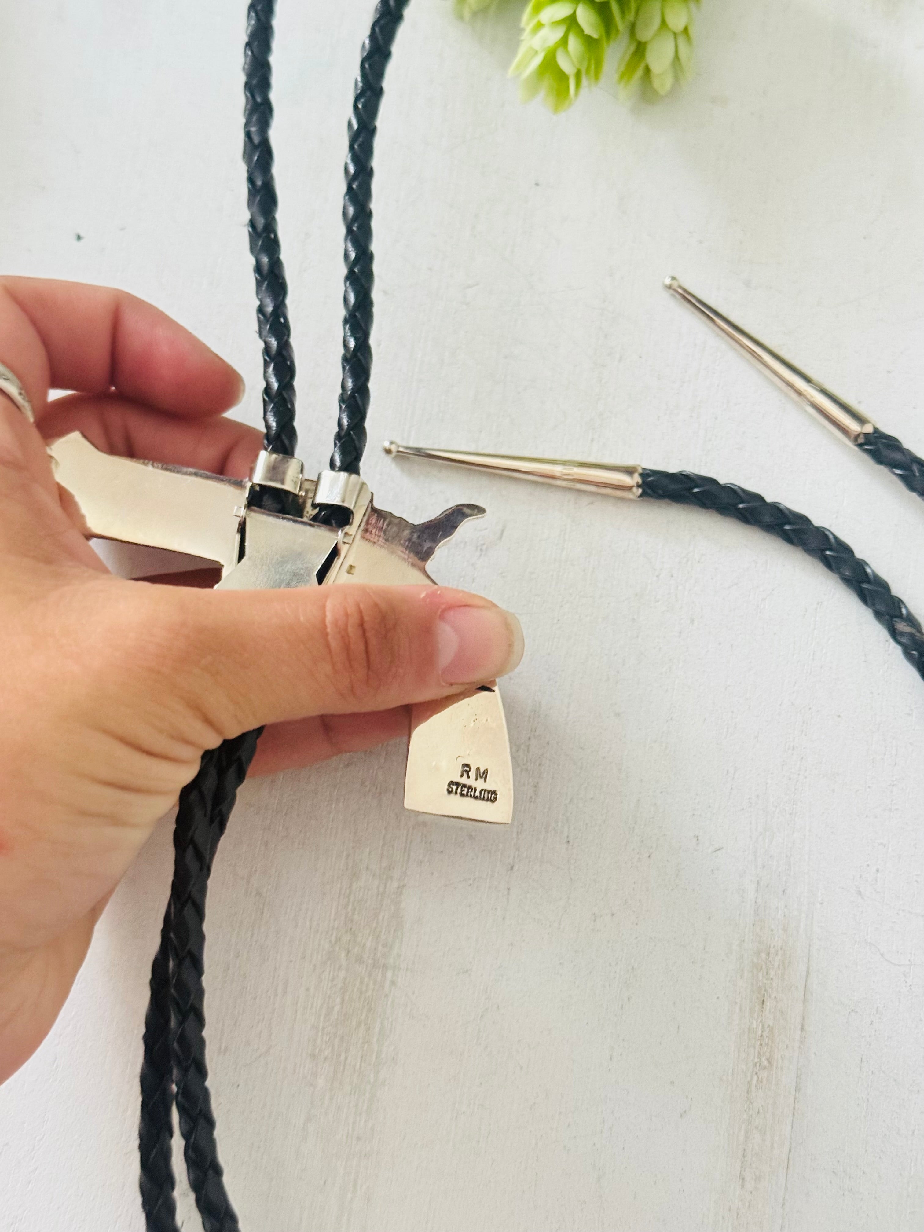 Bobby Mannelito Wild Horse & Sterling Silver Pistol Inlay Bolo Tie. It measures 36 1/2 inches long while the setting measures 2 inches long and 3 3/8 inches wide.