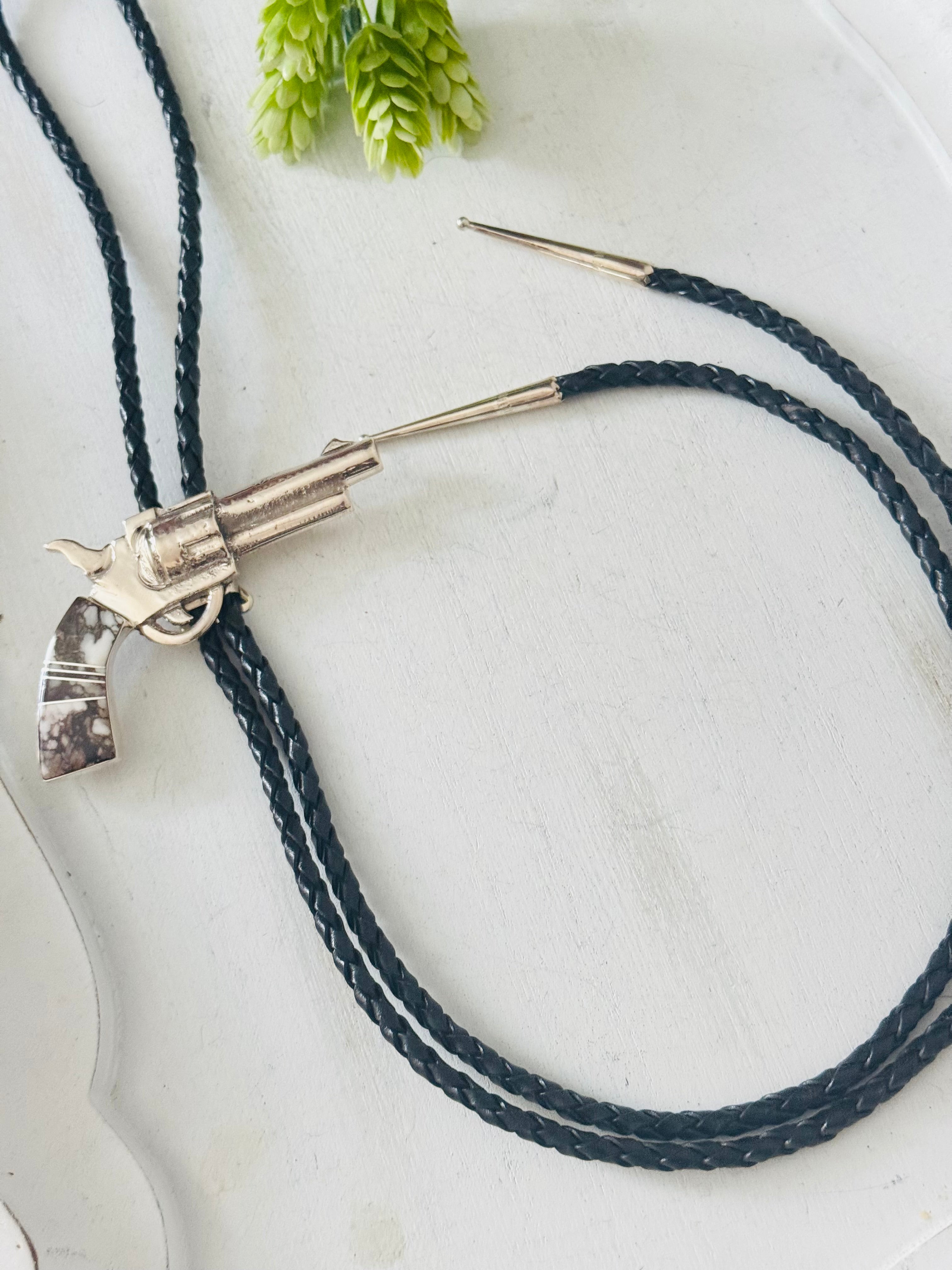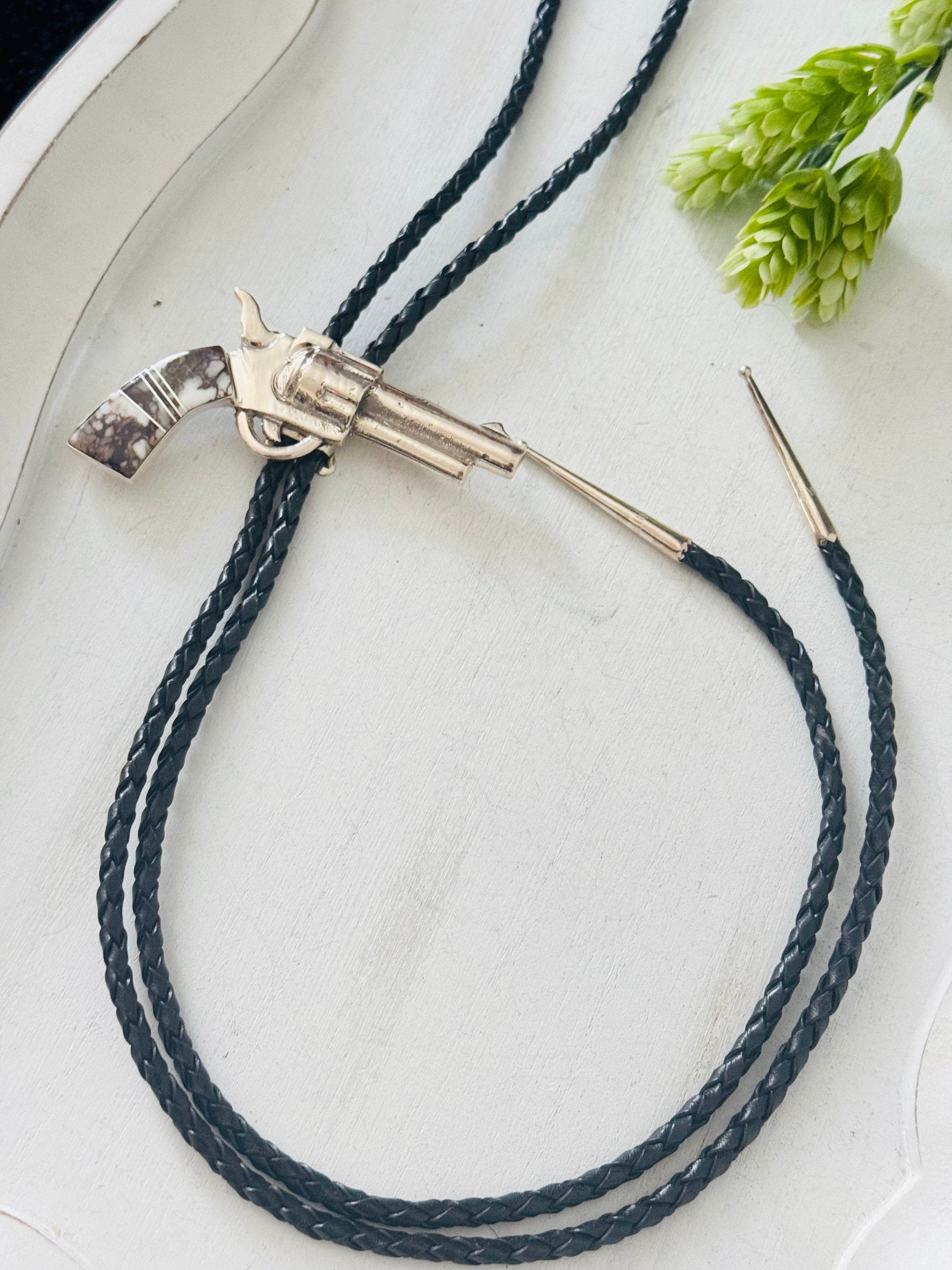 Bobby Mannelito Wild Horse & Sterling Silver Pistol Inlay Bolo Tie