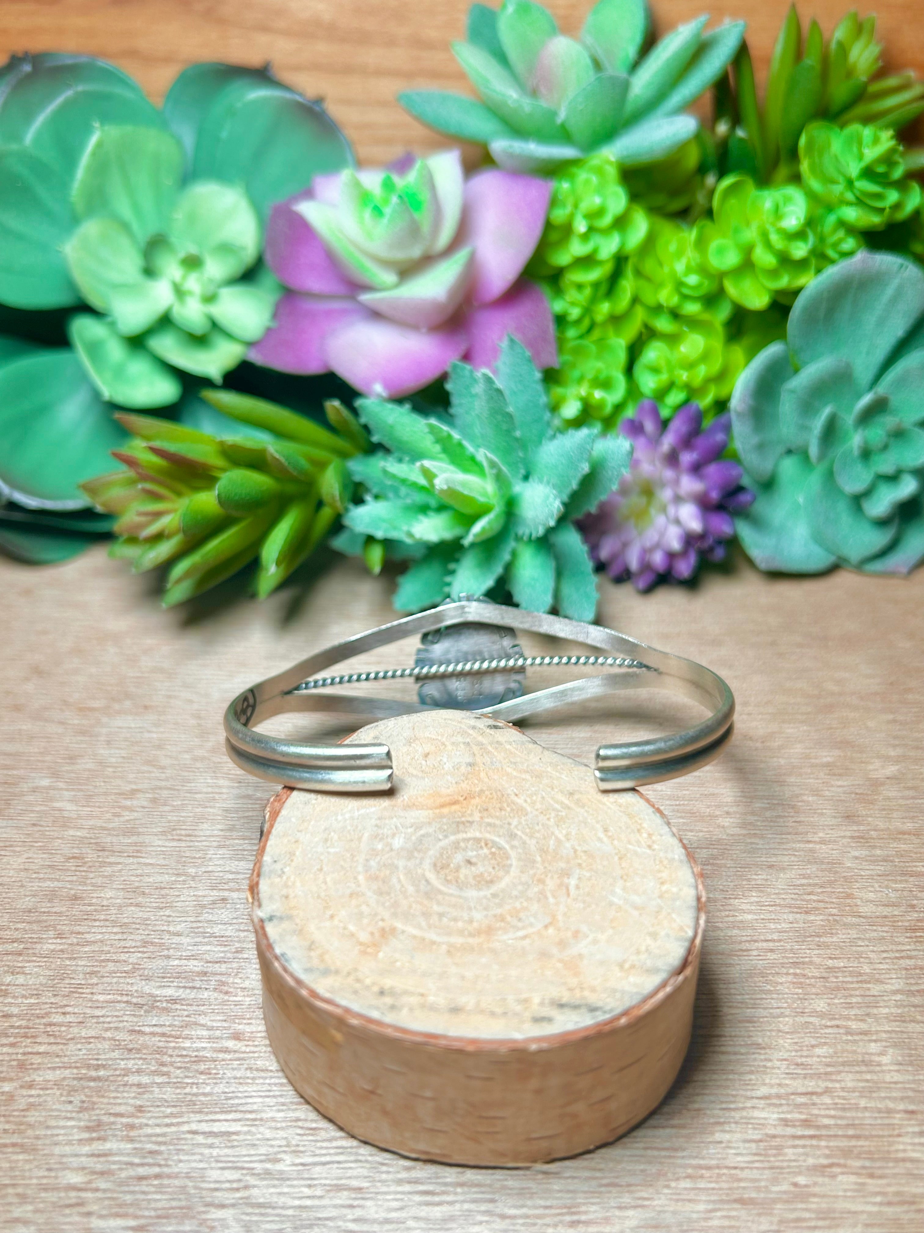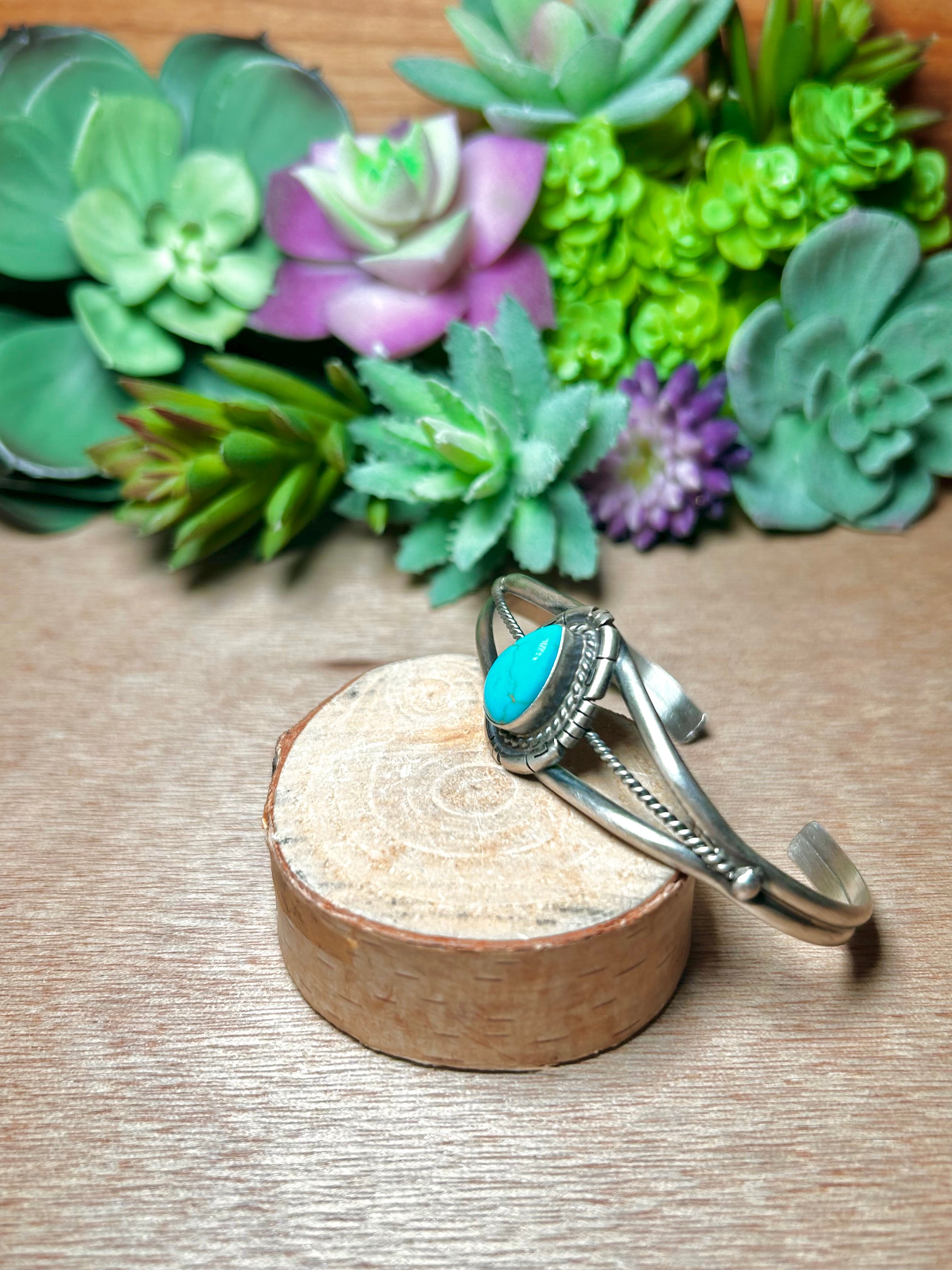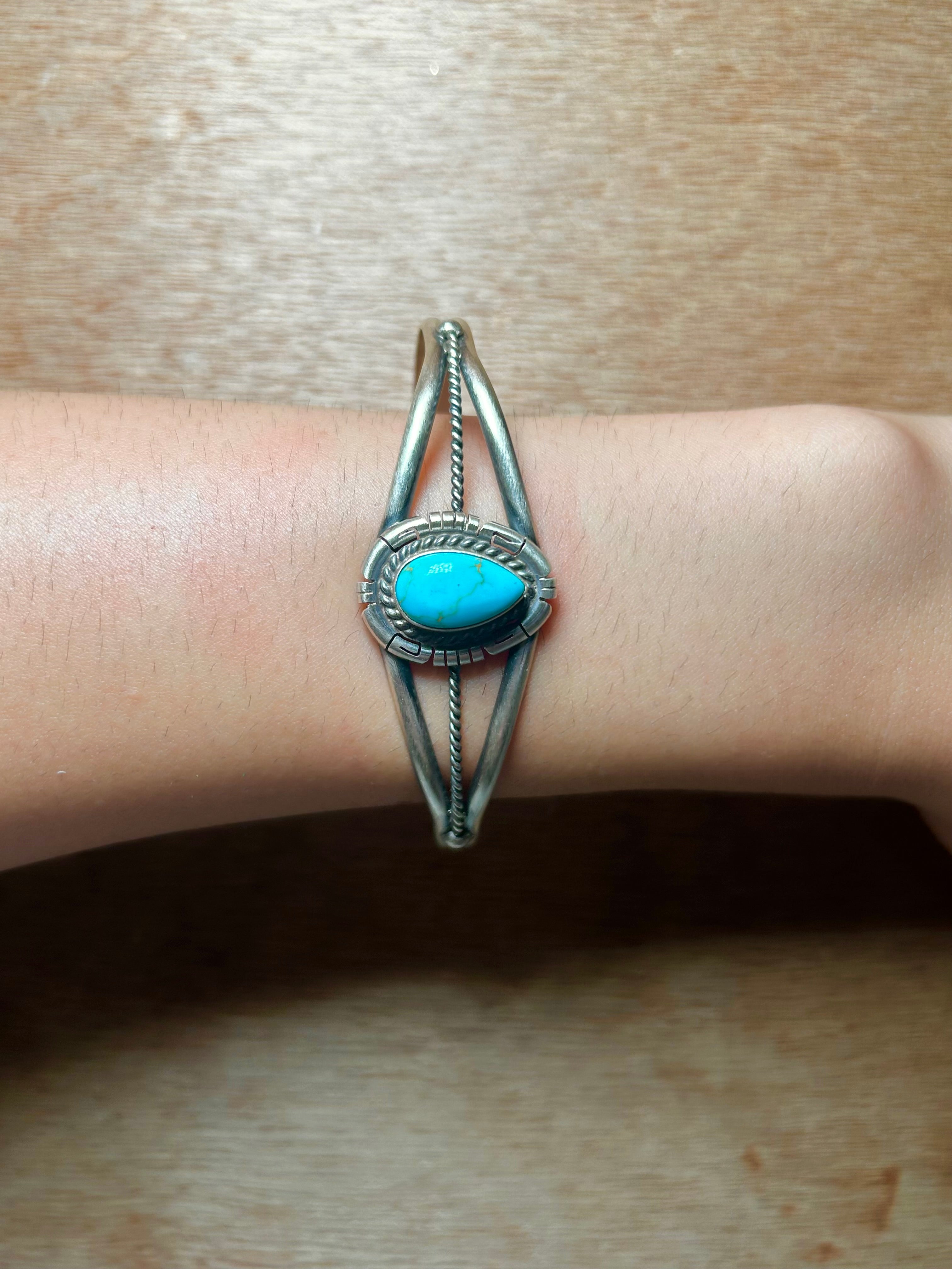 Dave Skeets Kingman Turquoise & Sterling Silver Cuff Bracelet. It measures 7/8 of an inch wide with an inside circumference of 5 5/8 inches and a gap of 1 inch. Signed by the artist and stamped sterling silver.