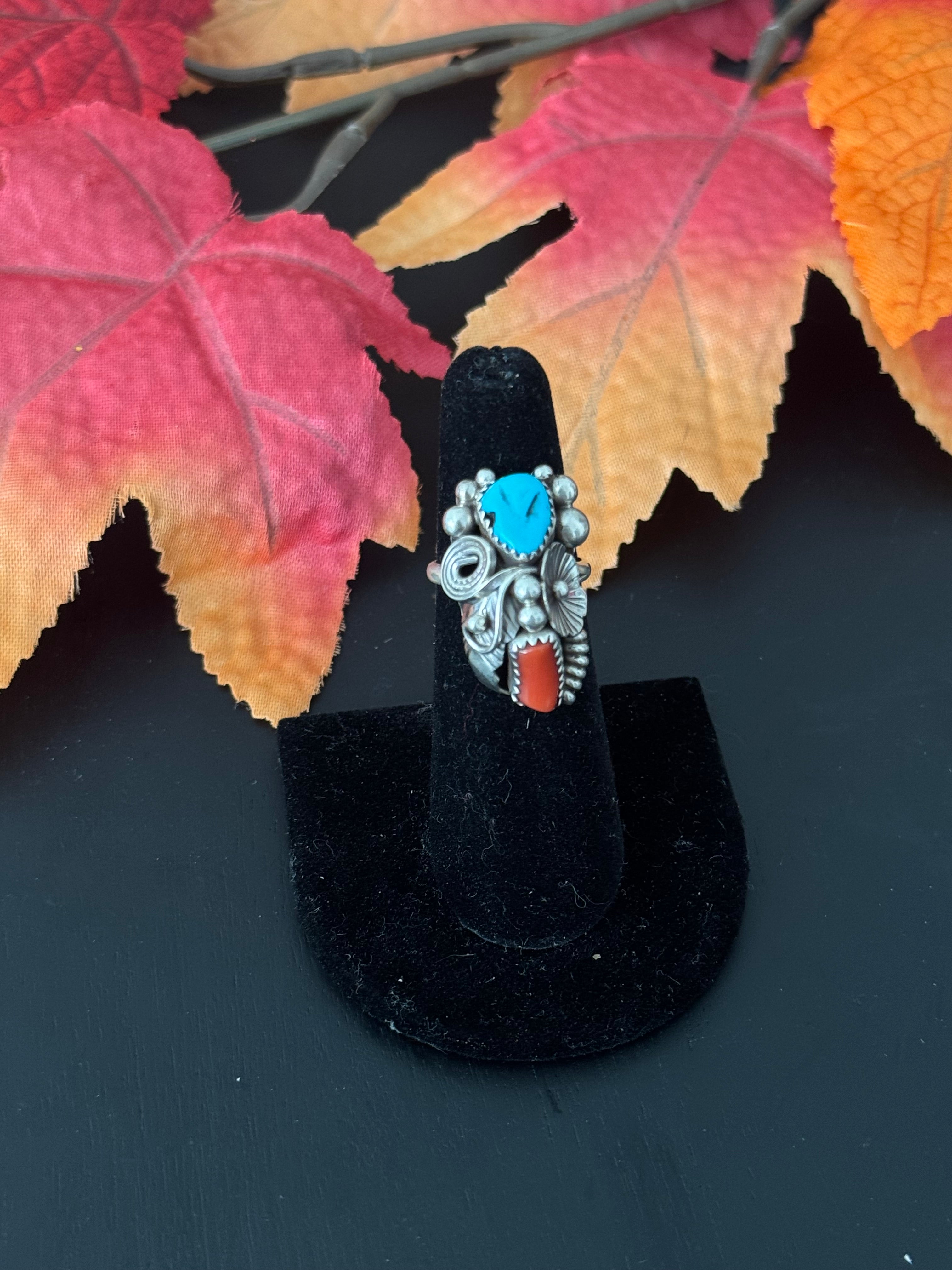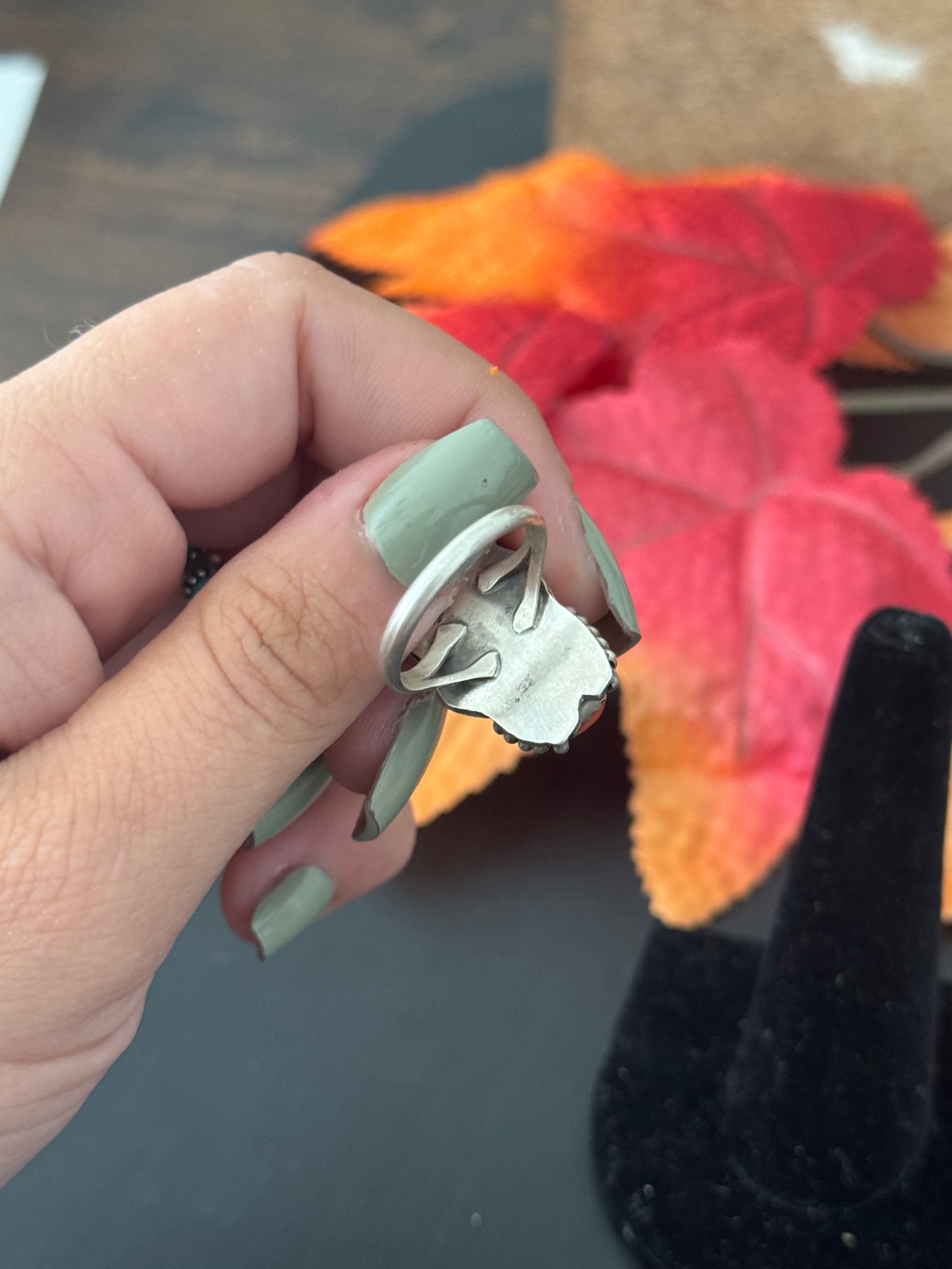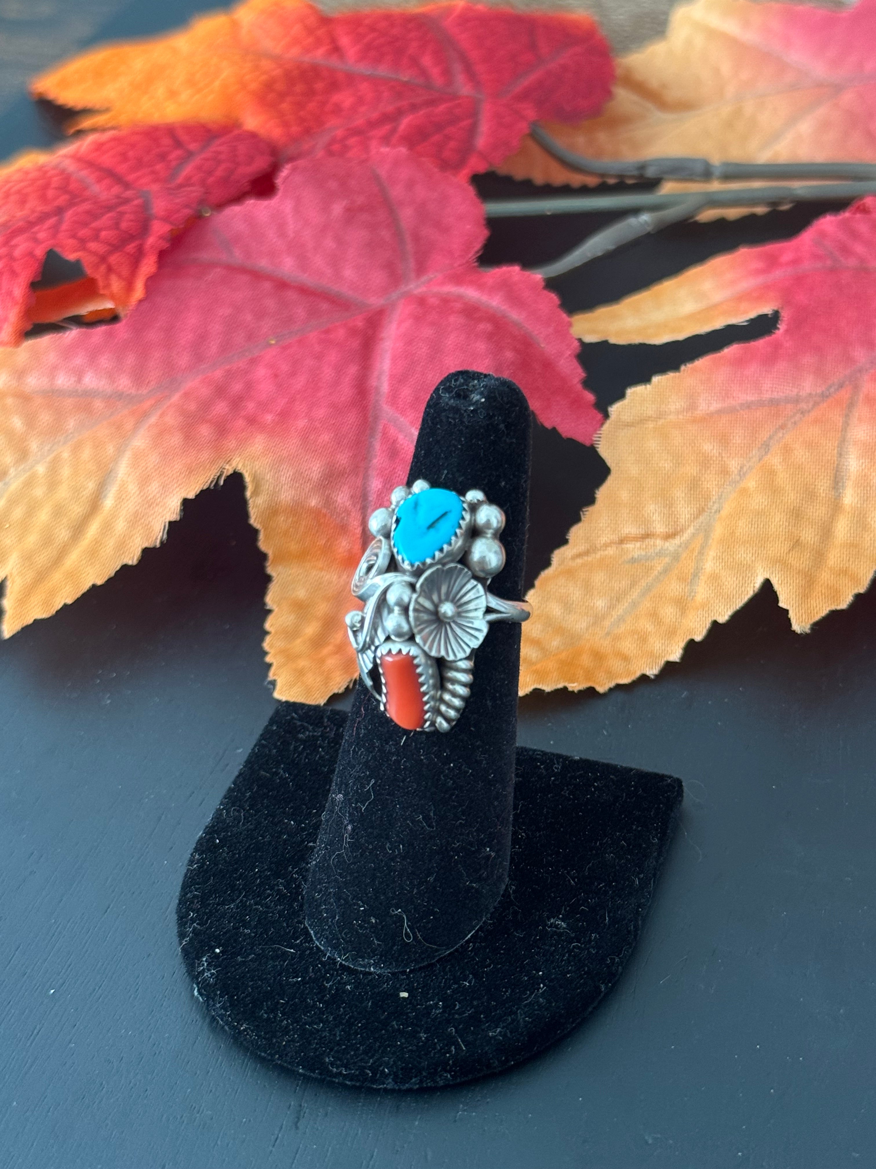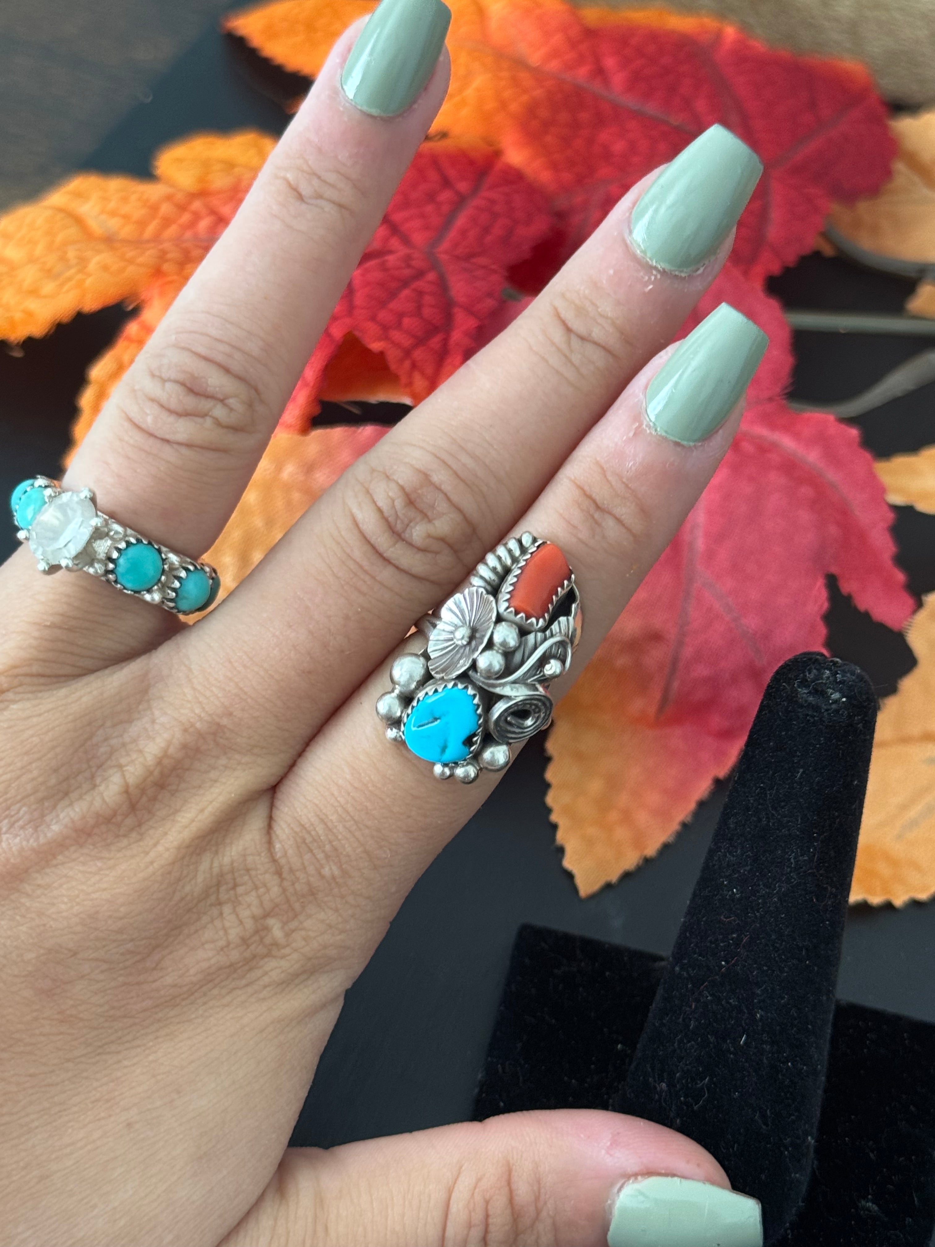 Beautiful ring, Caroline Nez Multi Stone & Sterling Silver Ring Size 5.75. It measures 1 1/8 inches long and 5/8 of an inch wide. Stamped sterling silver and signed by the artist.