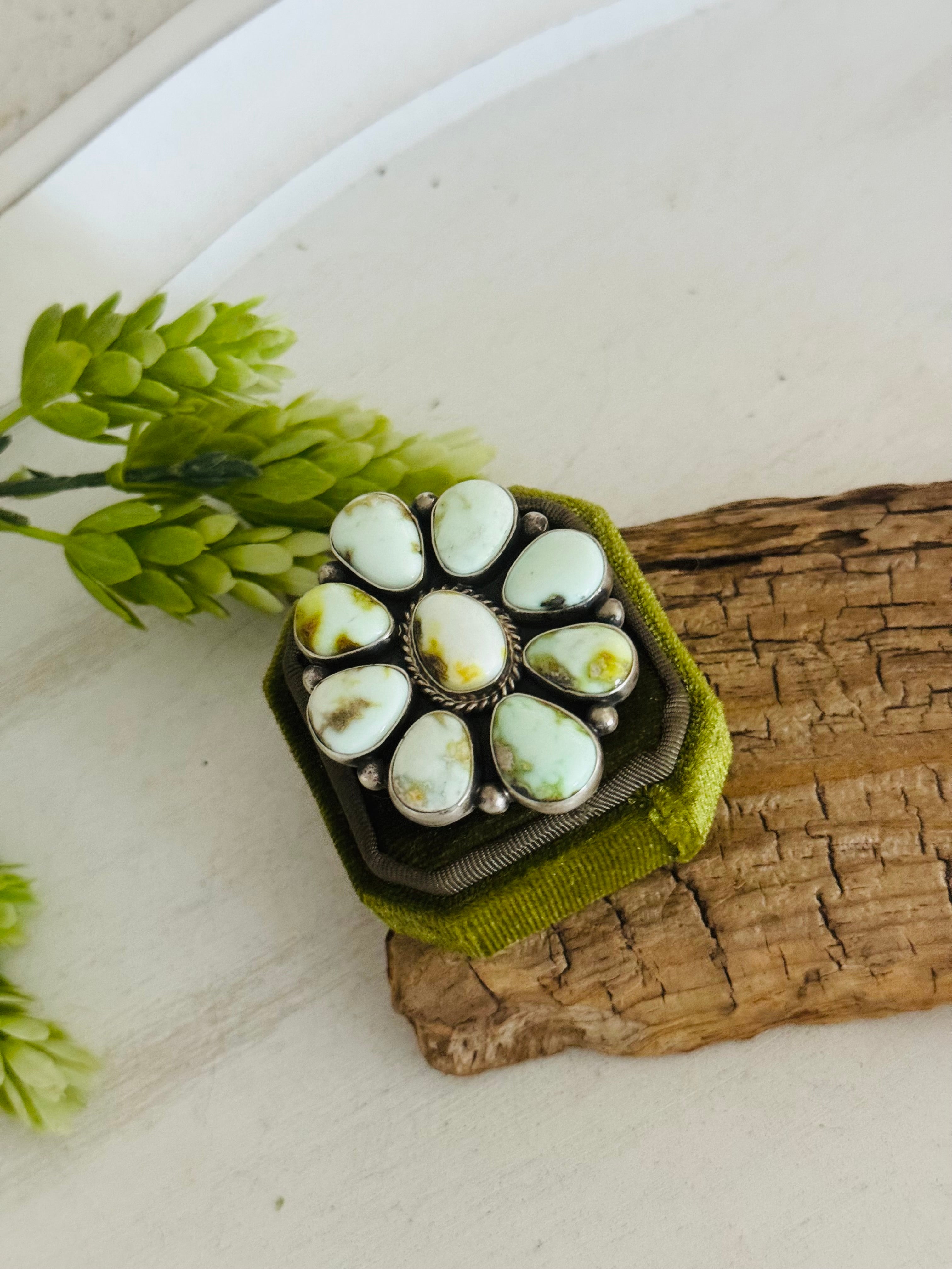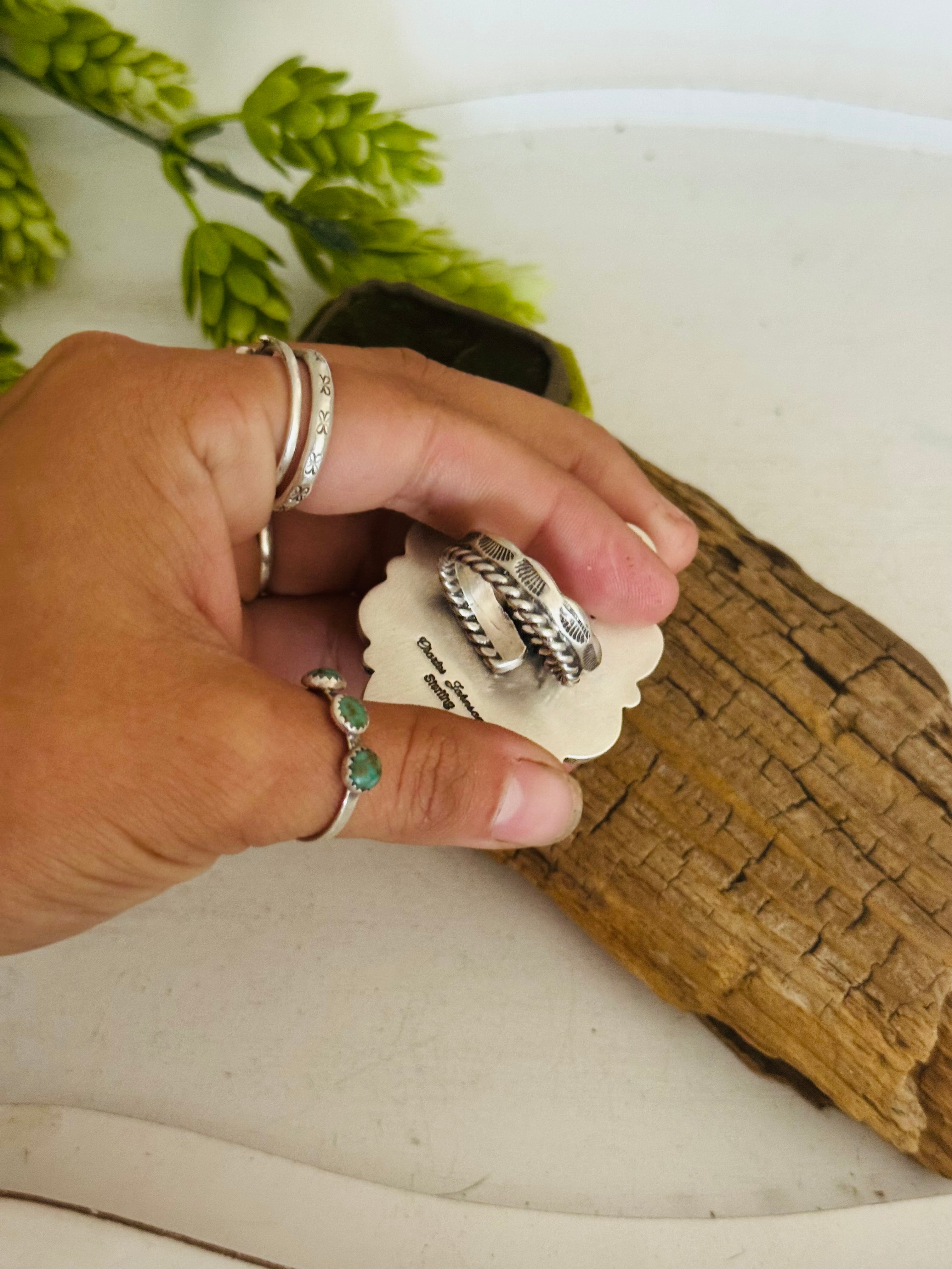 Beautiful ring. Charles Johnson Palomino Variscite & Sterling Silver Adjustable Ring. It measures 1 7/8 inches long and 1 5/8 inches wide. Signed by the artist and stamped sterling silver.