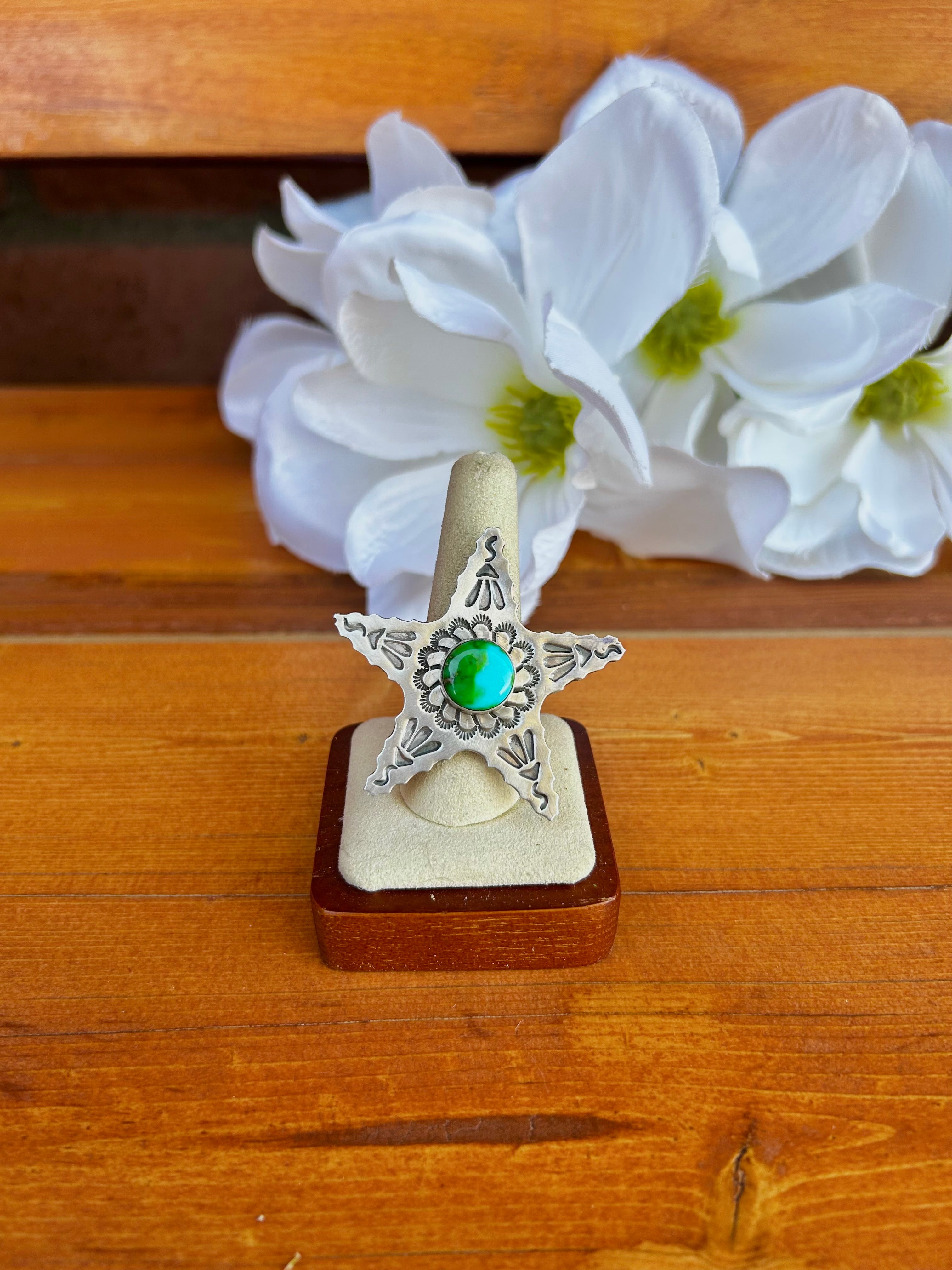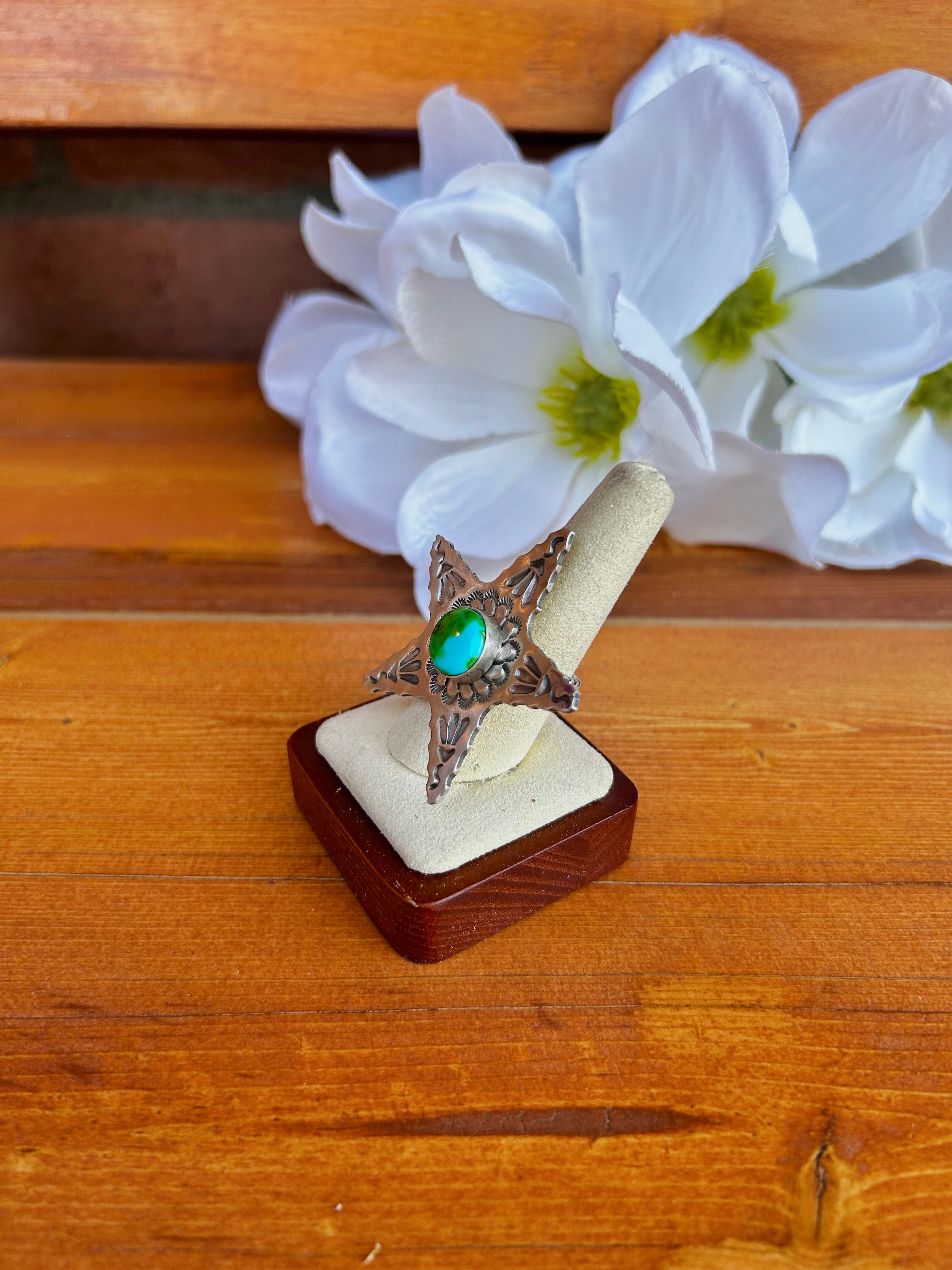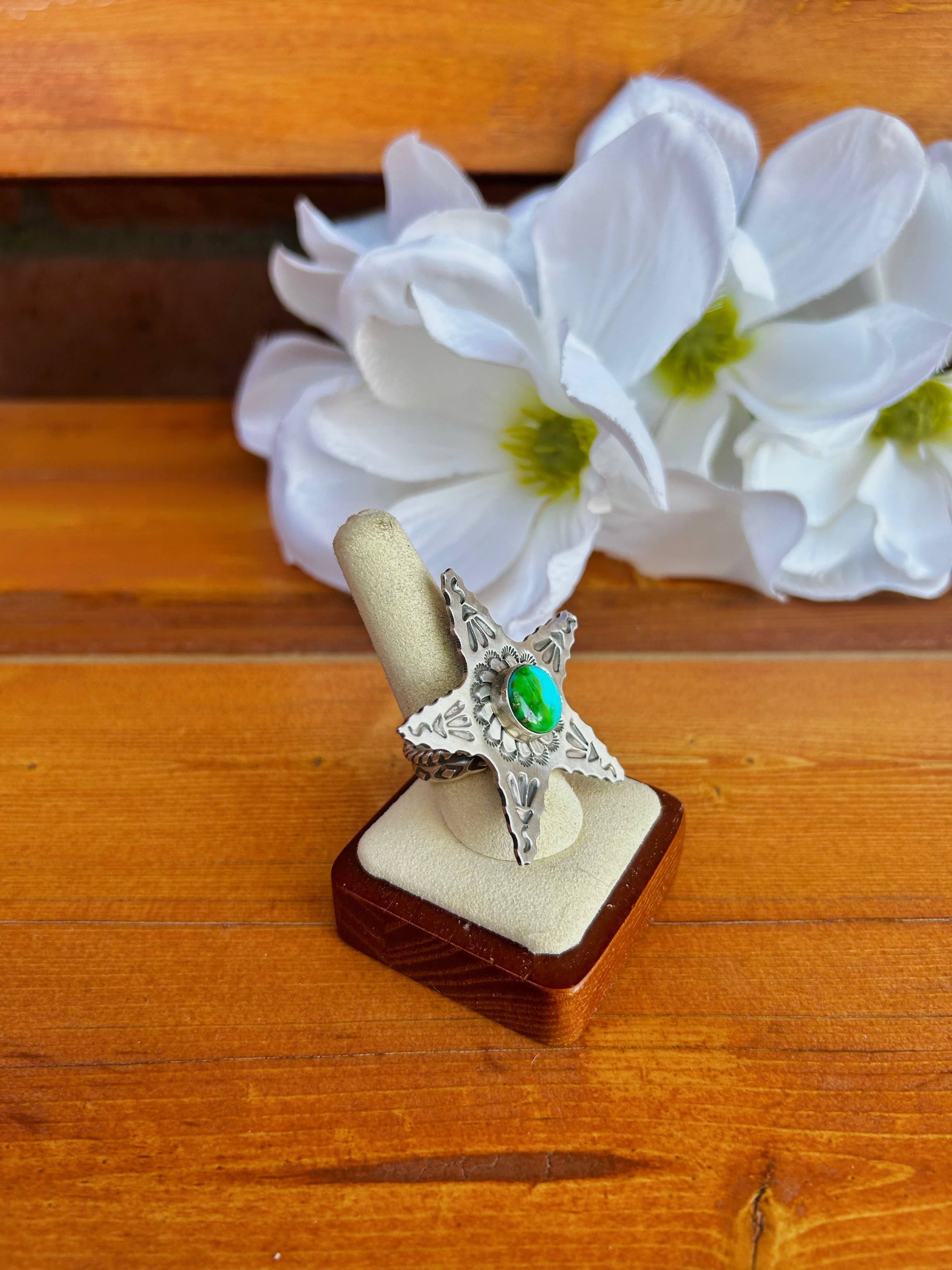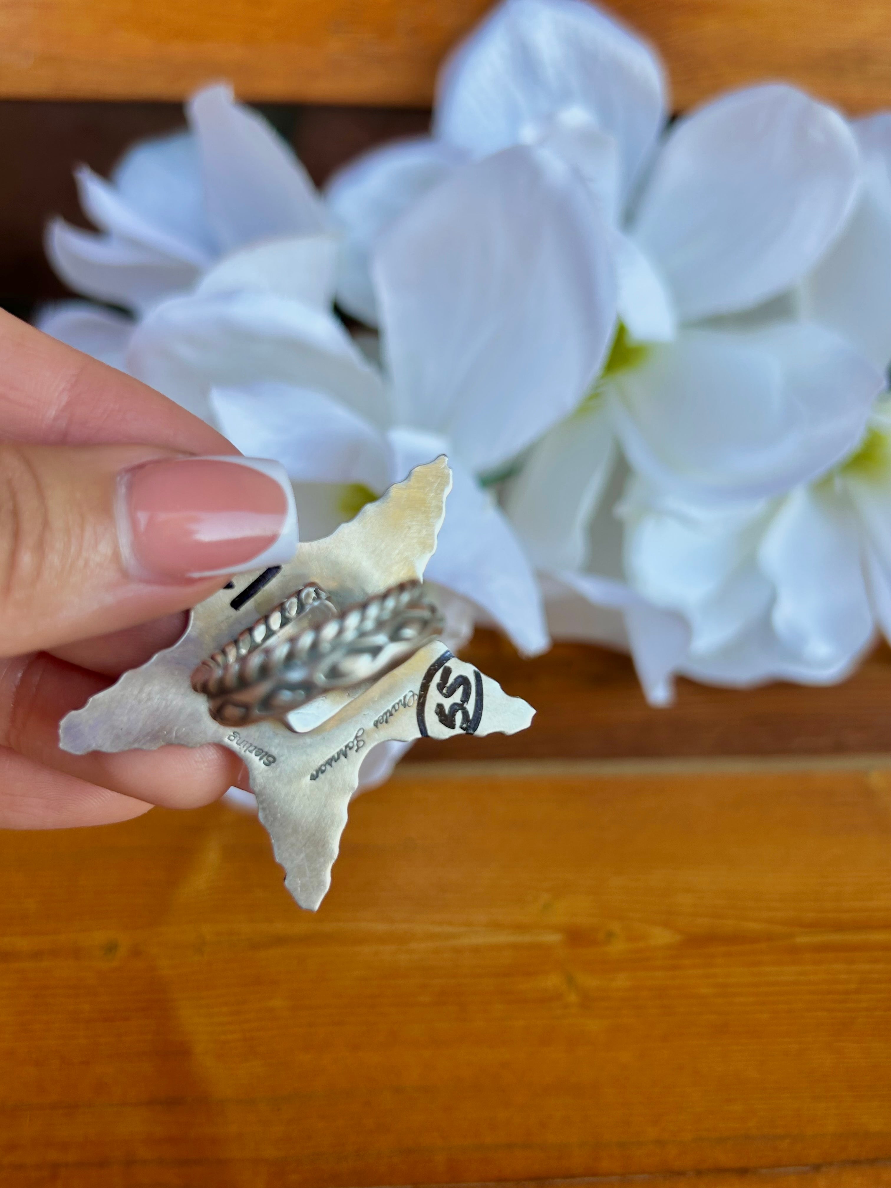 Charles Johnson Sonoran Mountain Turquoise & Sterling Silver Adjustable Ring. It measures 2 inches long and 2 inches wide. Signed by the artist and stamped sterling silver.