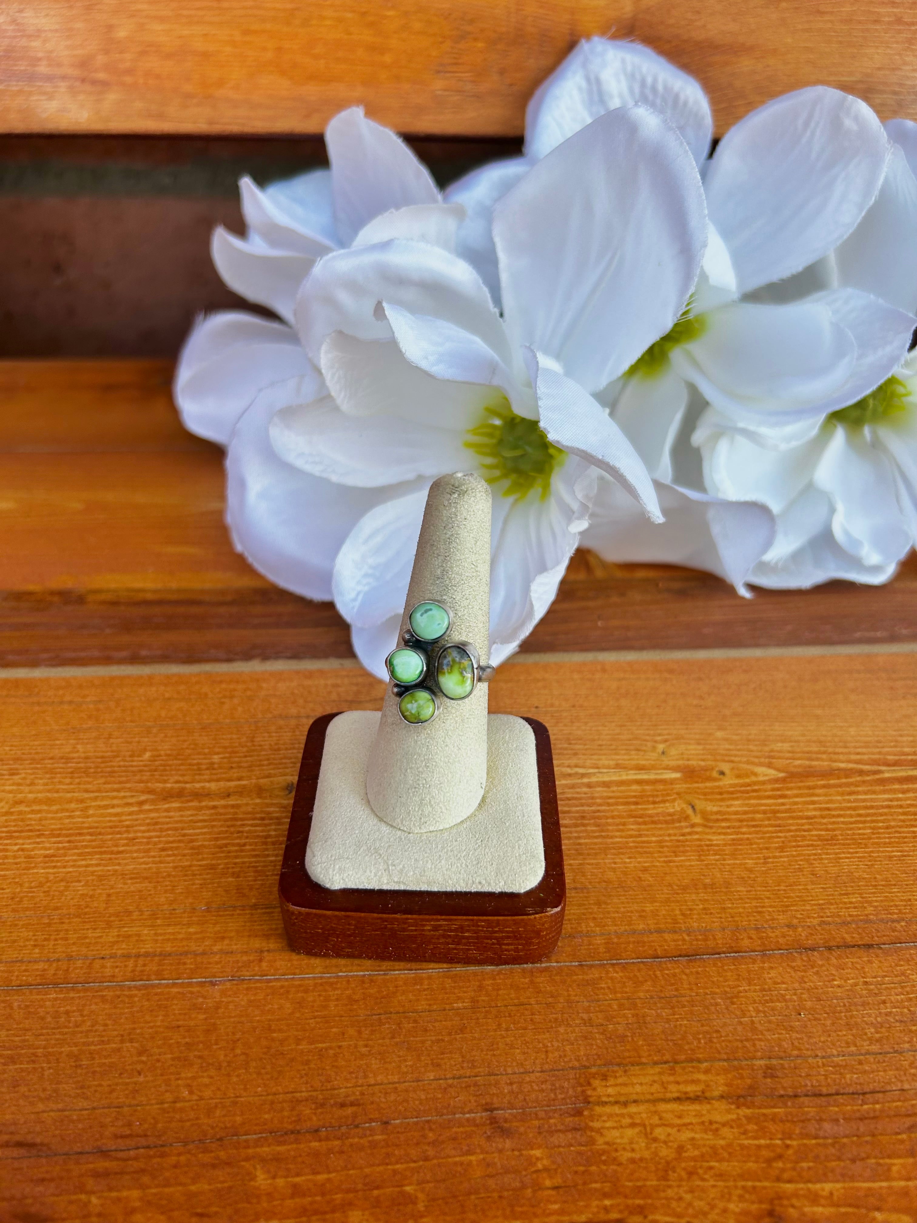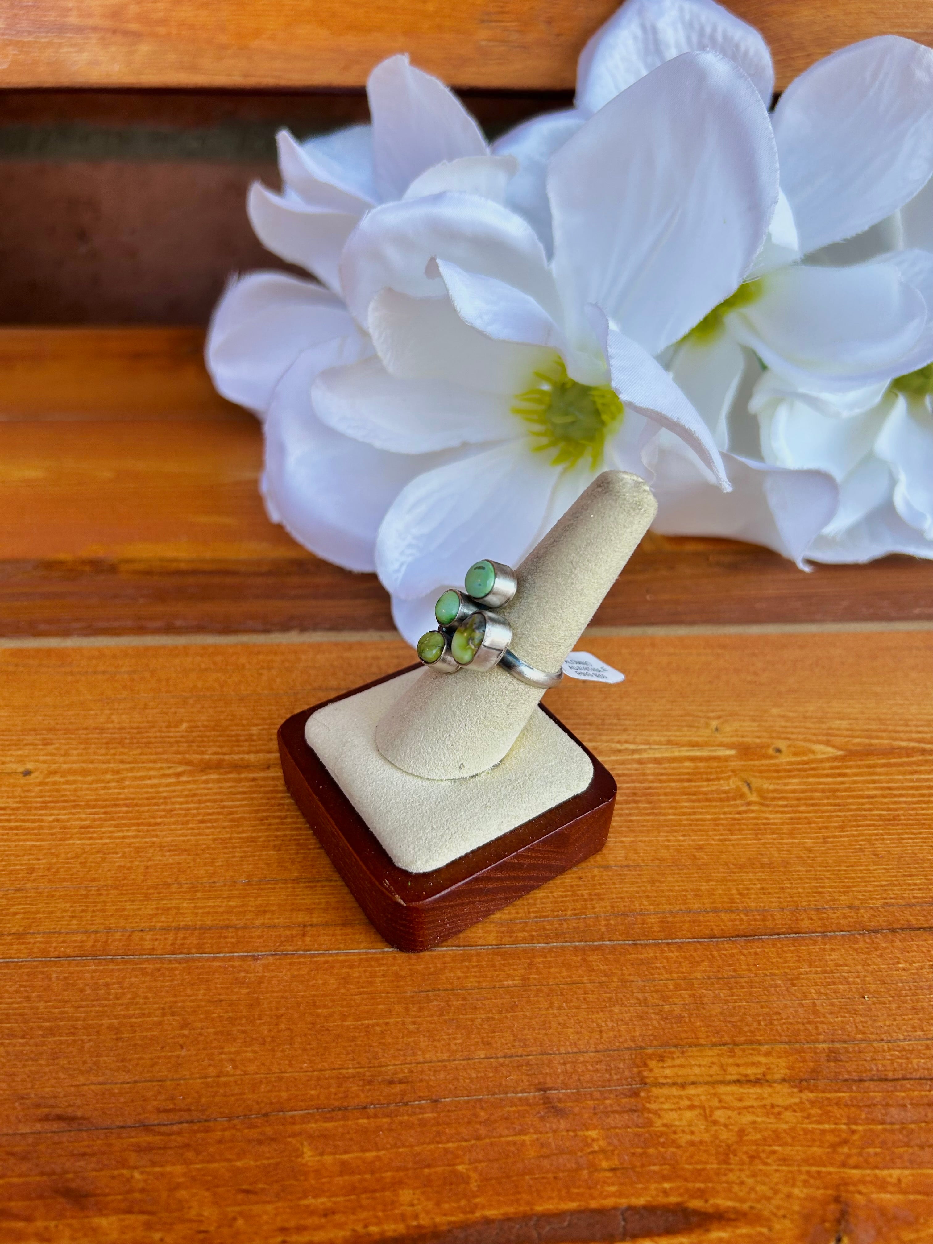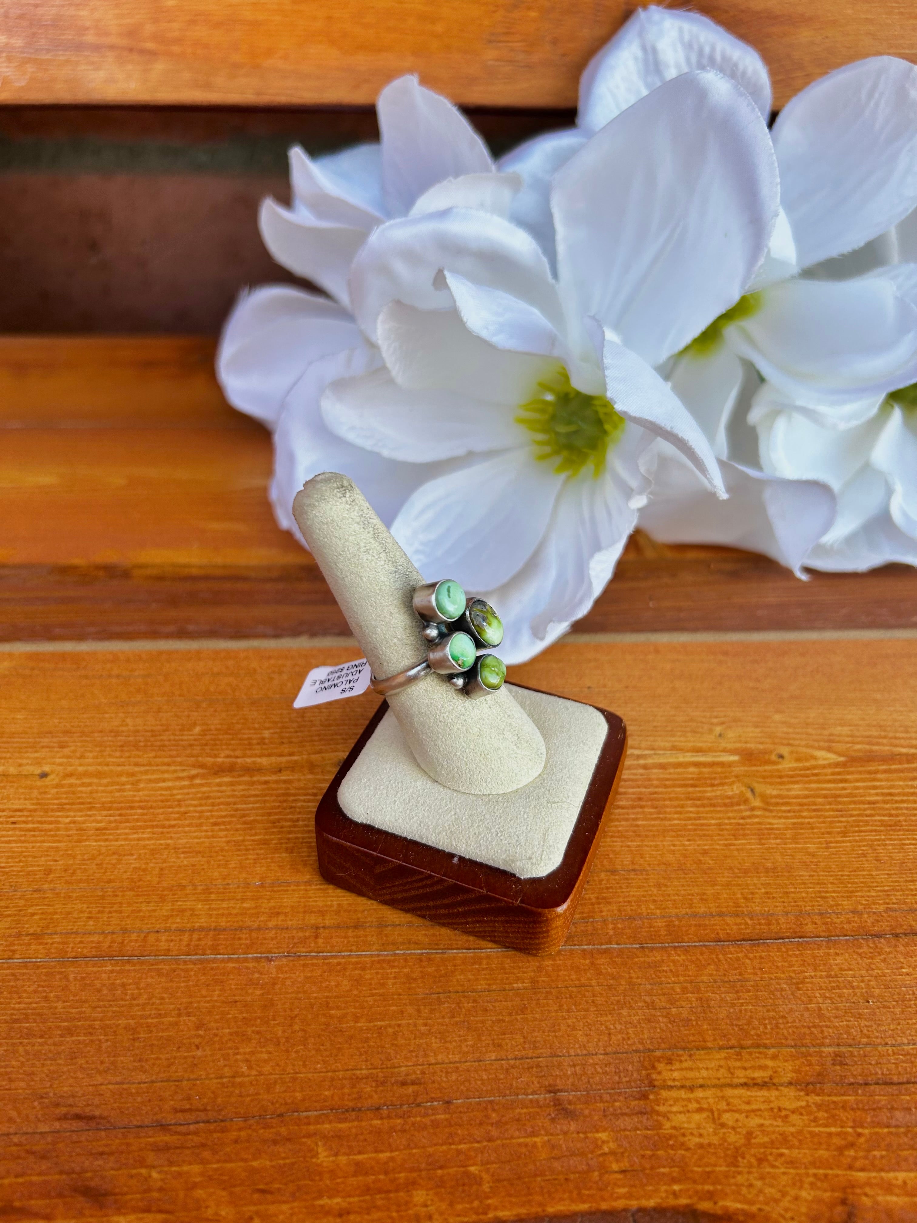 Eli Skeets Sonoran Gold Turquoise & Sterling Silver Adjustable Ring. It measures 7/8 of an inch long and 5/8 of an inch wide. Signed by the artist and stamped sterling silver.