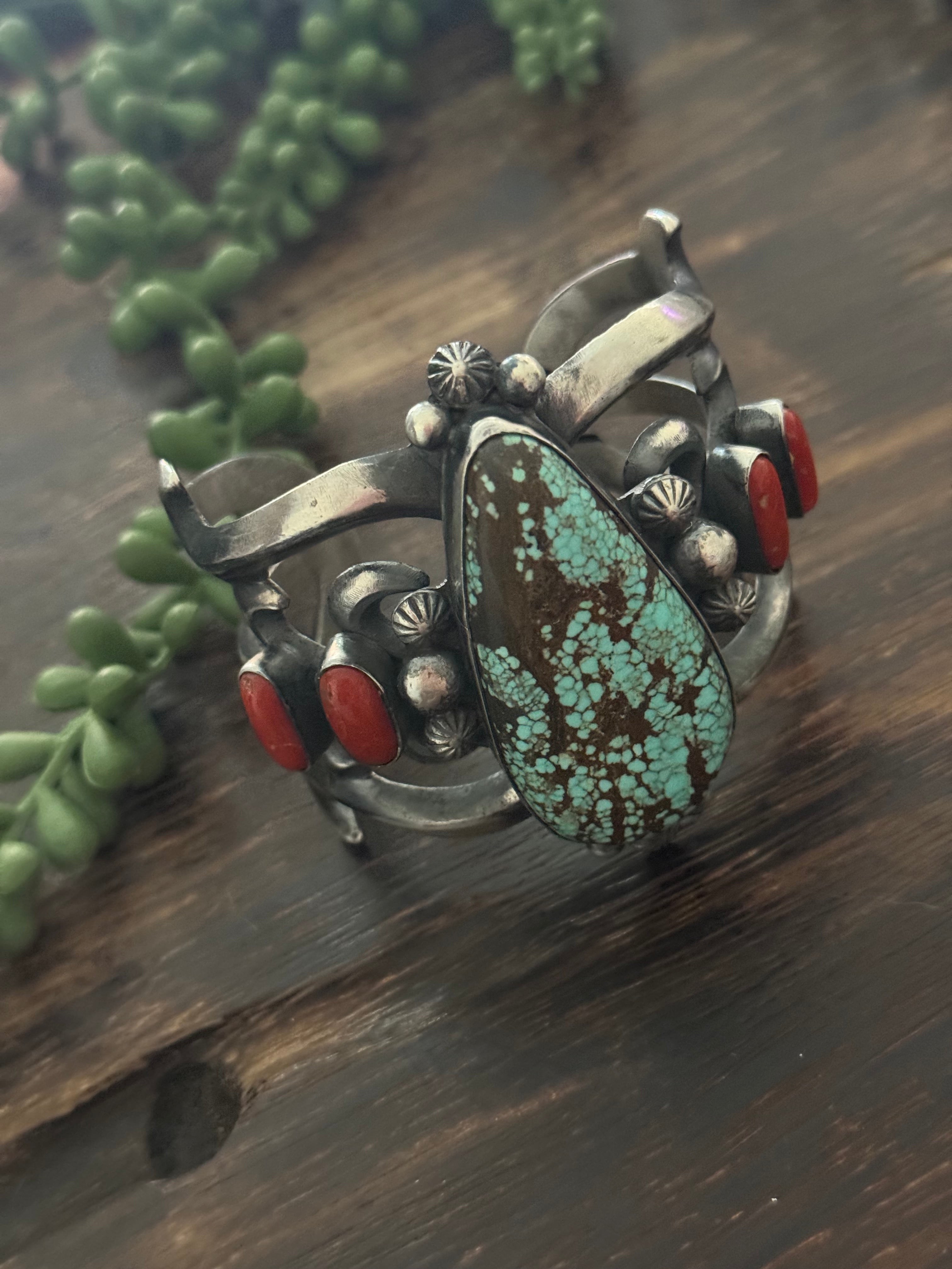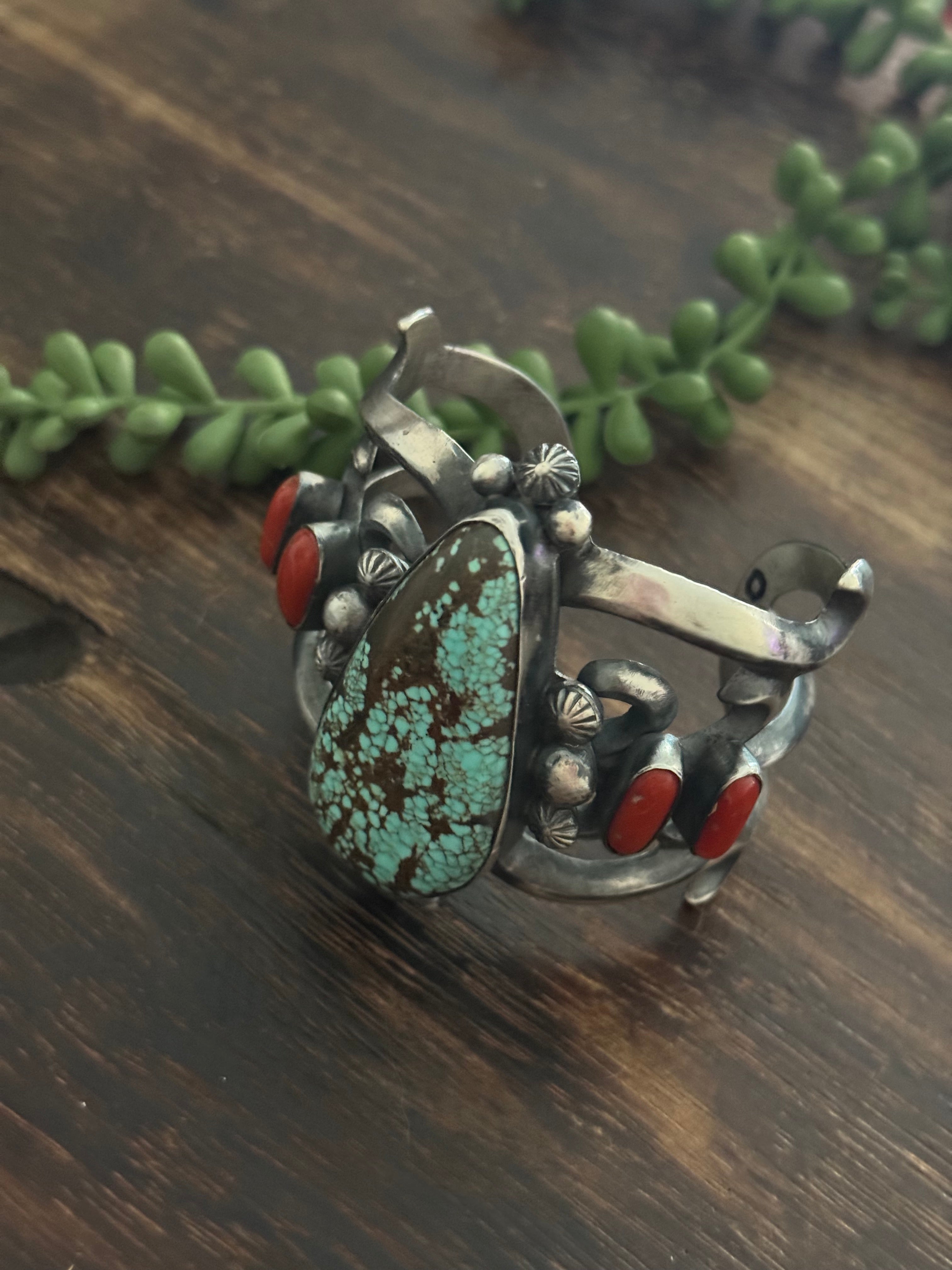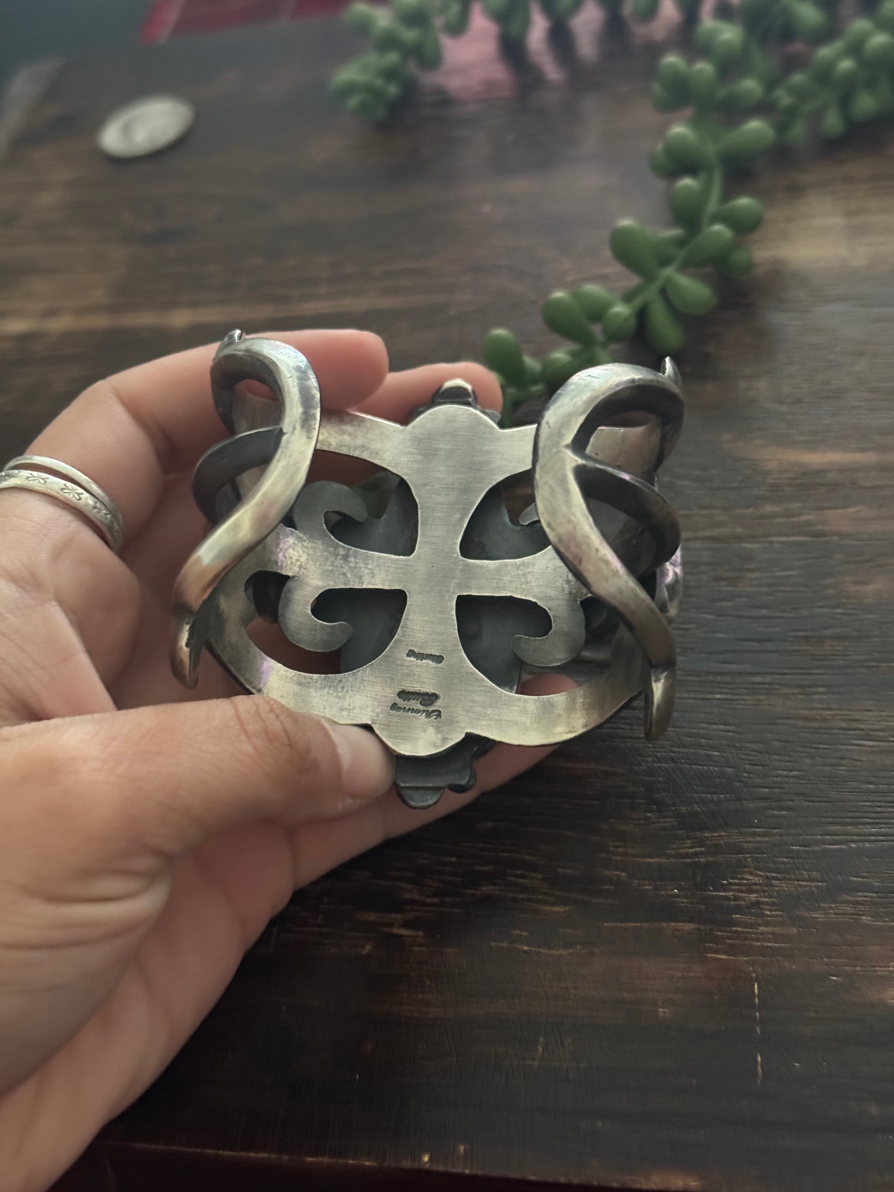 Chimney Butte Multi Stone & Sterling Silver Cuff Bracelet. It measures 2 5/8 inches wide with an inside circumference of 5 5/8 inches and a gap of 1 1/8 inches. Signed by the artist and stamped sterling silver.