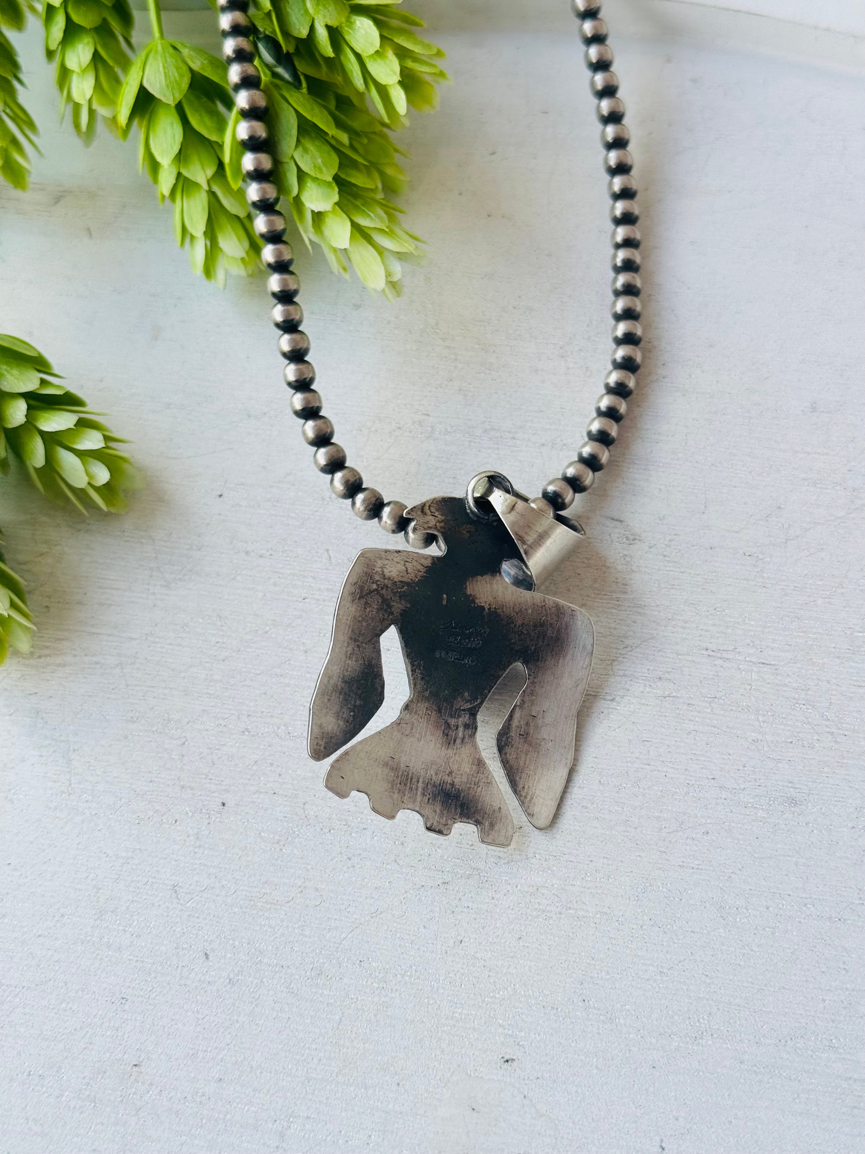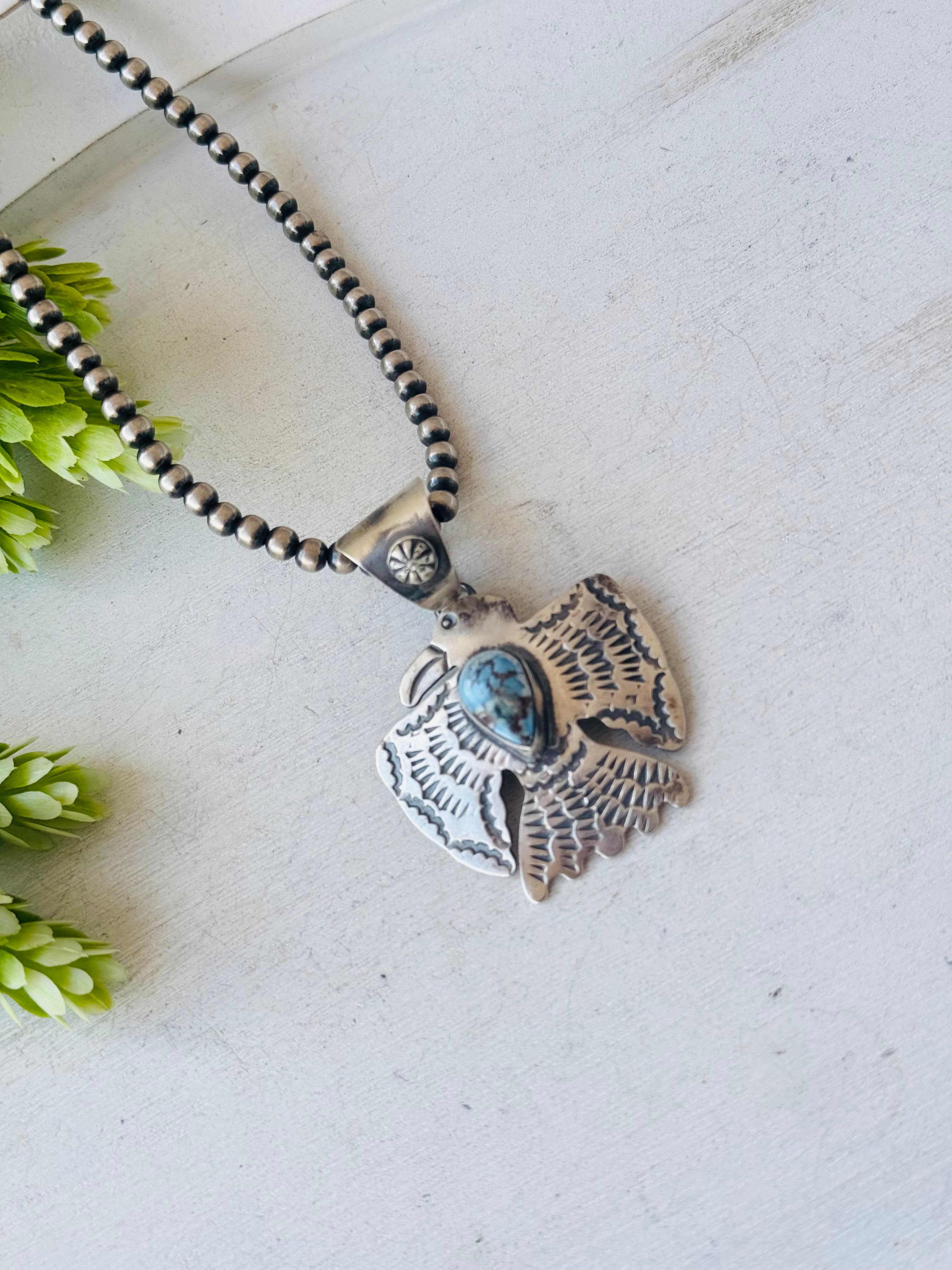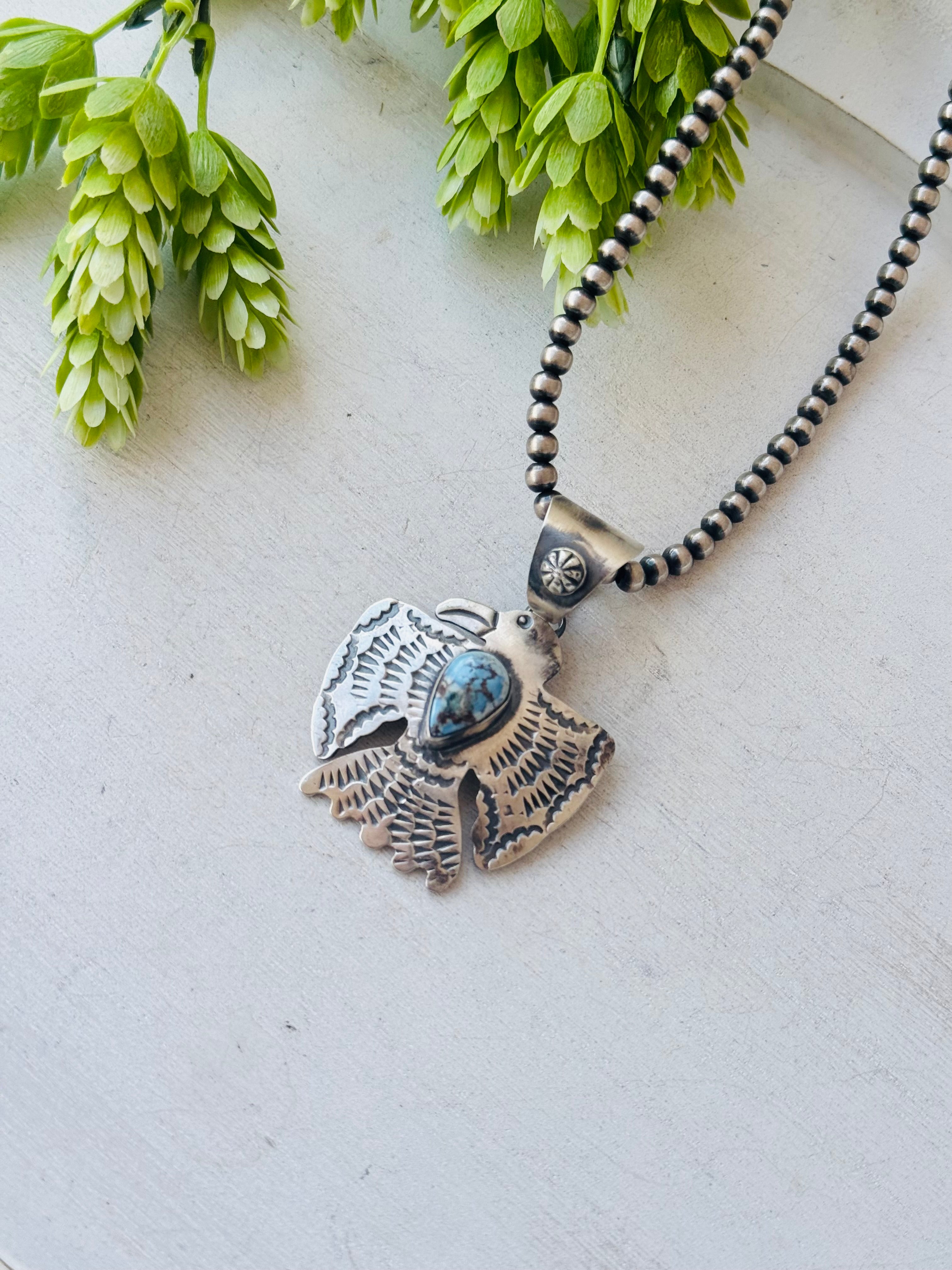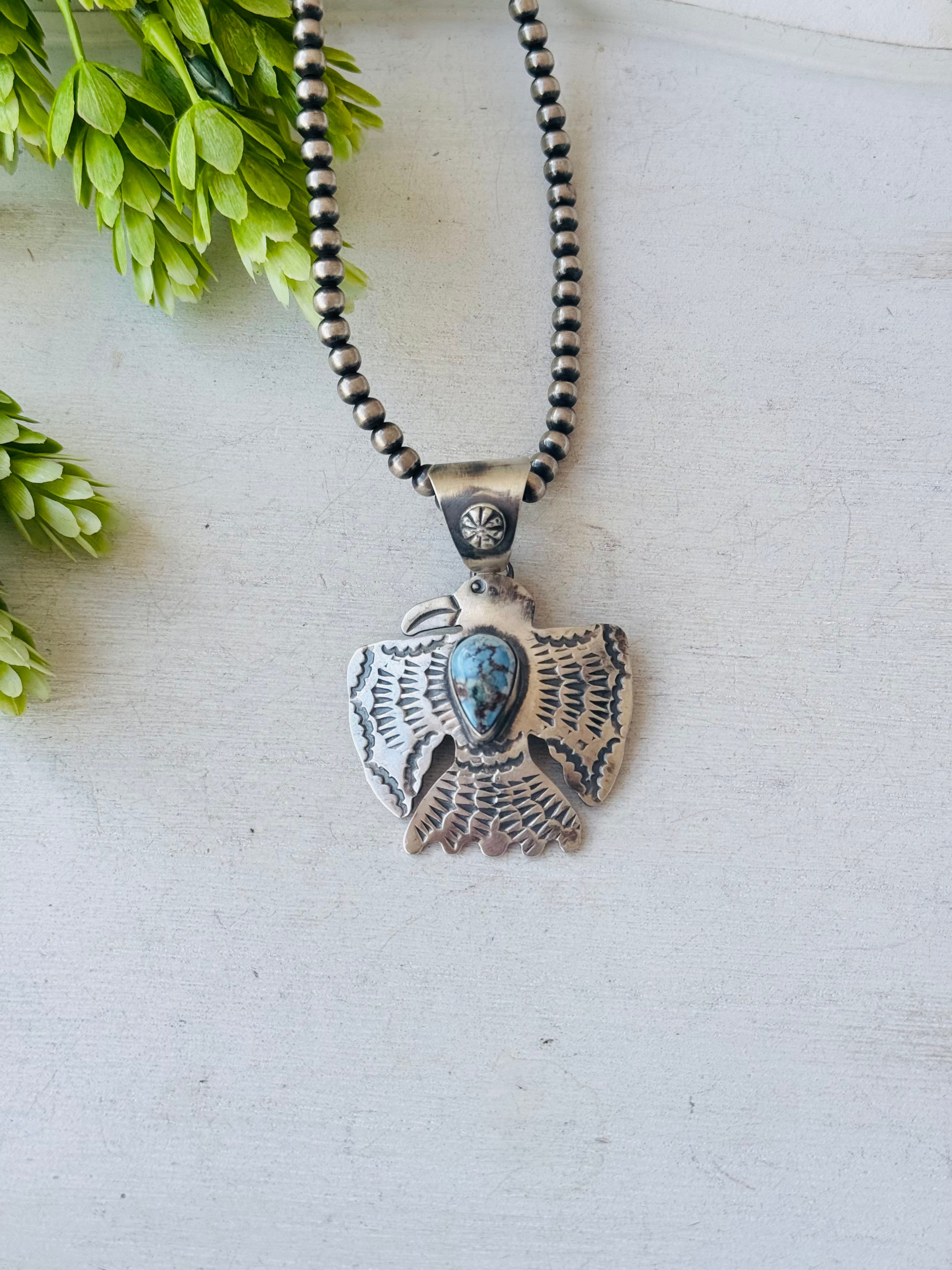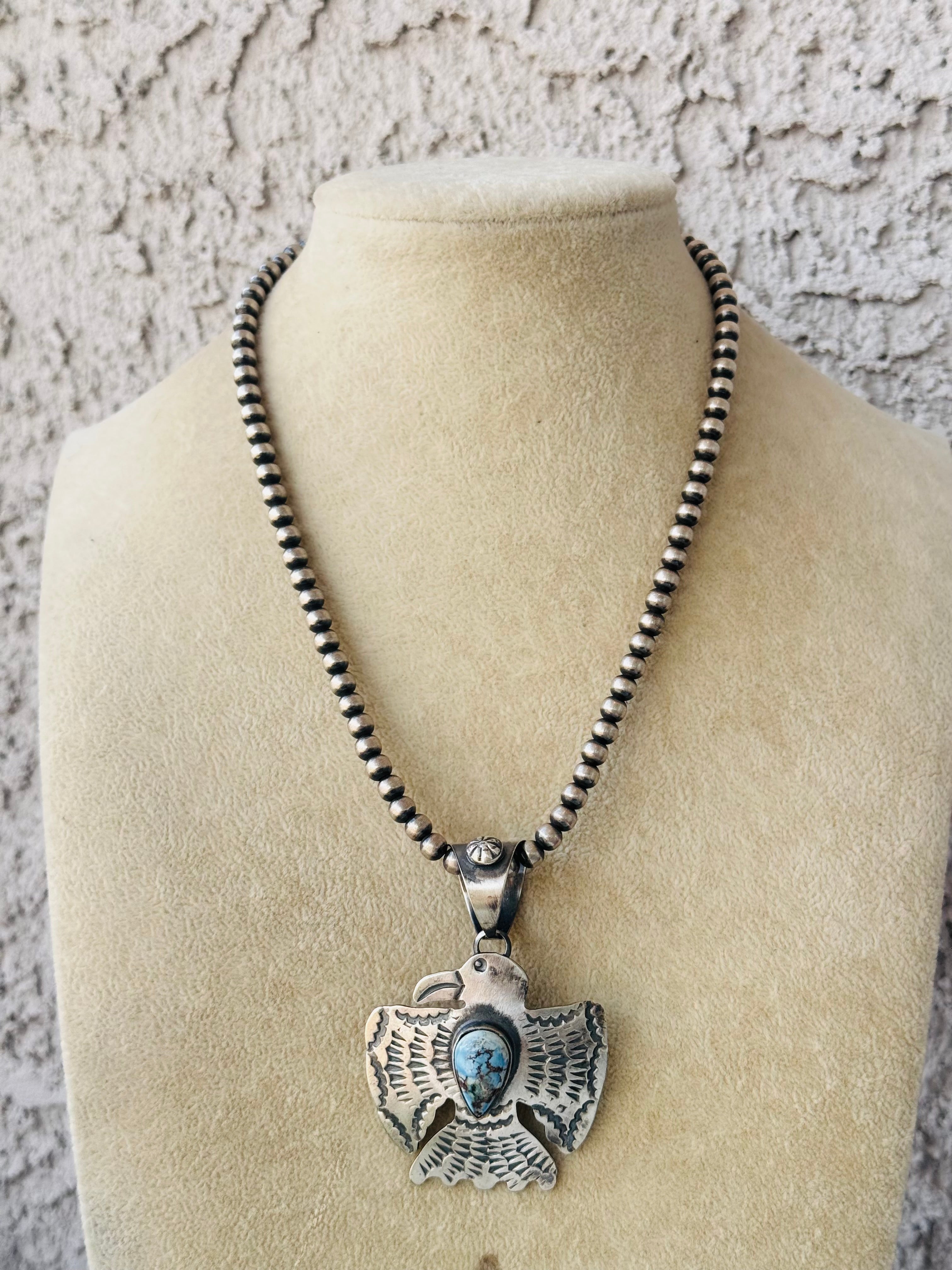 Chimney Butte Golden Hills Turquoise & Sterling Silver Thunderbird Pendant. It measures 2 1/2 inches long and 1 3/4 inches wide. Pendant Only. Signed by the artist and stamped sterling silver.