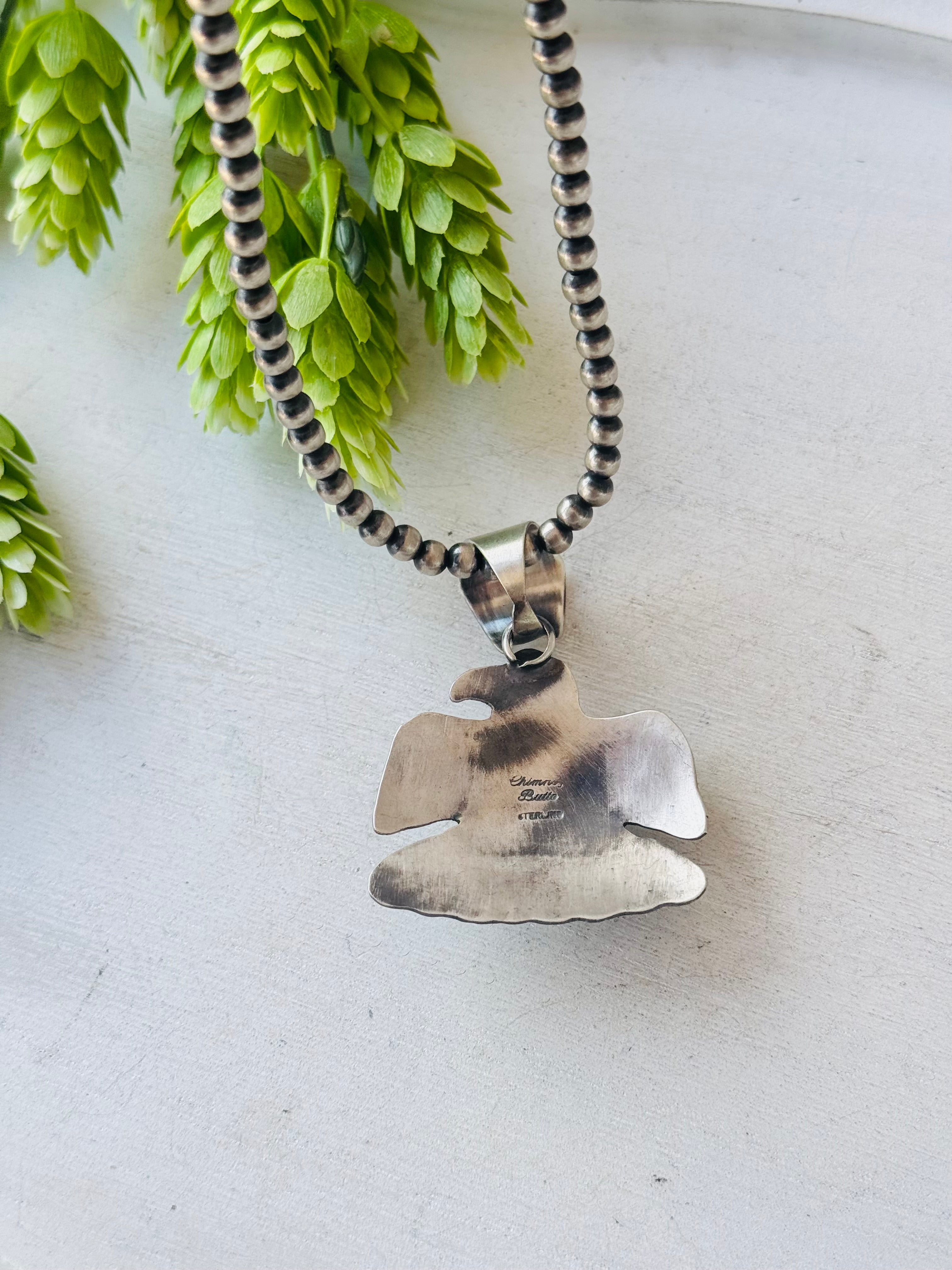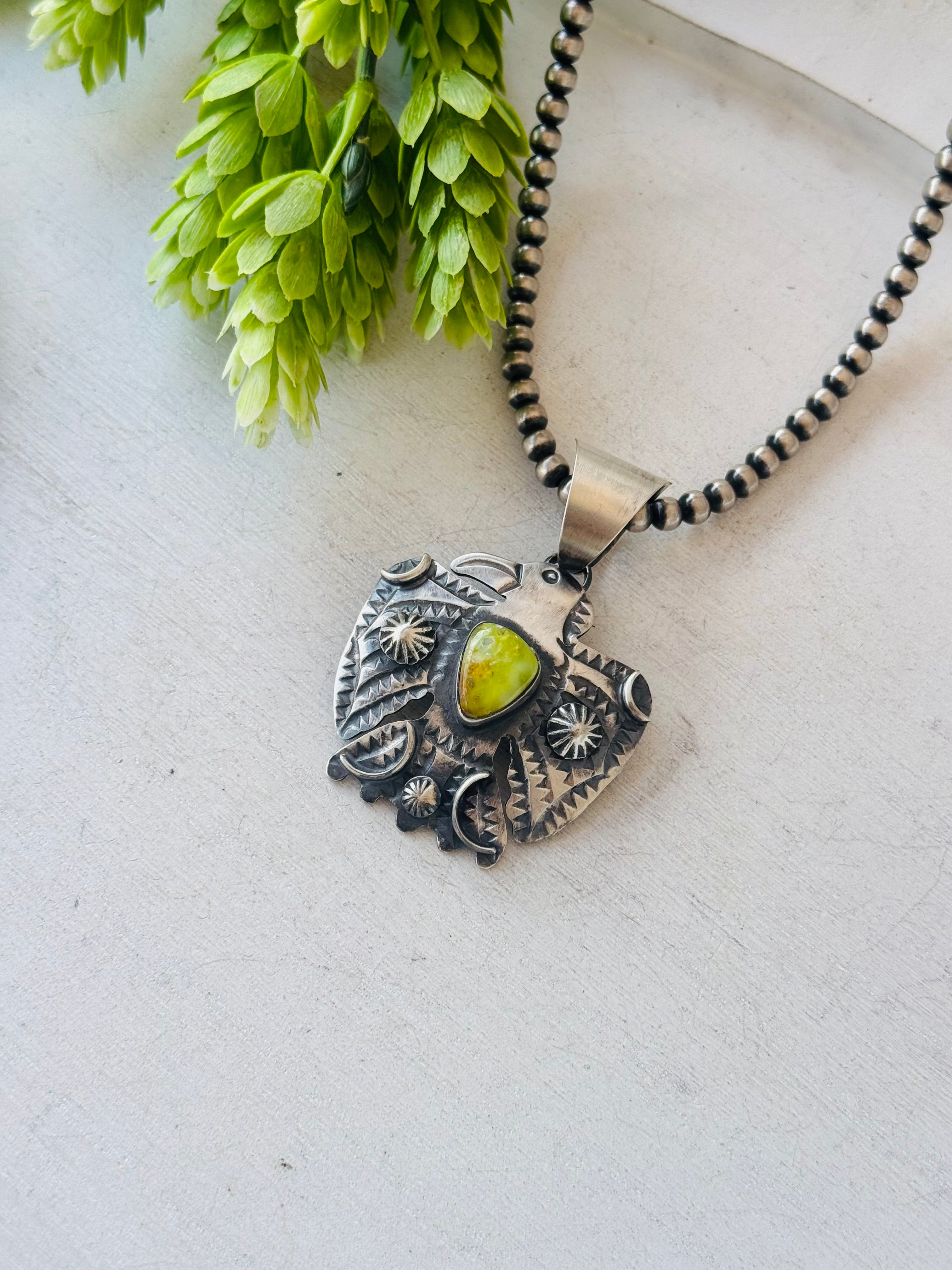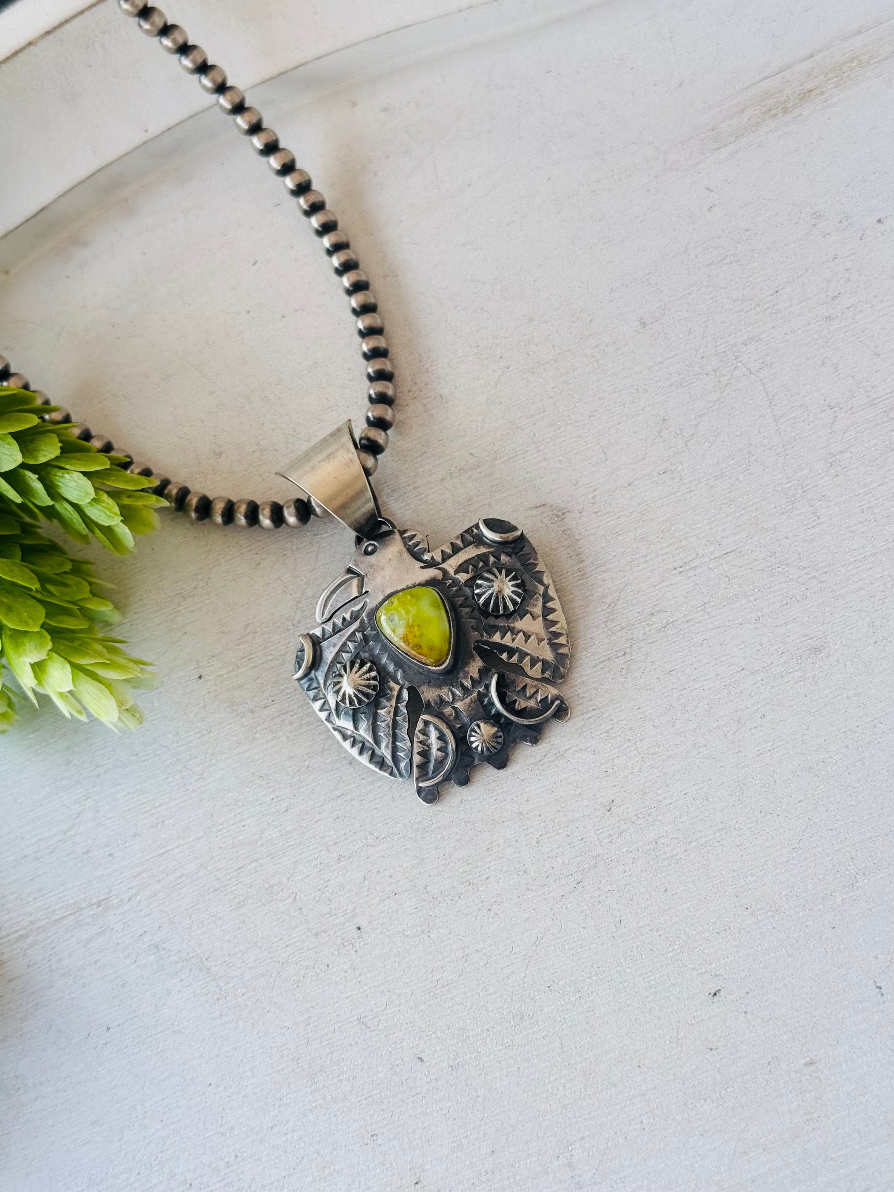 Chimney Butte Palomino Variscite & Sterling Silver Thunderbird Pendant. It measures 2 1/2 inches long and 1 3/4 inches wide. Pendant Only. Signed by the artist and stamped sterling silver.