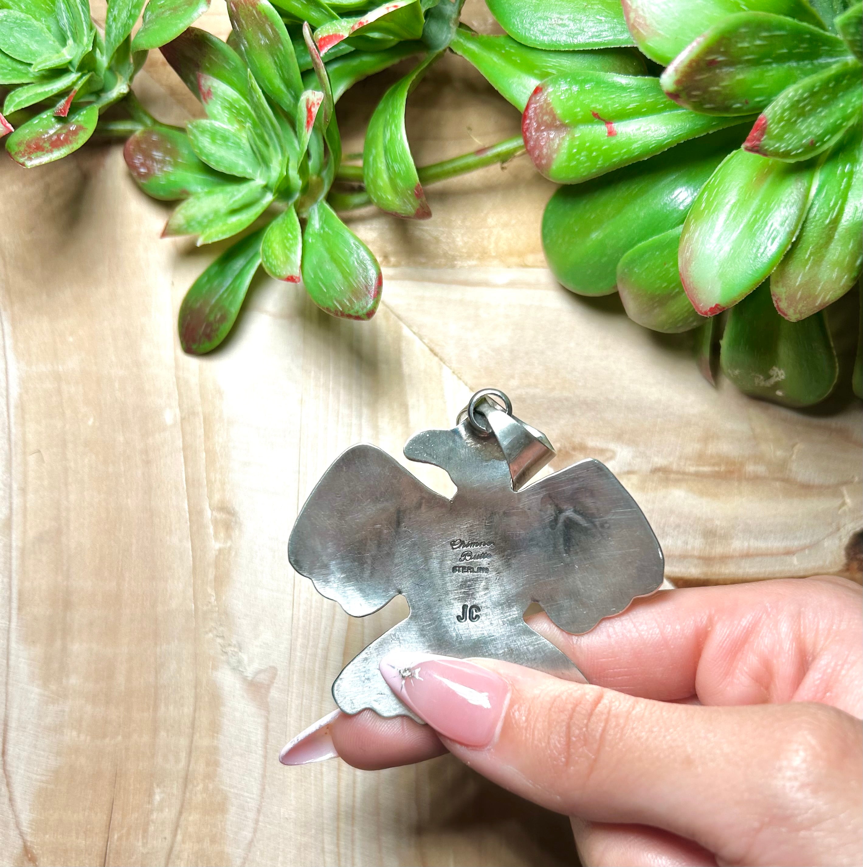 Chimney Butte Sterling Kingman Turquoise & Silver Pendant. It measures 2 7/8 inches long and 2 3/8 inches wide. Pendant Only!! Signed by the artist and stamped sterling silver.
