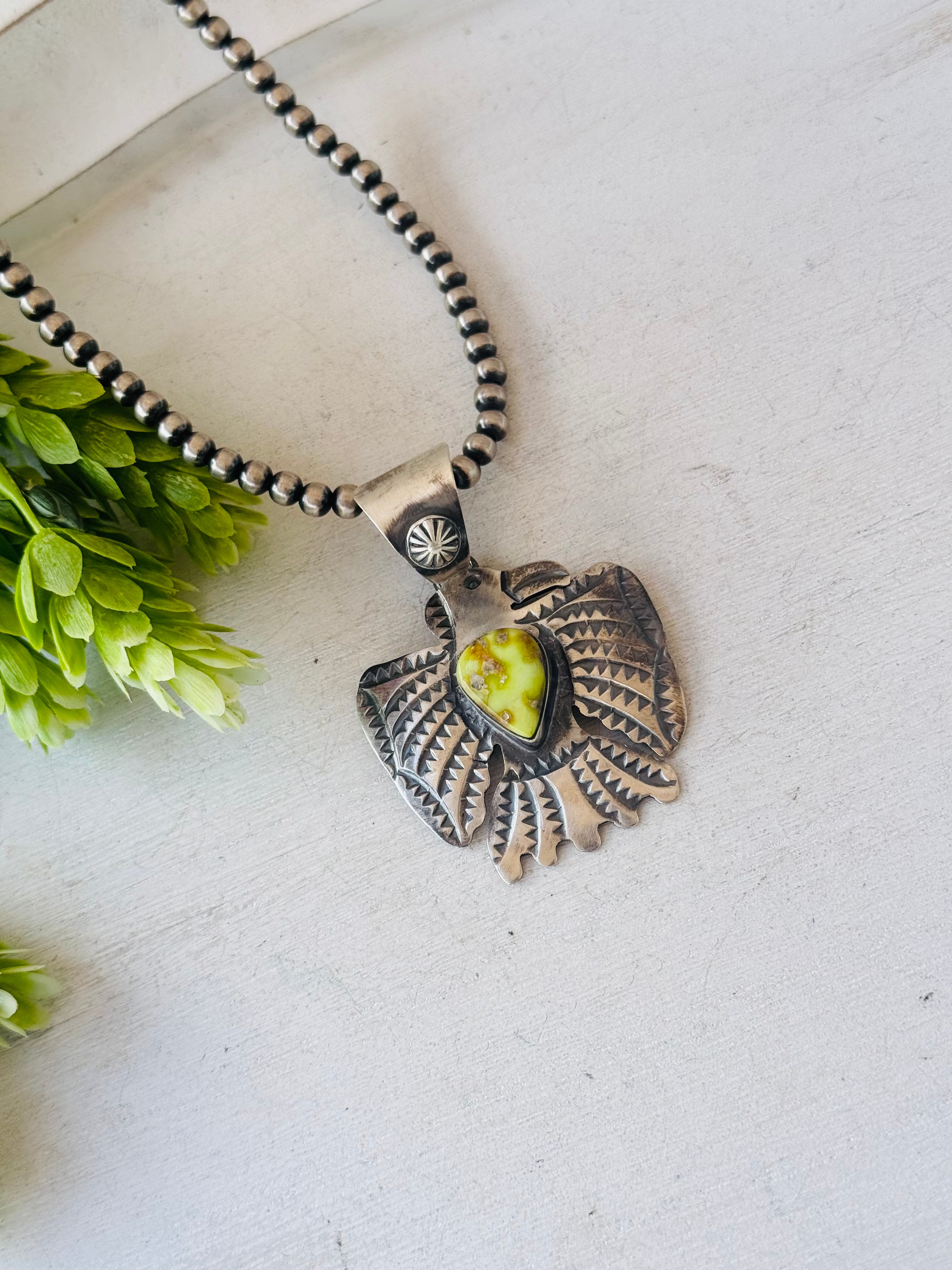 Chimney Butte Palomino Variscite & Sterling Silver Thunderbird Pendant. It measures 2 1/2 inches long and 1 3/4 inches wide. Pendant Only. Signed by the artist and stamped sterling silver.