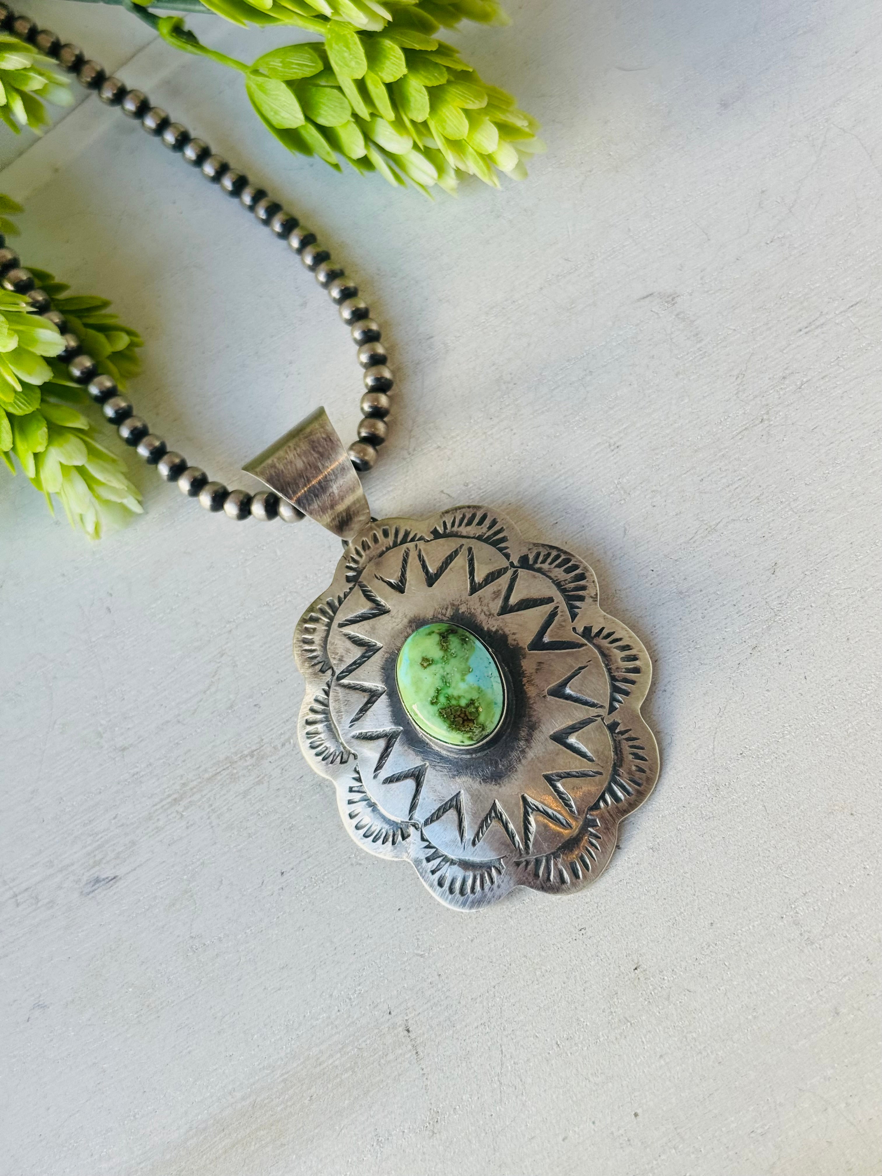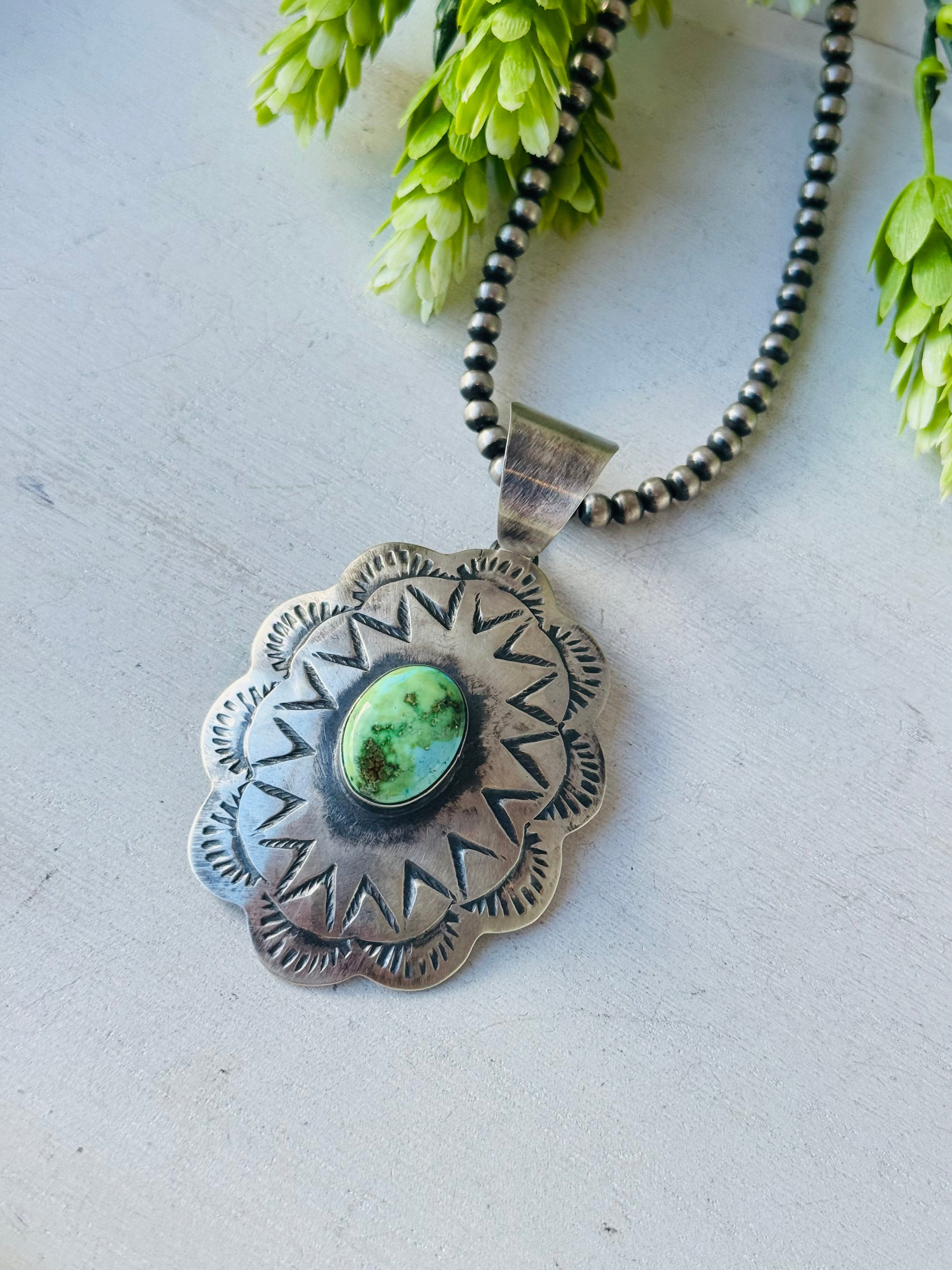 Chimney Butte Sonoran Mountain & Sterling Silver Concho Pendant. It measures 3 1/2 inches long and 1 7/8 inches wide. Pendant Only. Signed by the artist and stamped sterling silver.
