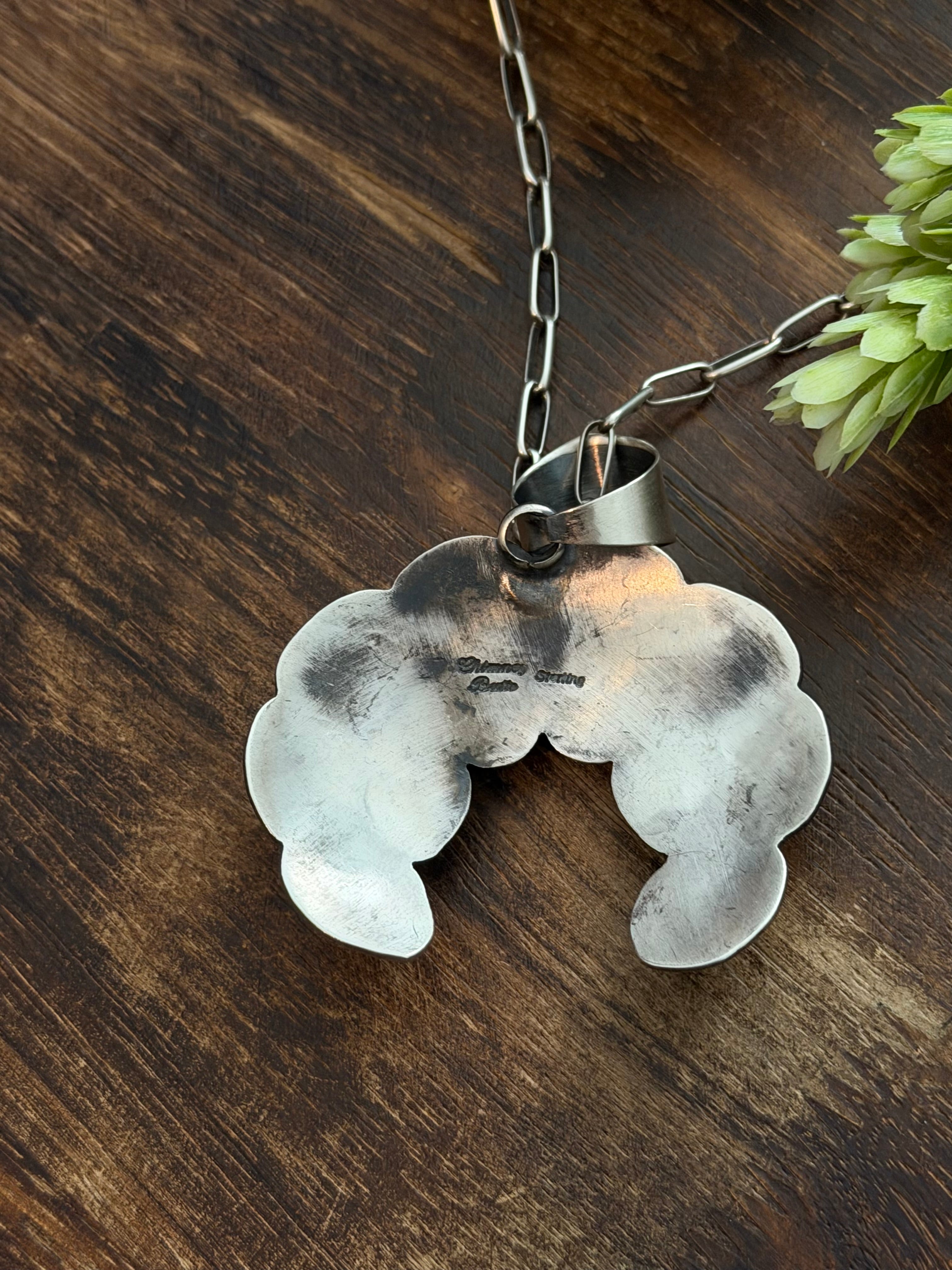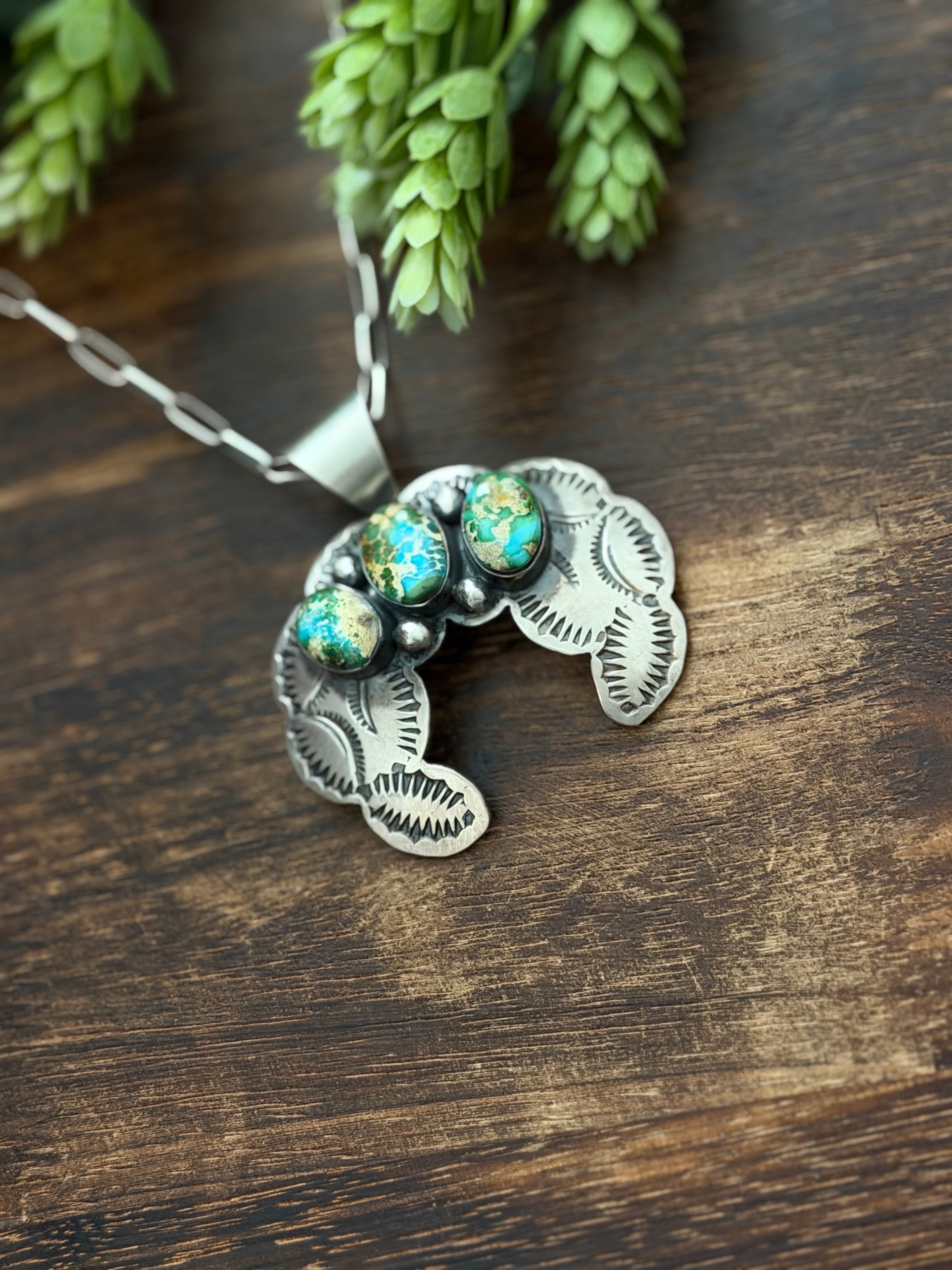 Chimney Butte Sonoran Mountain Turquoise & Sterling Silver Naja Pendant. It measures 2 5/8 inches long and 2 1/2 inches wide. Pendant Only. Signed by the artist and stamped sterling silver.