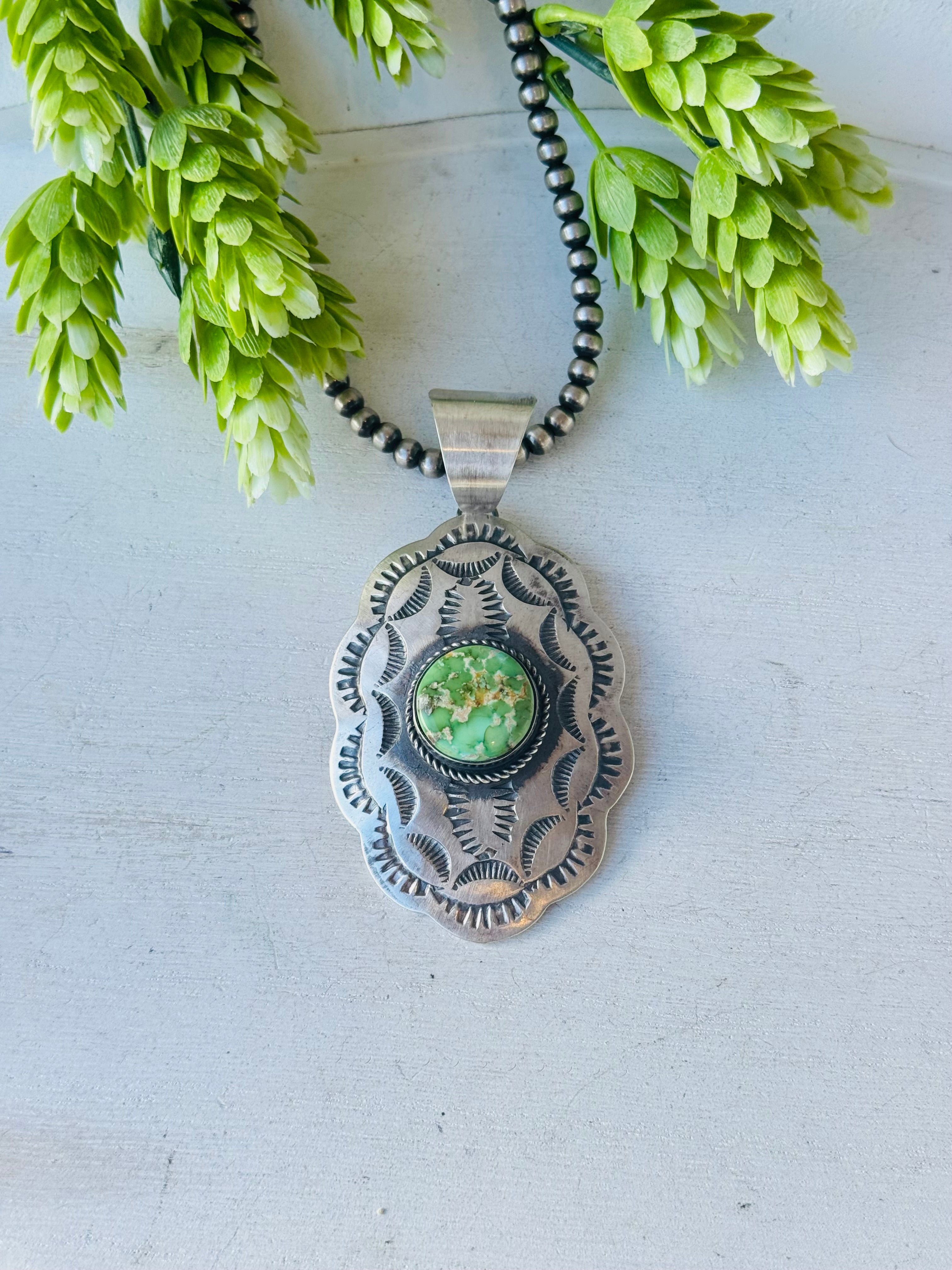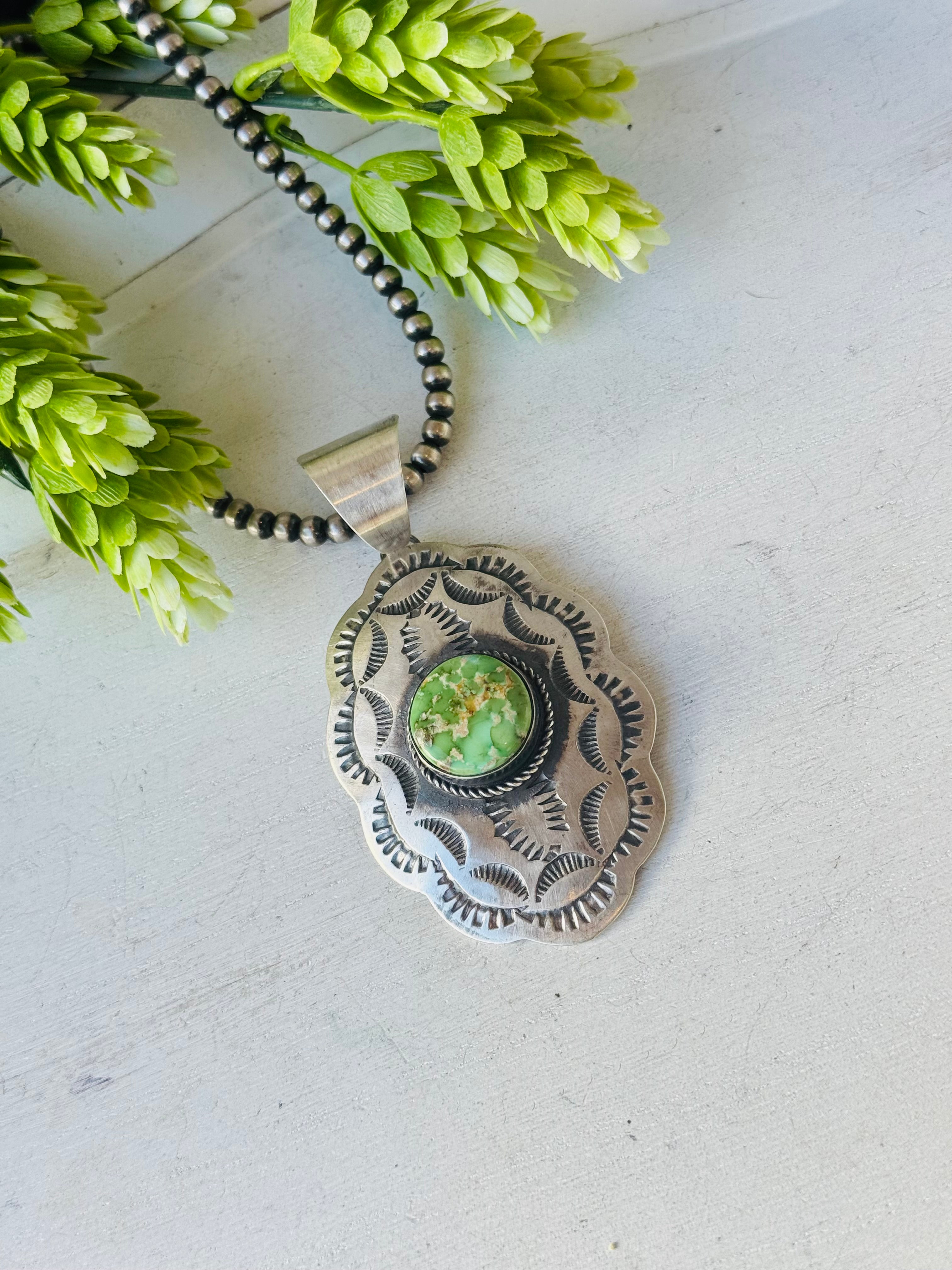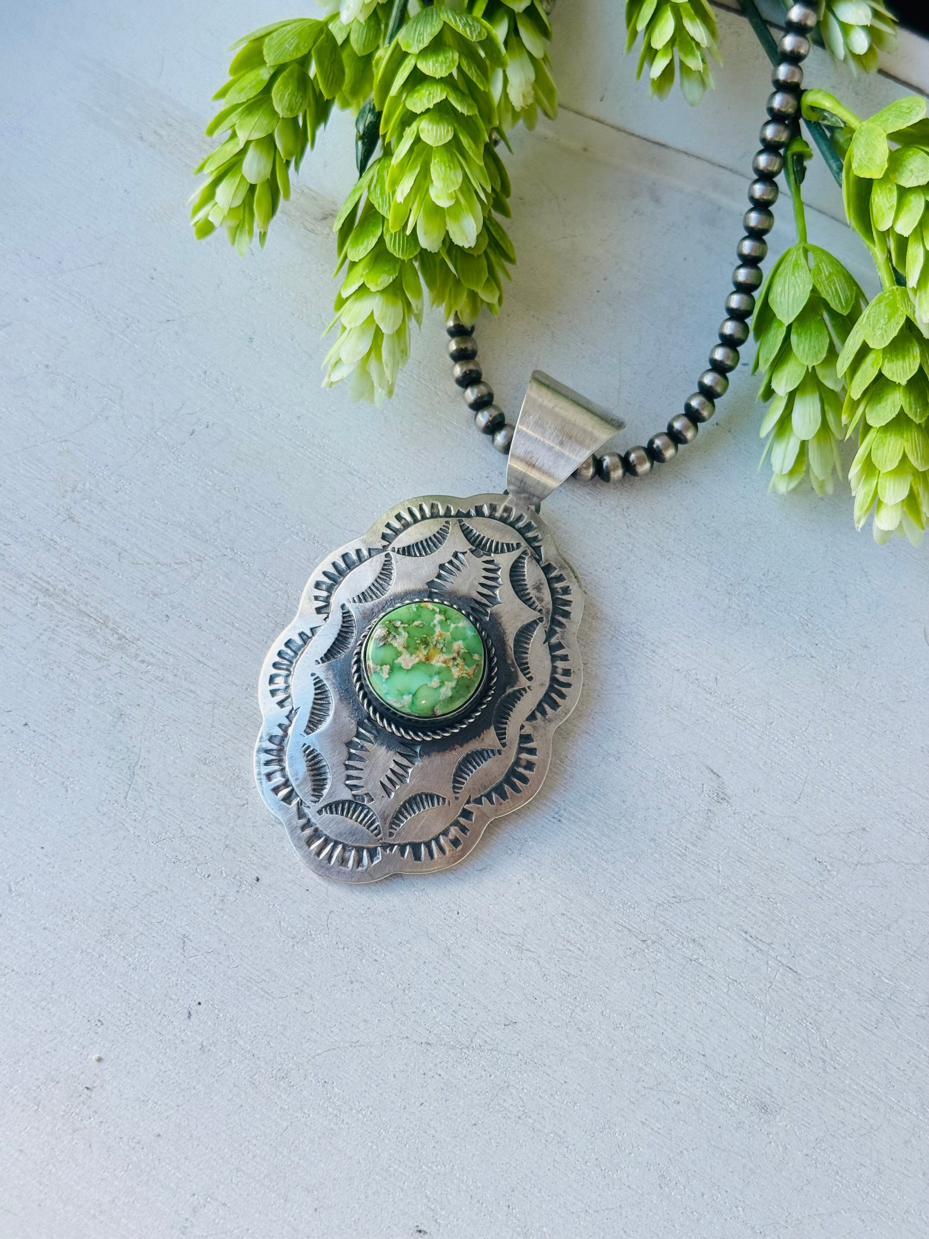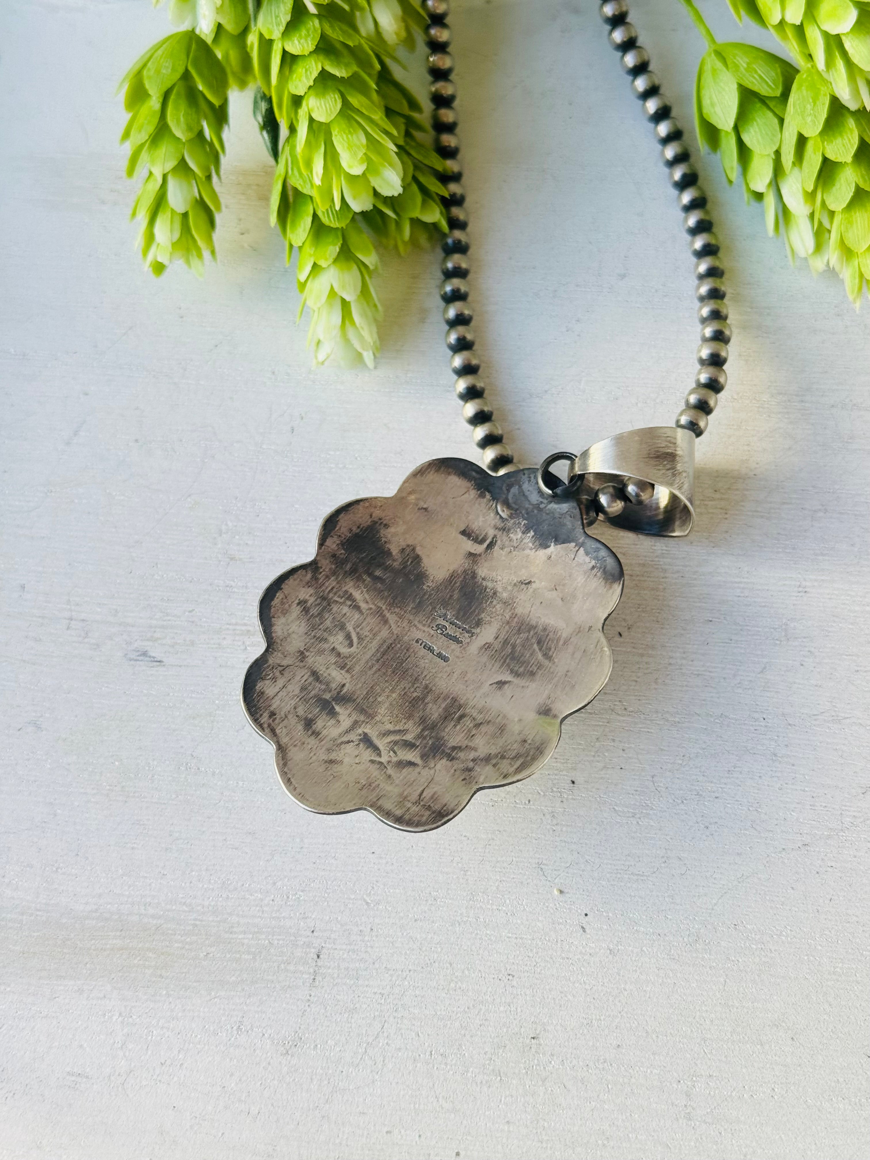 Chimney Butte Sonoran Mountain & Sterling Silver Concho Pendant. It measures 3 1/2 inches long and 1 7/8 inches wide. Pendant Only. Signed by the artist and stamped sterling silver.