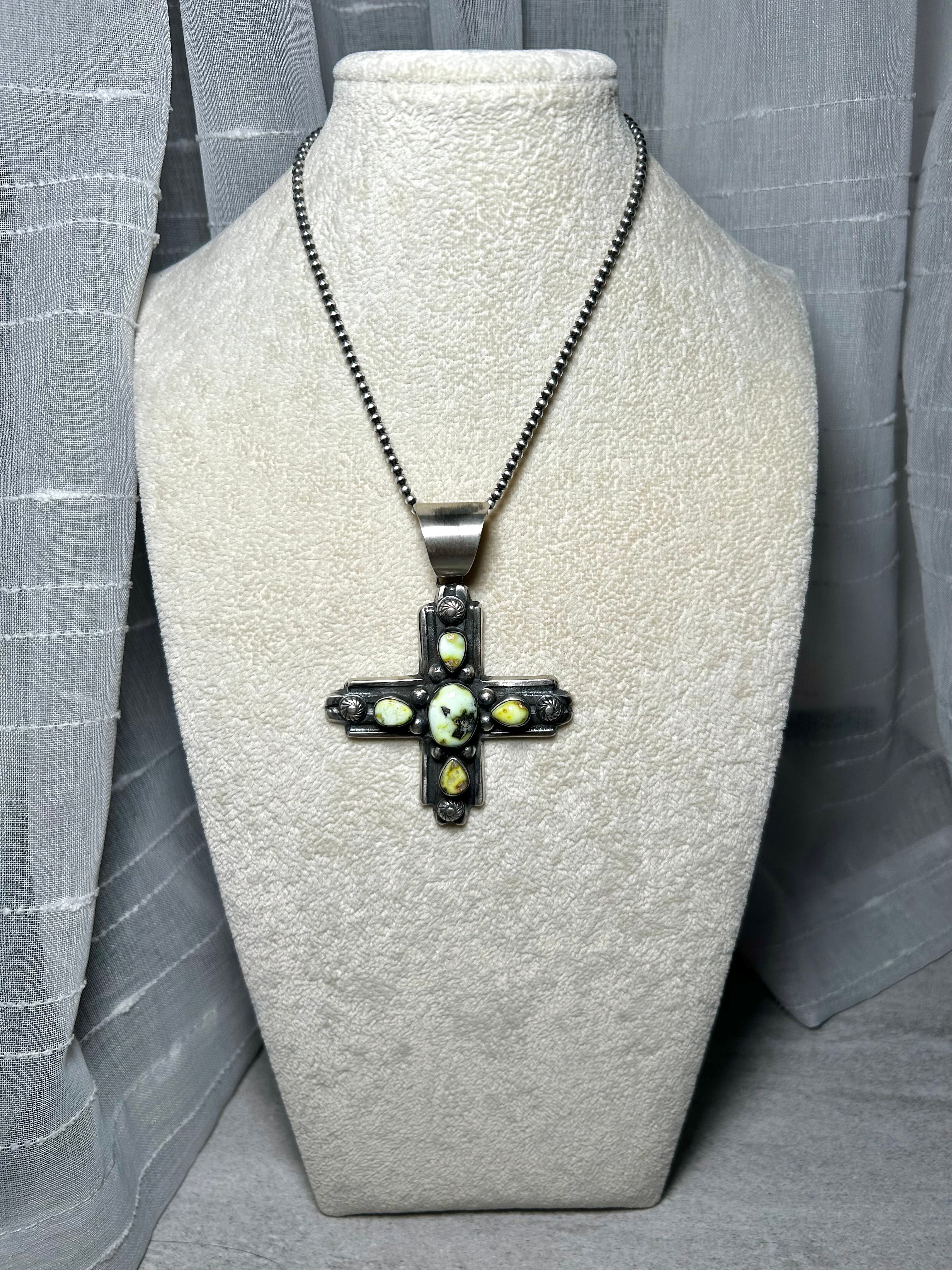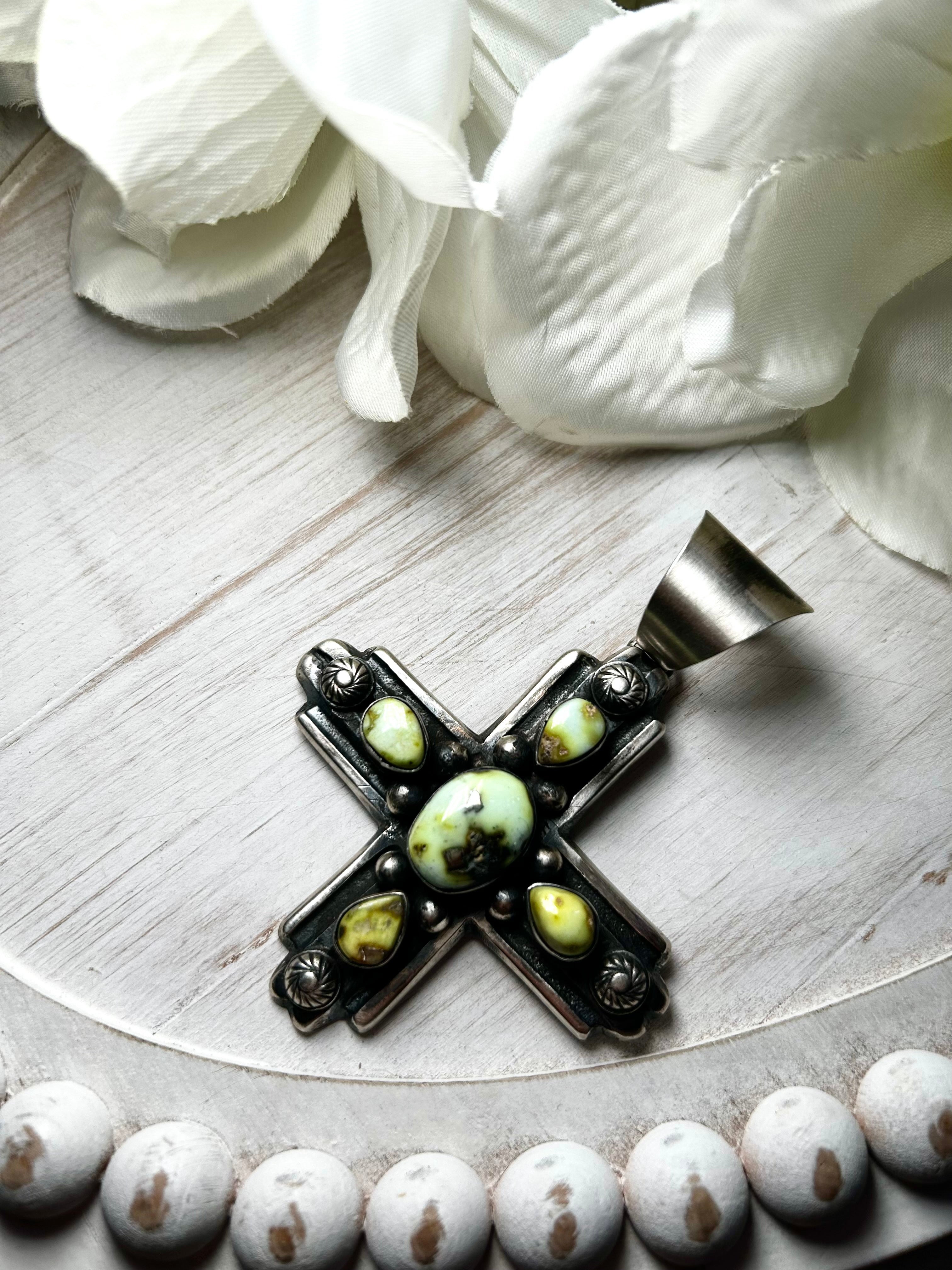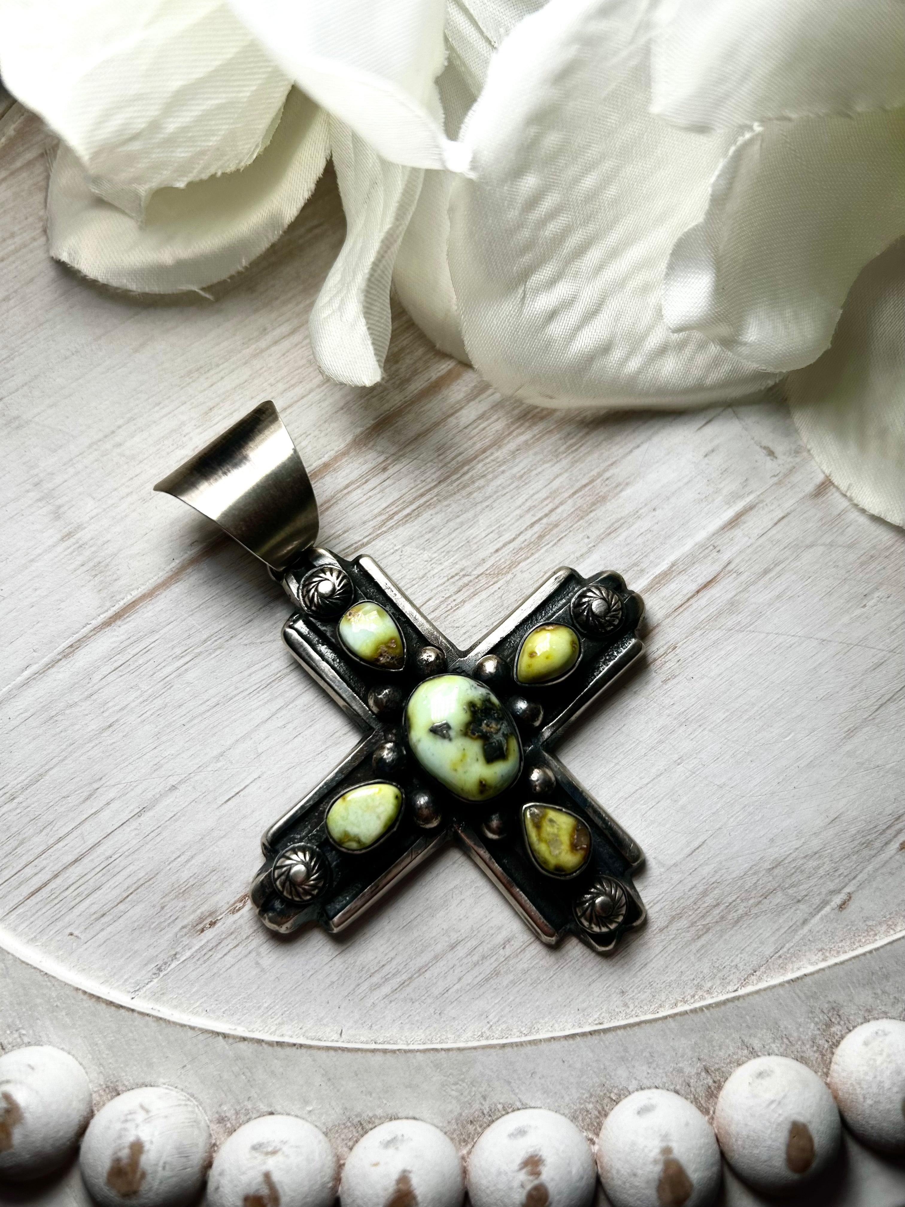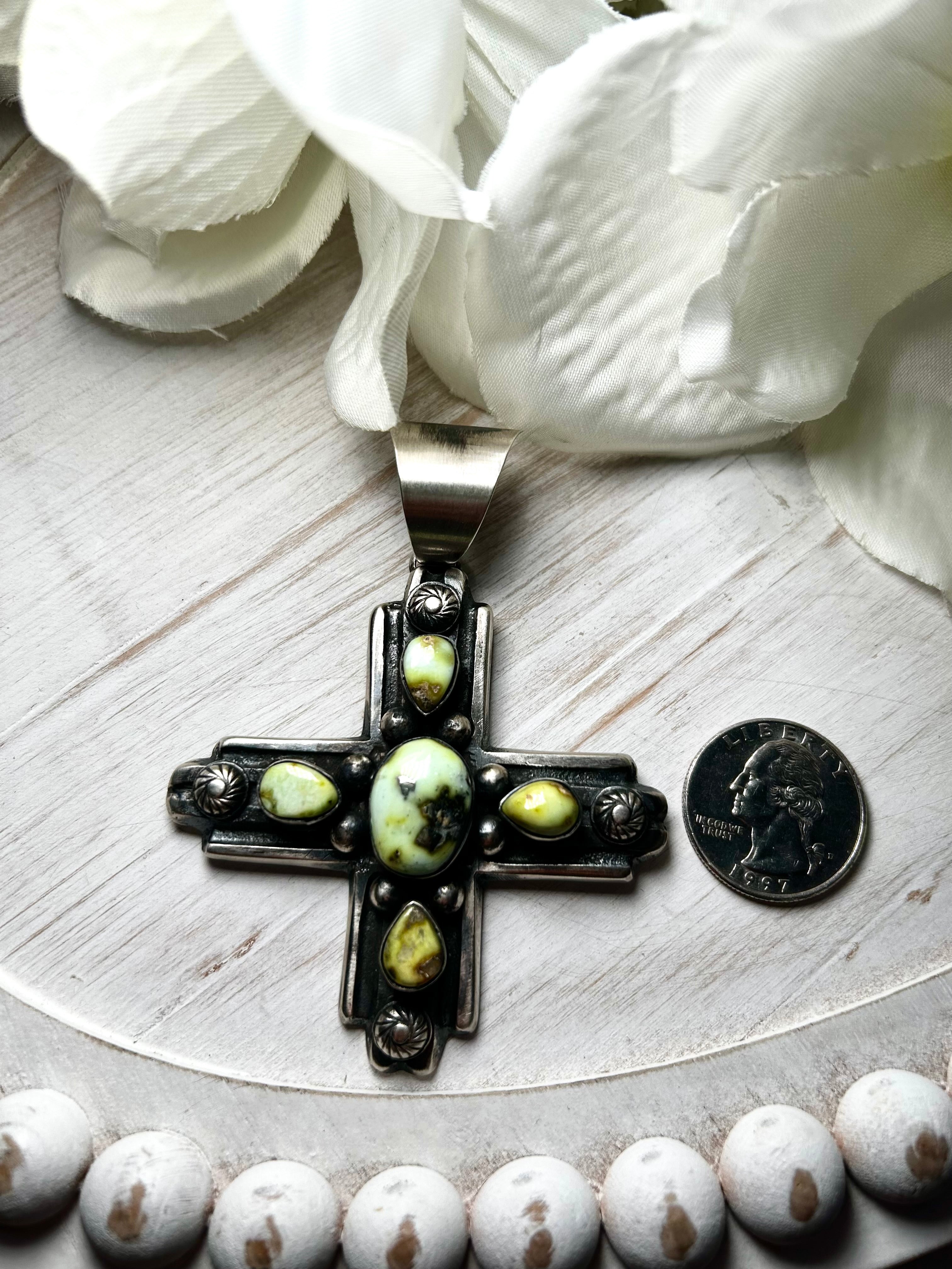 Chimney Butte Palomino Variscite & Sterling Silver Pendant. It measures 3 1/2 inches long and 2 5/8 inches wide. Signed by the artist and stamped sterling silver. Pendant only!