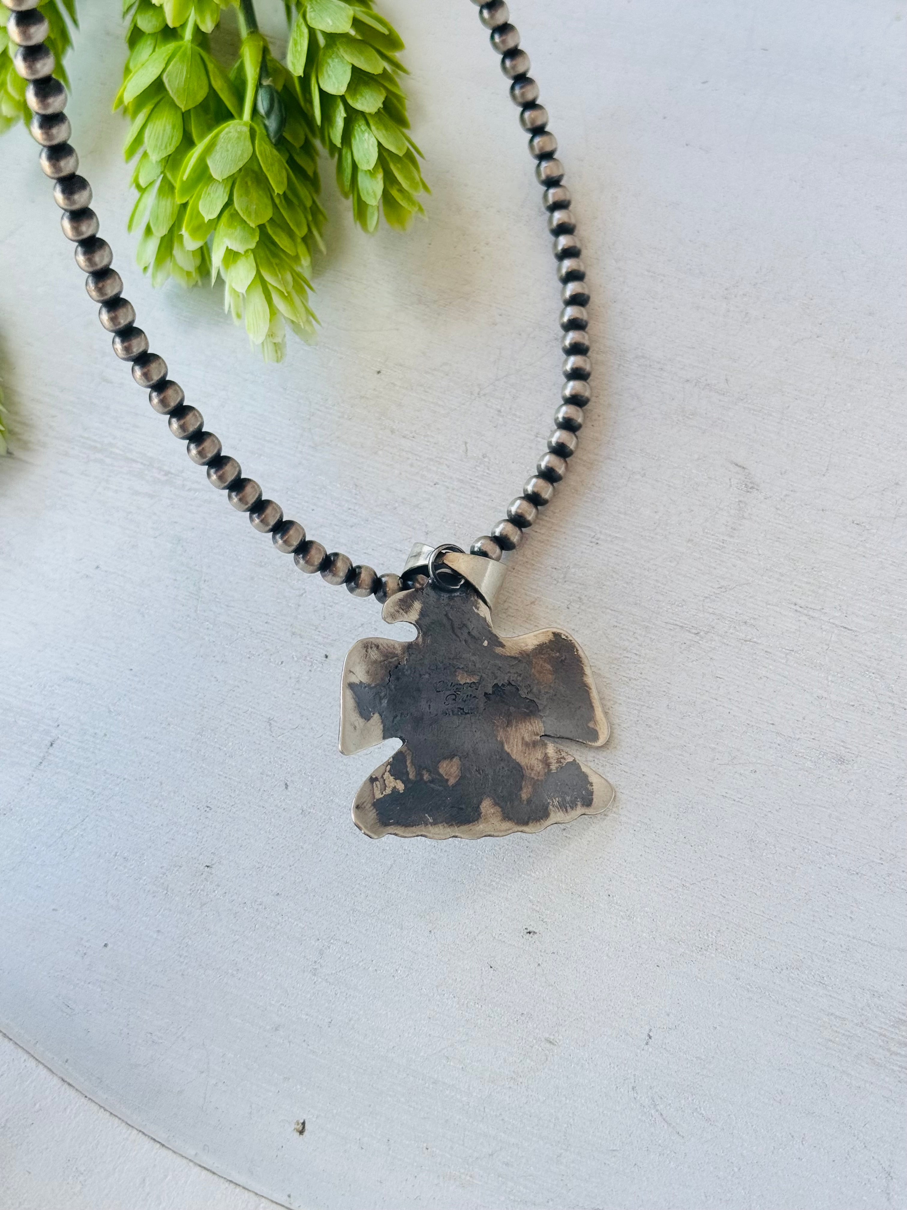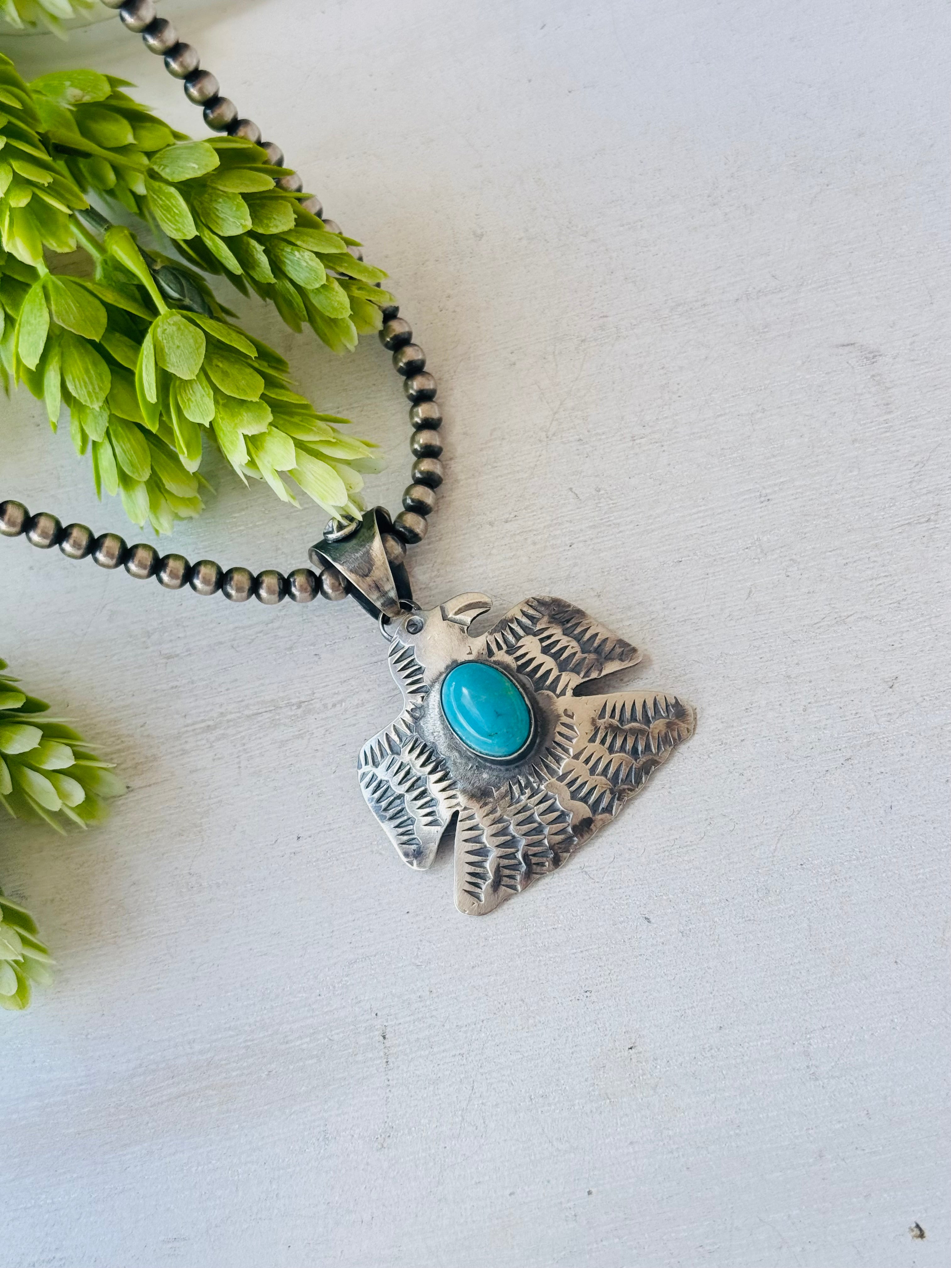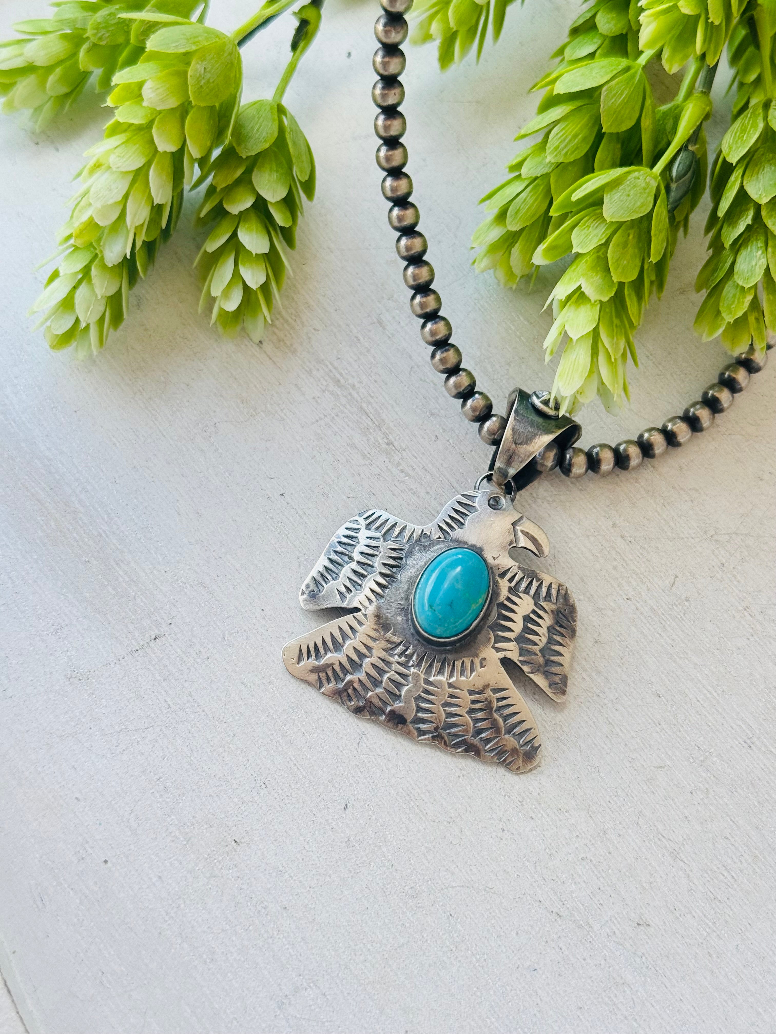 Chimney Butte Turquoise & Sterling Silver Thunderbird Pendant. It measures 2 3/8 inches long and 1 3/4 inches wide. Pendant Only. Signed by the artist and stamped sterling silver.