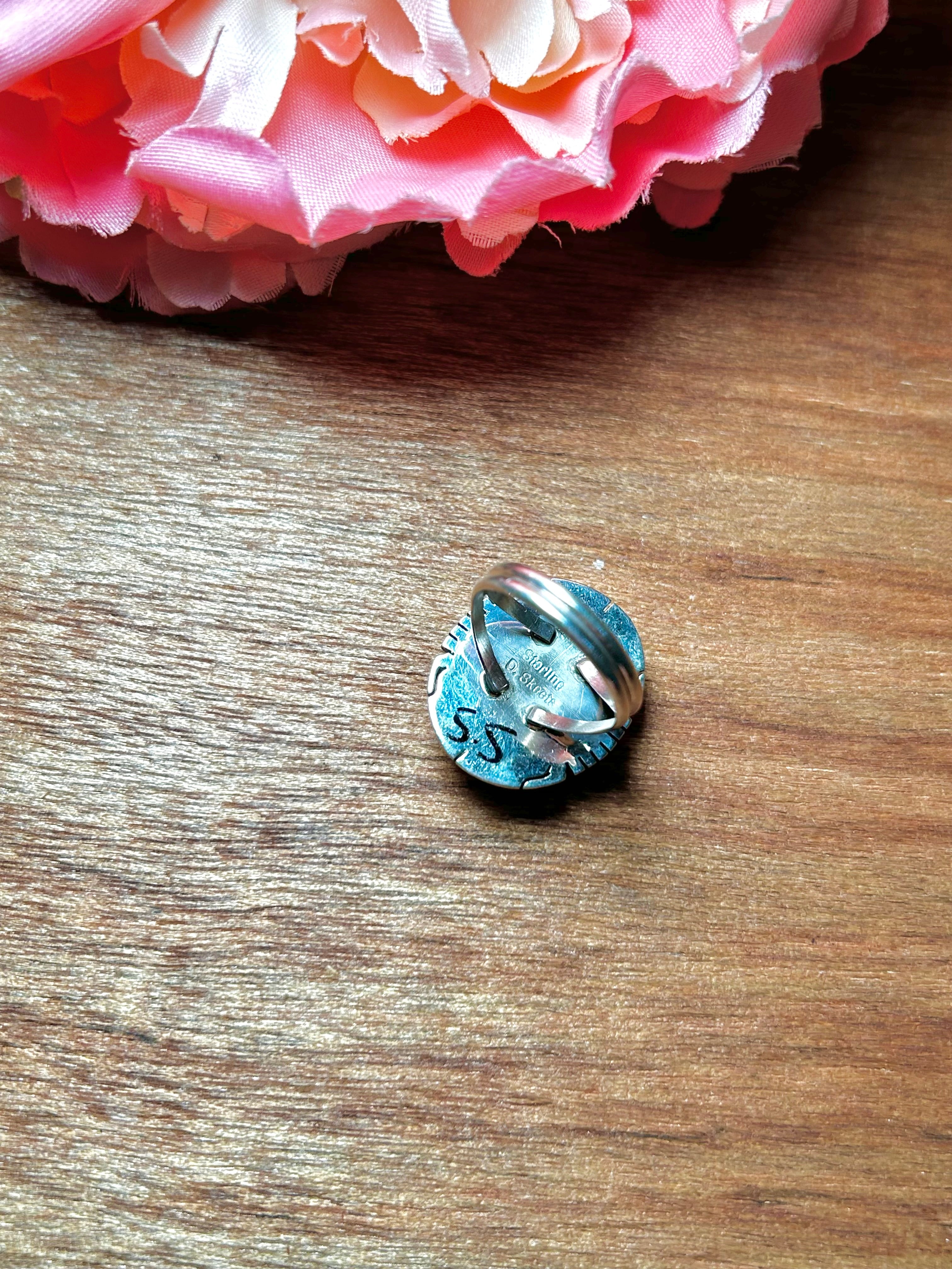 Dane Skeets Spiny Oyster & Sterling Silver Ring. It measures 7/8 of an inch long and 3/4 of an inch wide. Stamped sterling silver and signed. Stones will vary due to natural stones.