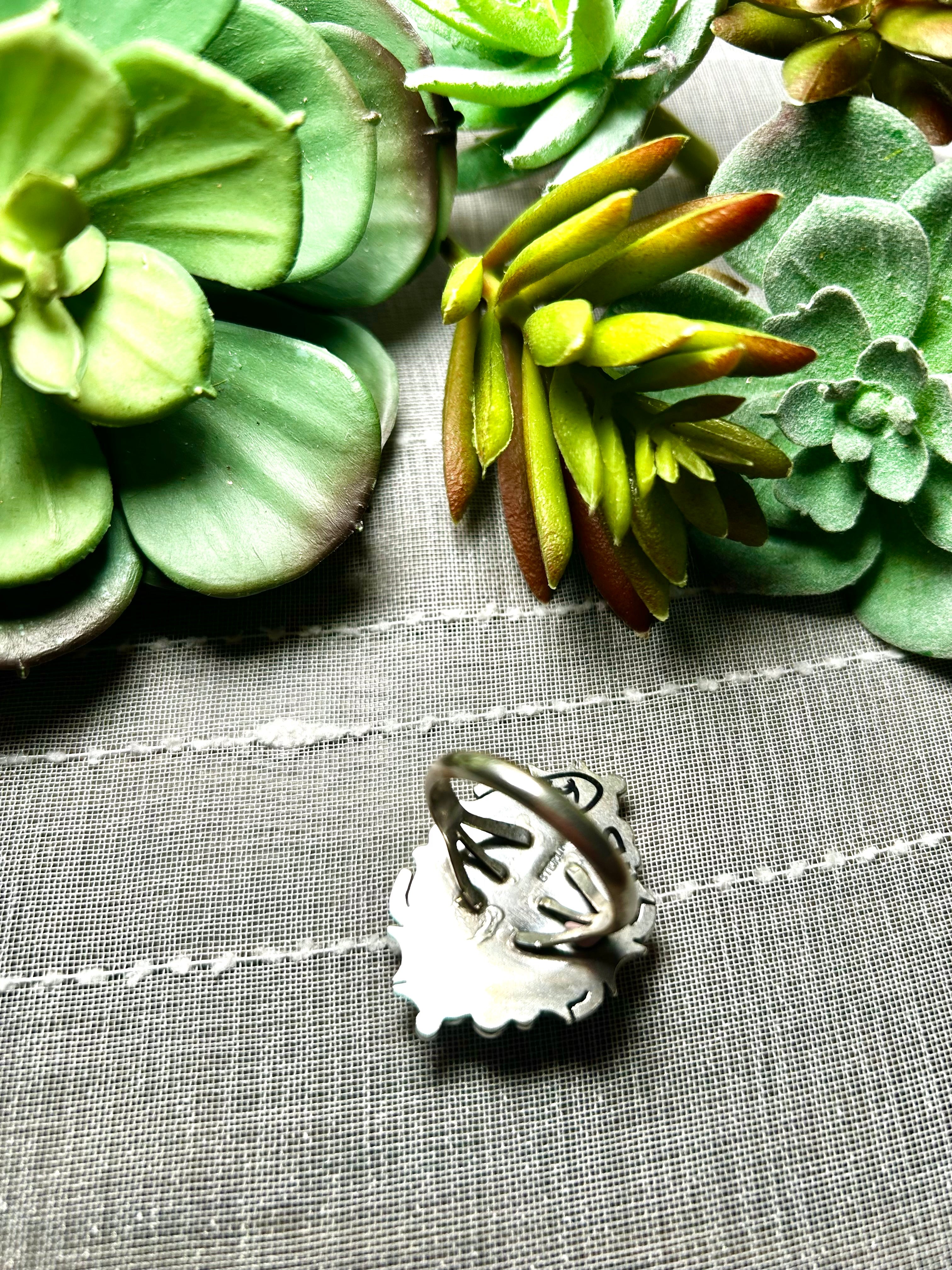 Daniel Benally Kingman Turquoise & Sterling Silver Ring Size 10. It measures 1 1/2 inches long and 7/8 of an inch wide. Signed by the artist and stamped sterling silver.