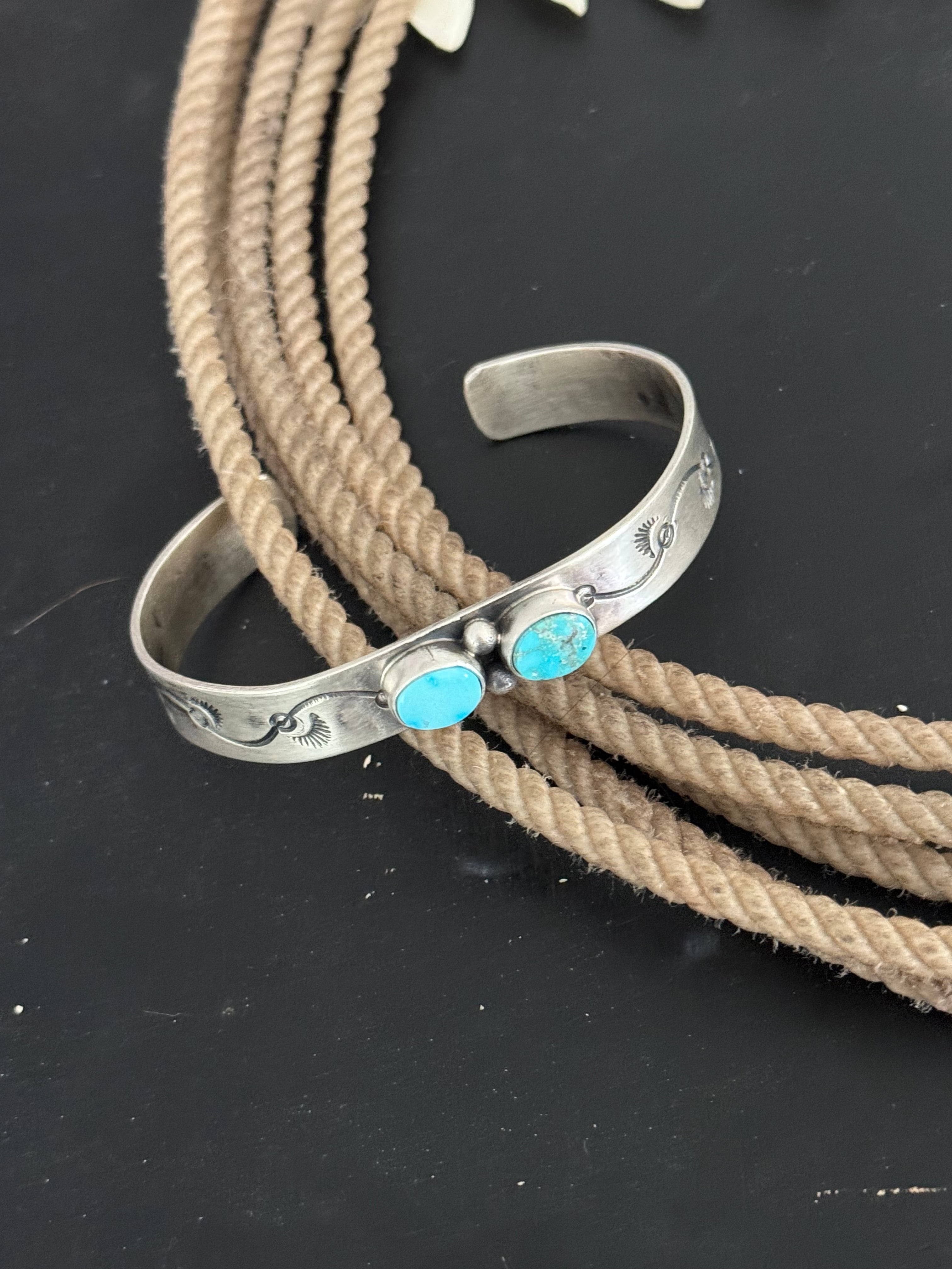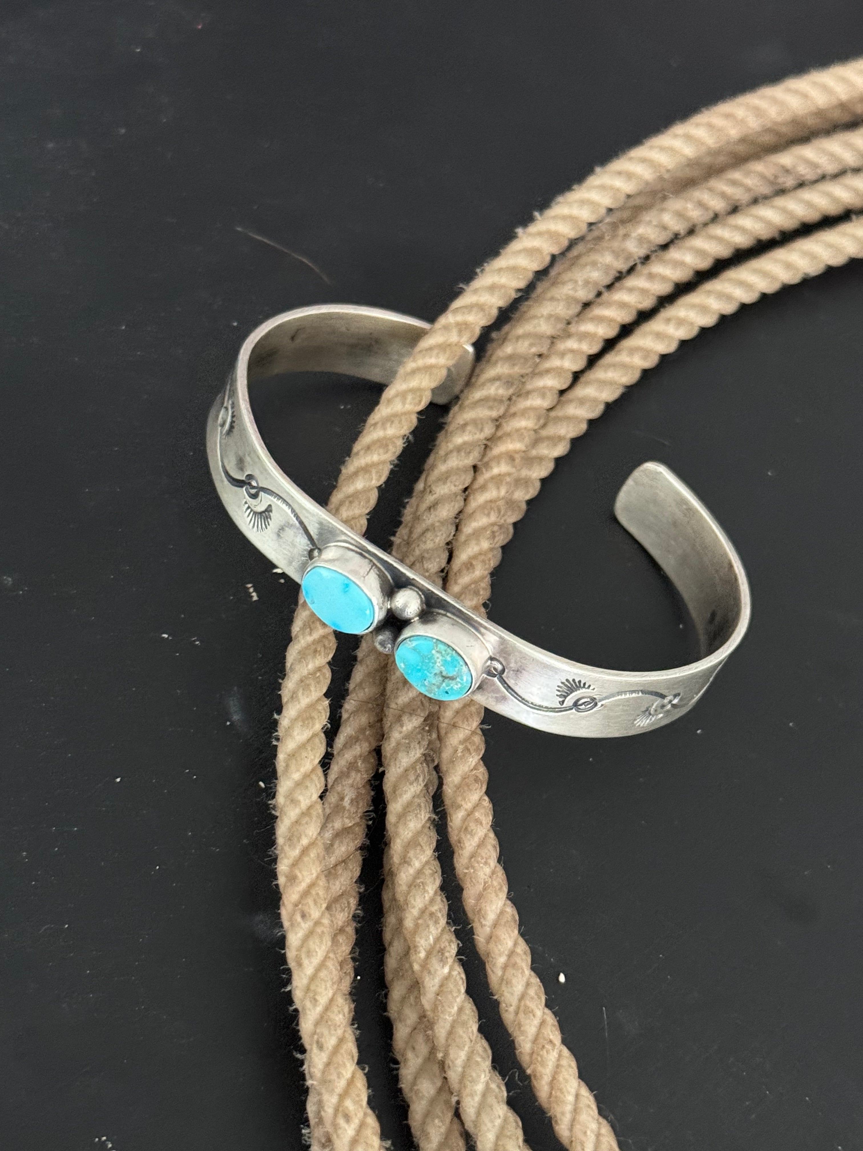 Danny Henio Blue Ridge Turquoise & Sterling Silver Cuff Bracelet. It measures 3/8 of an inch wide with an inside circumference of 5 3/4 inches and a gap of 1 inch. Stamped sterling silver and signed by the artist.
