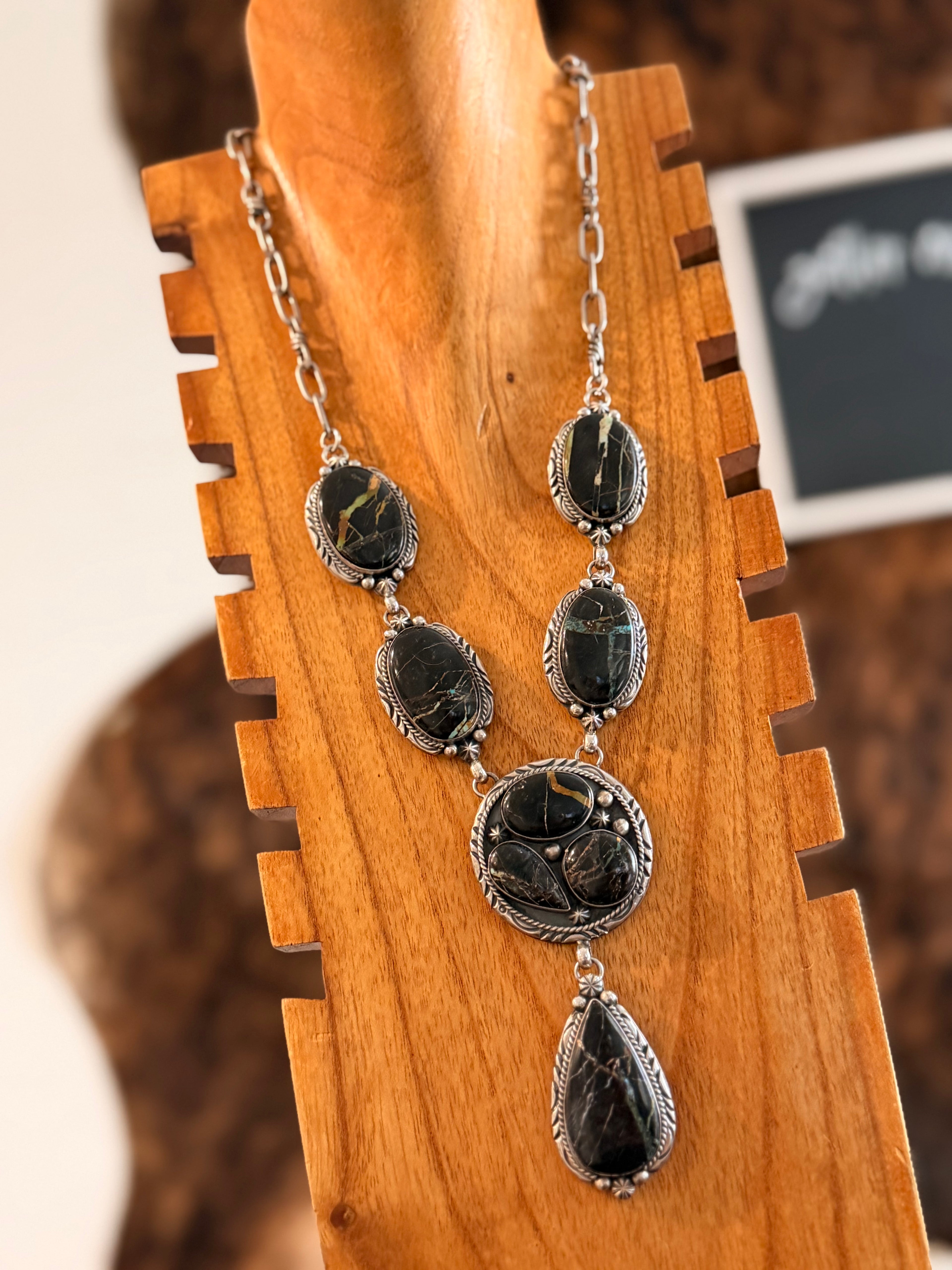 J Piasso Jr Black Jack Turquoise & Sterling Silver Lariat Cluster Necklace. It measures 32 inches long with hang while the chain measures 22 inches long. Signed by the artist and stamped sterling silver.