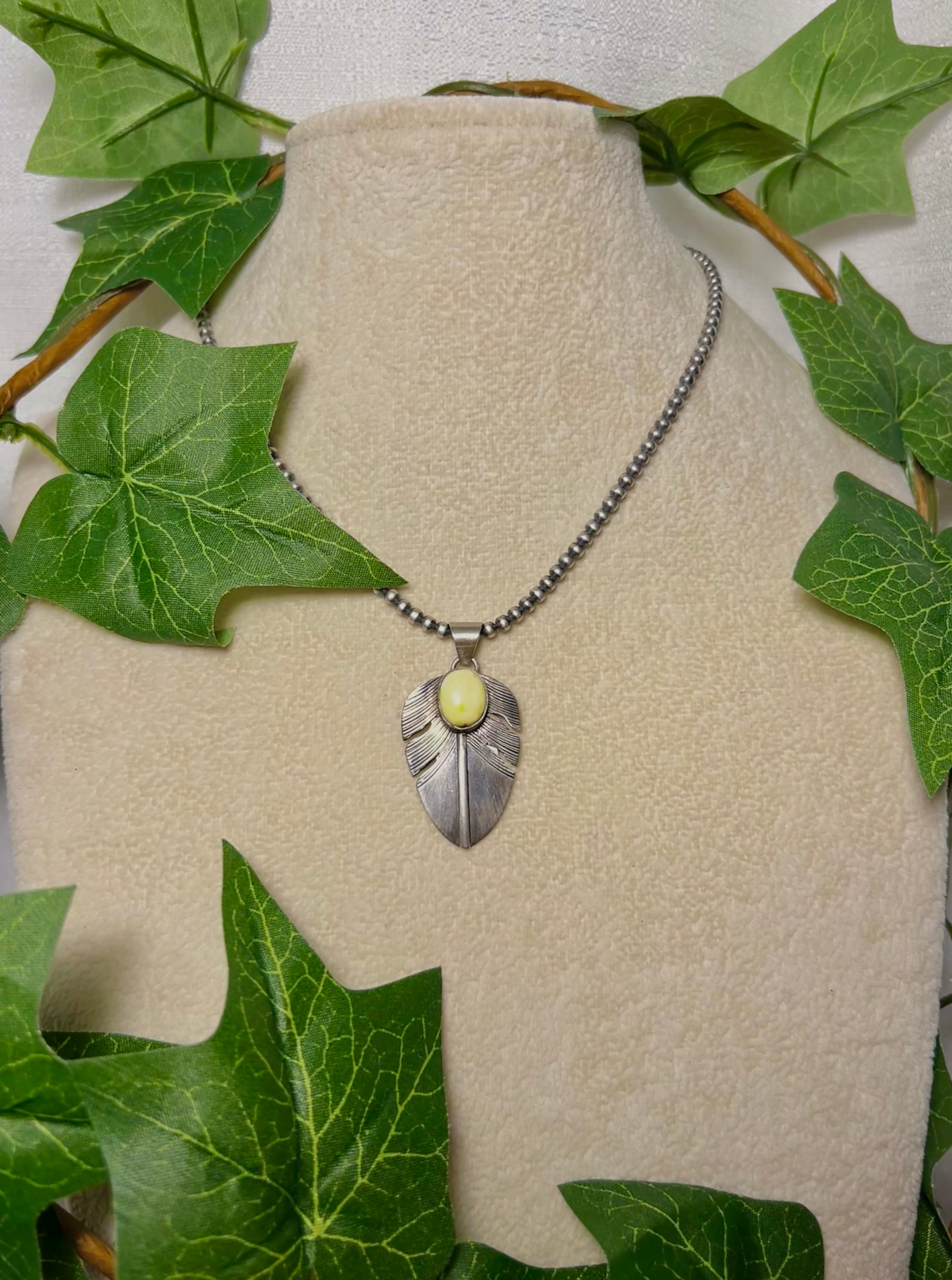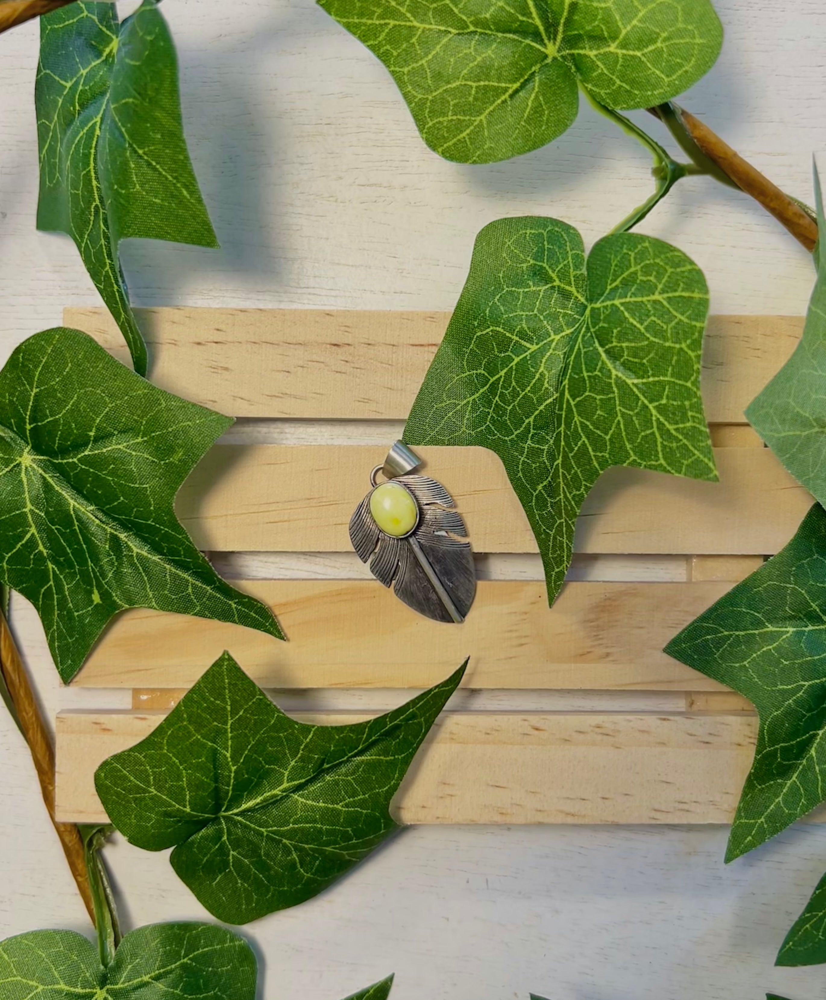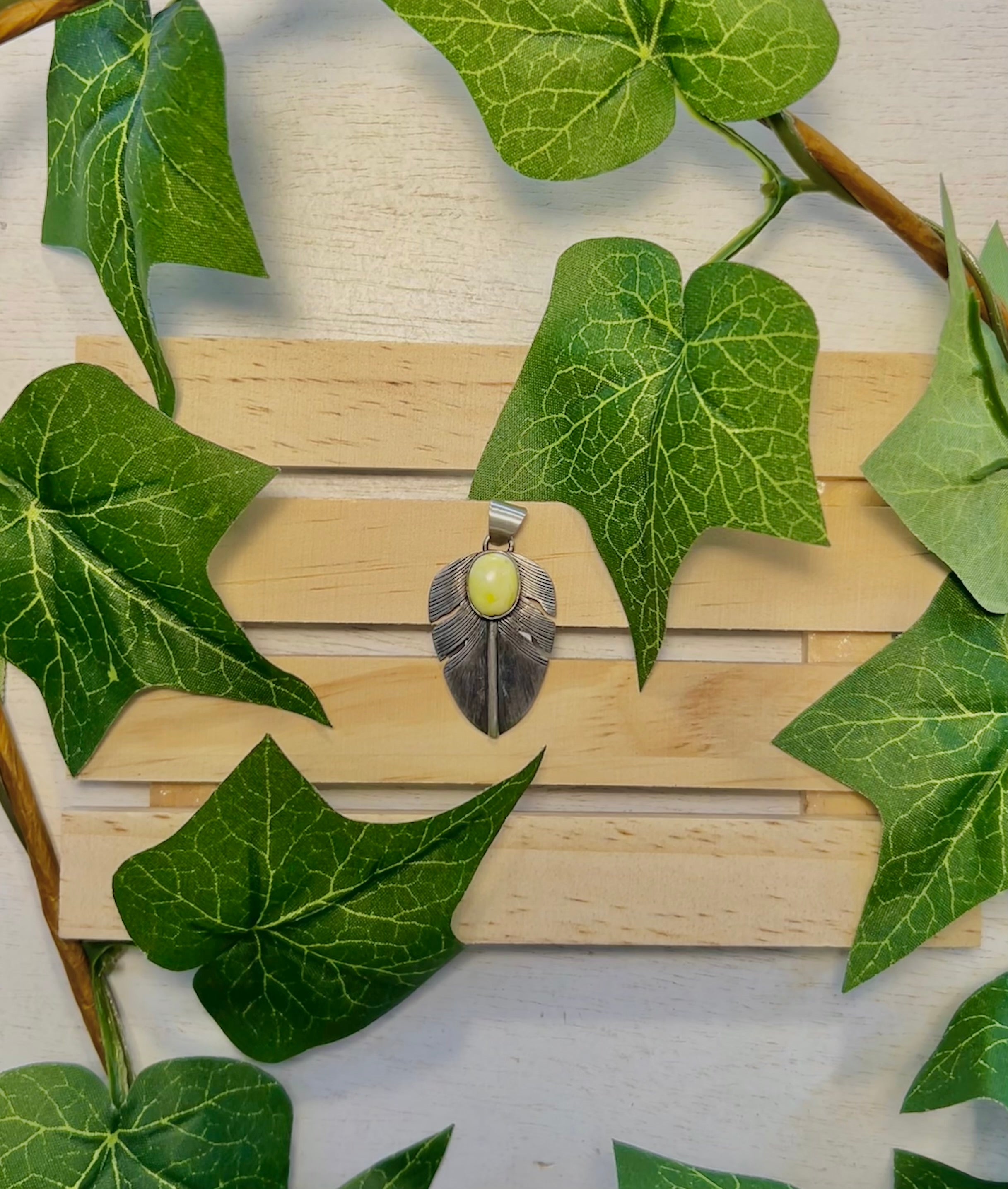 Darrell Wylie Sonora Palomino Variscite & Sterling Silver Feather Pendant. It measures 2 inches long and 1 1/4 of an inch wide. Pendant Only!! Signed by the artist and stamped sterling silver.