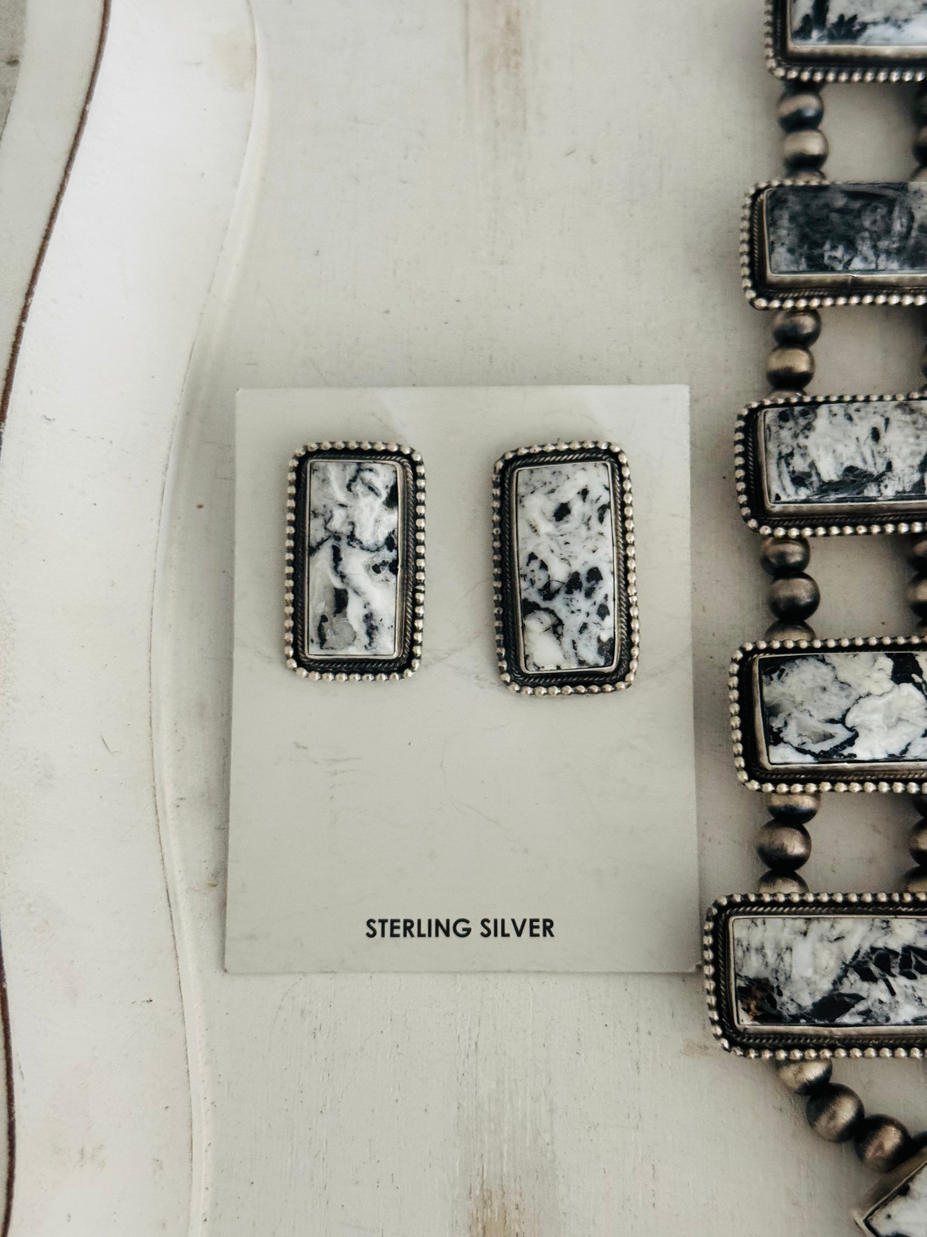 Beautiful Necklace and Earring set. Darrin Livingston White Buffalo & Sterling Silver Squash Blossom Necklace Set. It measures 38 inches long with hang while the chain measures 32 inches long. Signed by the artist and stamped sterling silver.