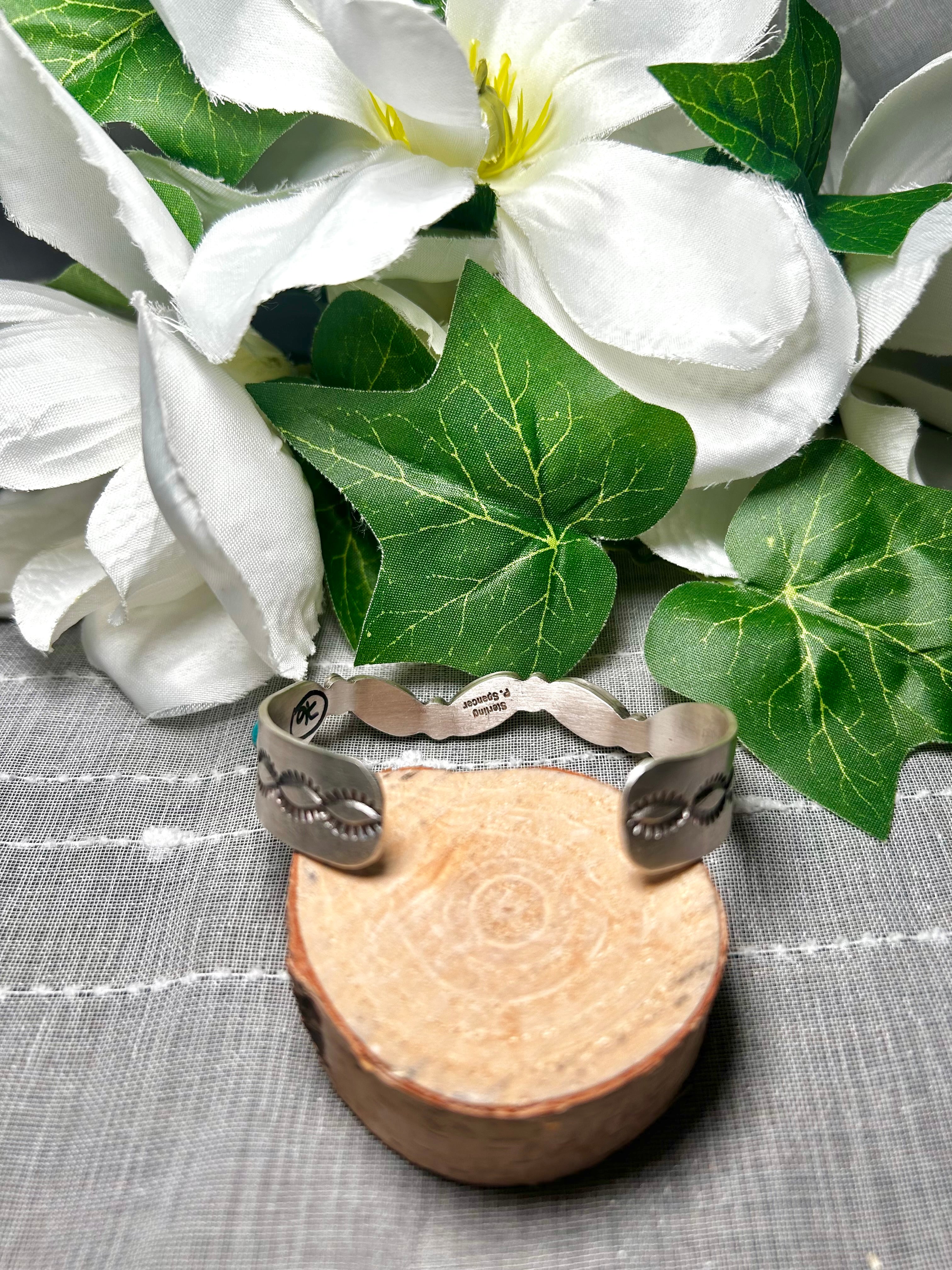 Pearline Spencer Mohave Turquoise & Sterling Silver Cuff Bracelet. It measures 3/8 of an inch wide with an inside circumference of 5 3/4 inches and a gap of 1 1/8 inches. Signed by the artist and stamped sterling silver.