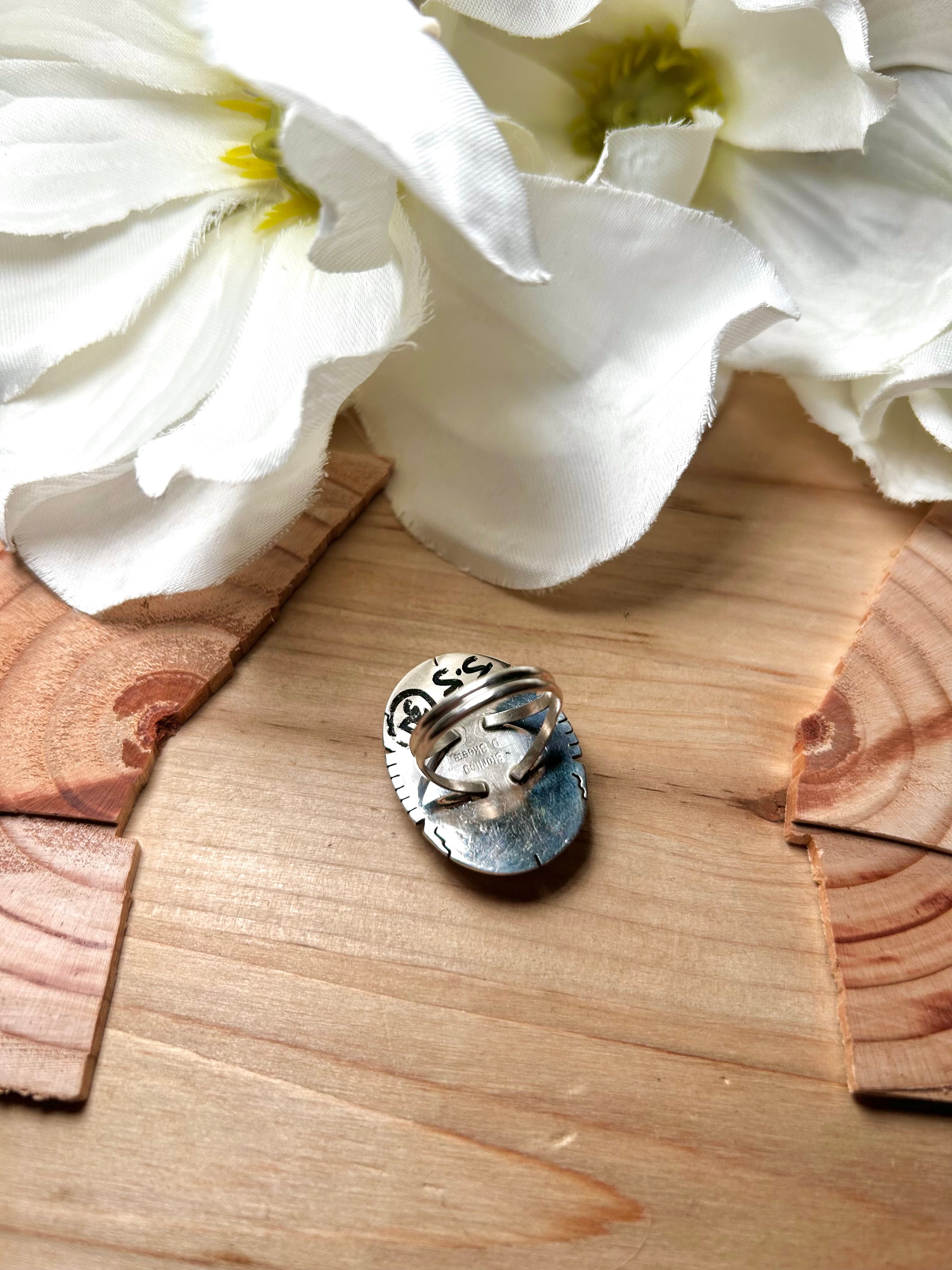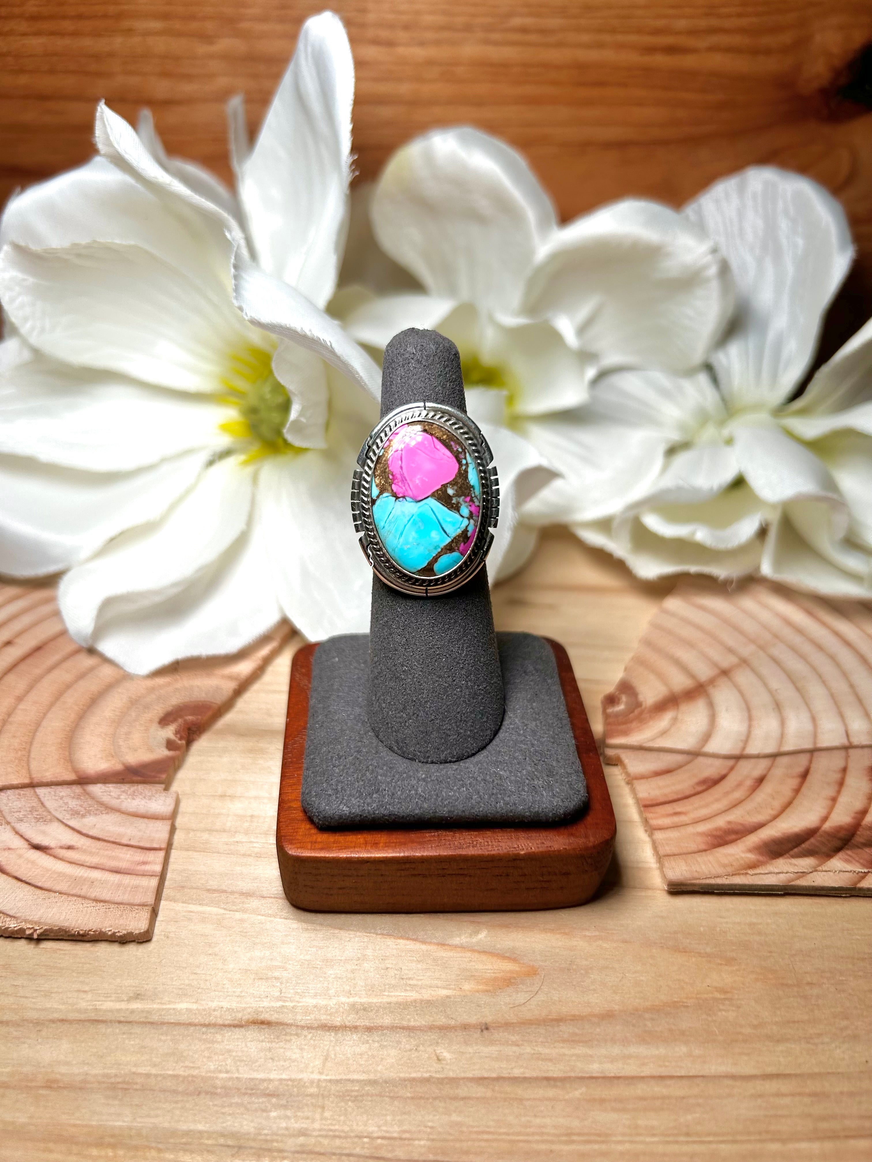 Dave Skeets Cotton Candy Dahlia & Sterling Silver Ring Size 5.75. It measures 1 1/8 inches long and 7/8 of an inch wide. Signed by the artist and stamped sterling silver.