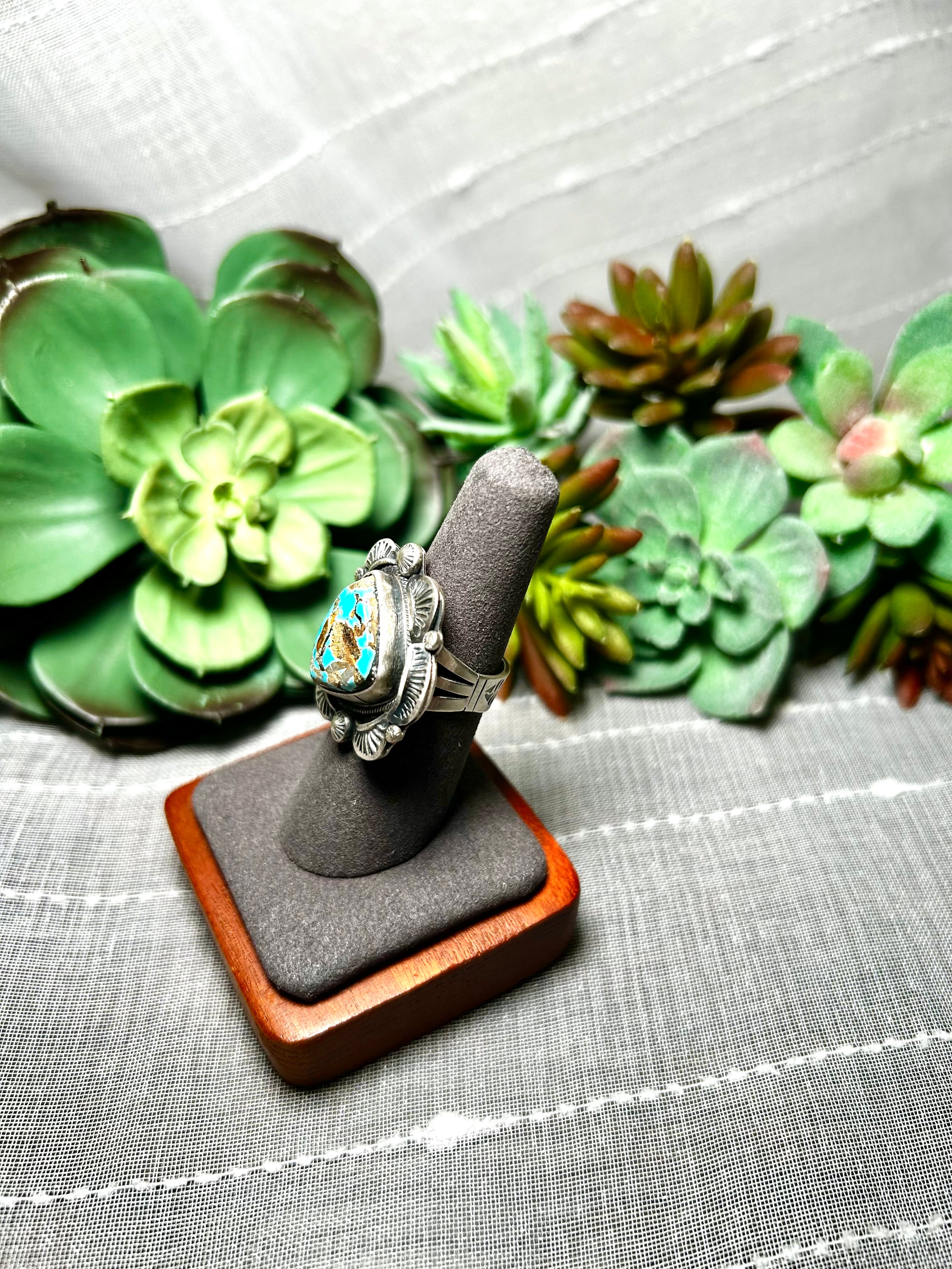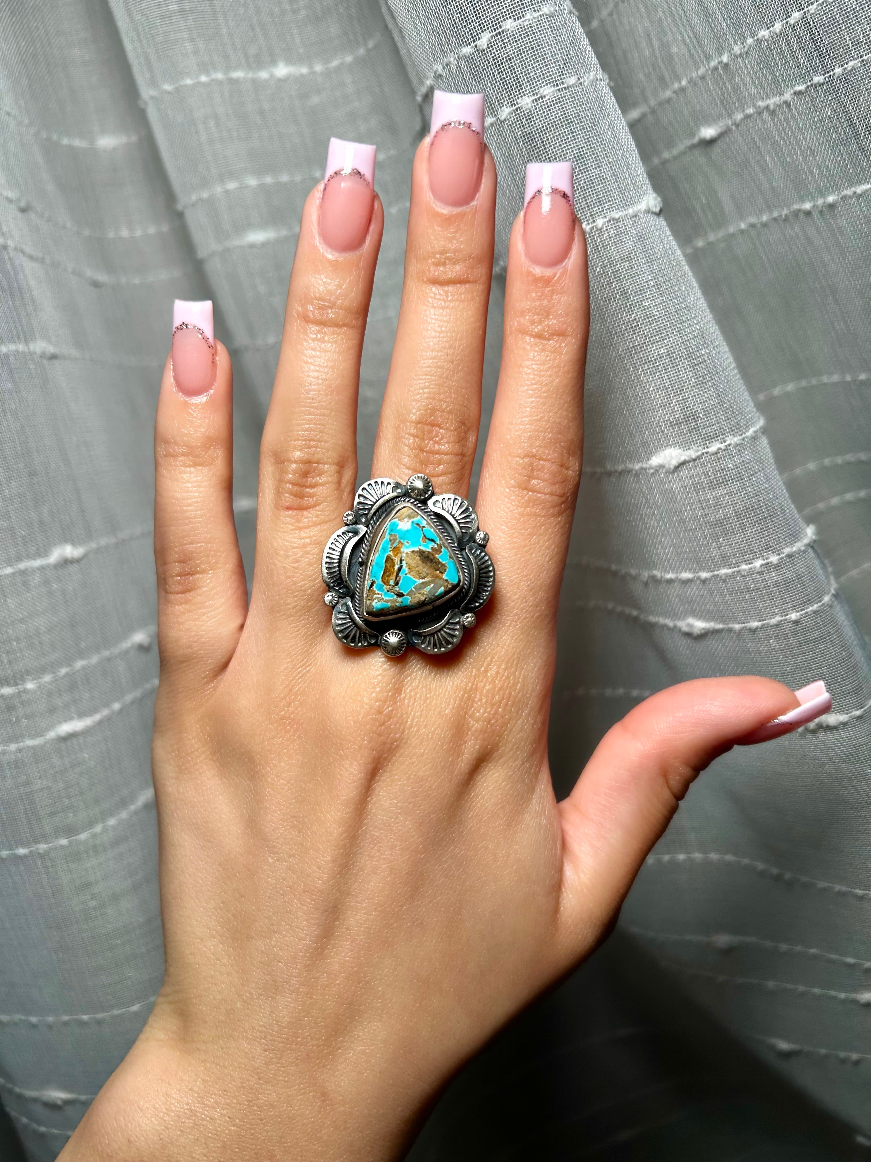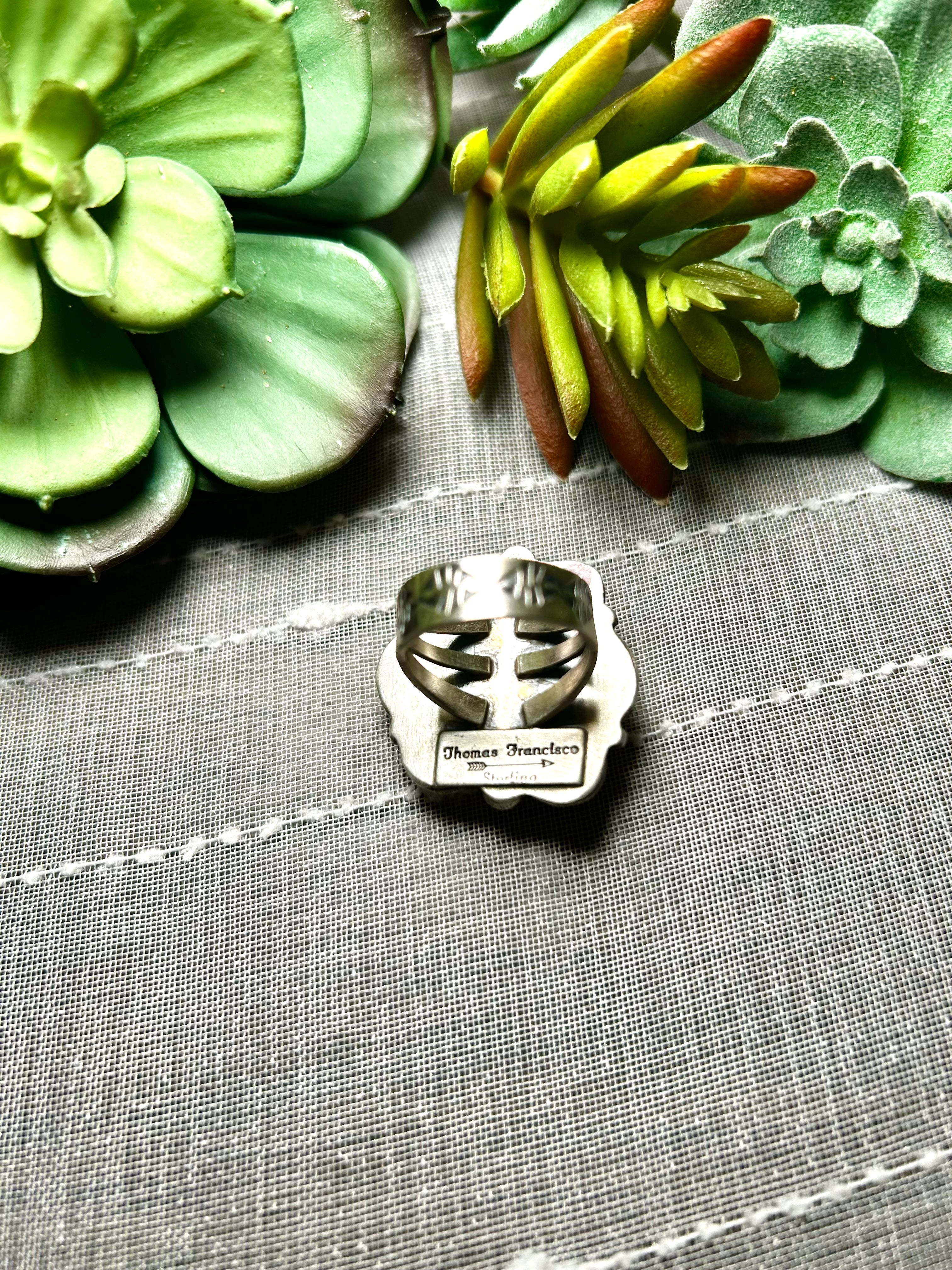 Thomas Francisco Royston Turquoise & Sterling Silver Ring Size 7.75. It measures 1 1/8 inches long and 1 inch wide. Signed by the artist and stamped sterling silver.