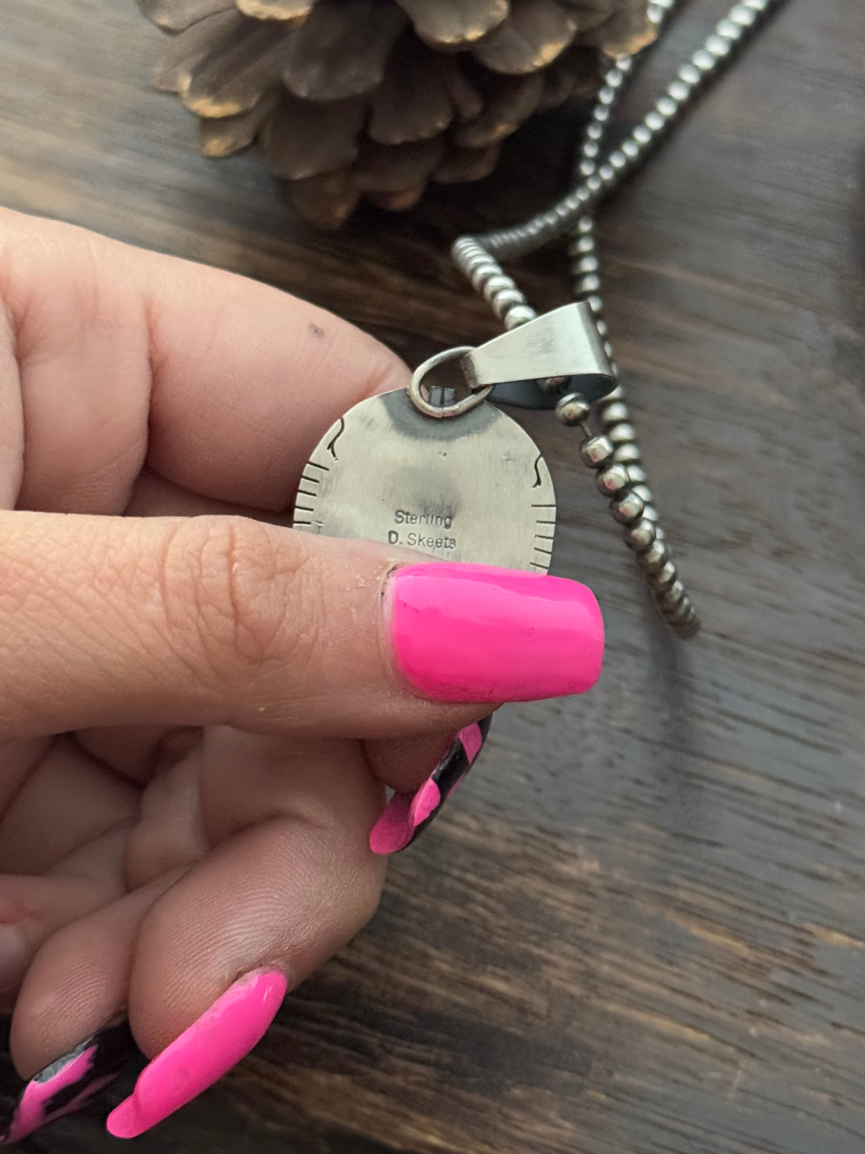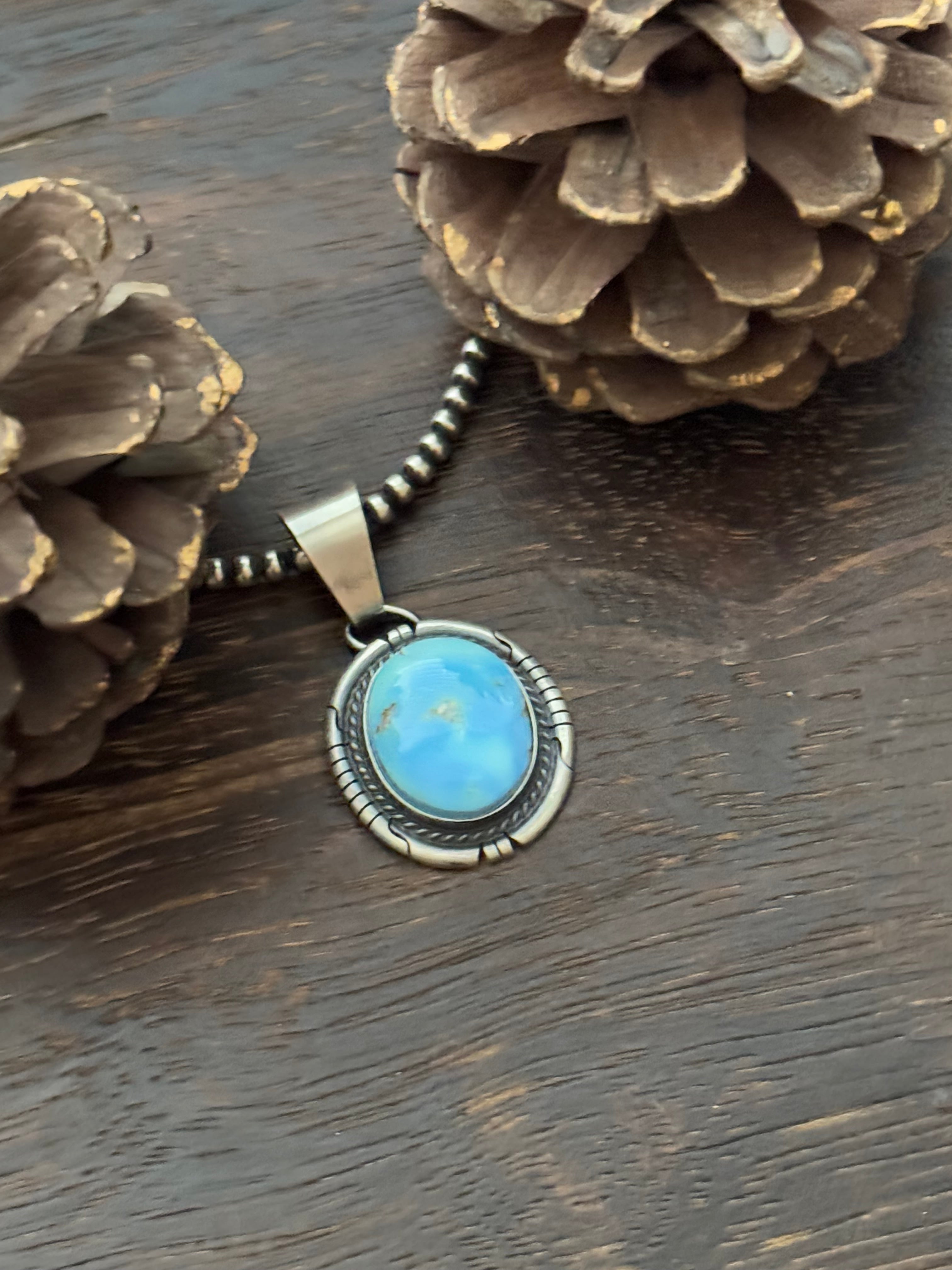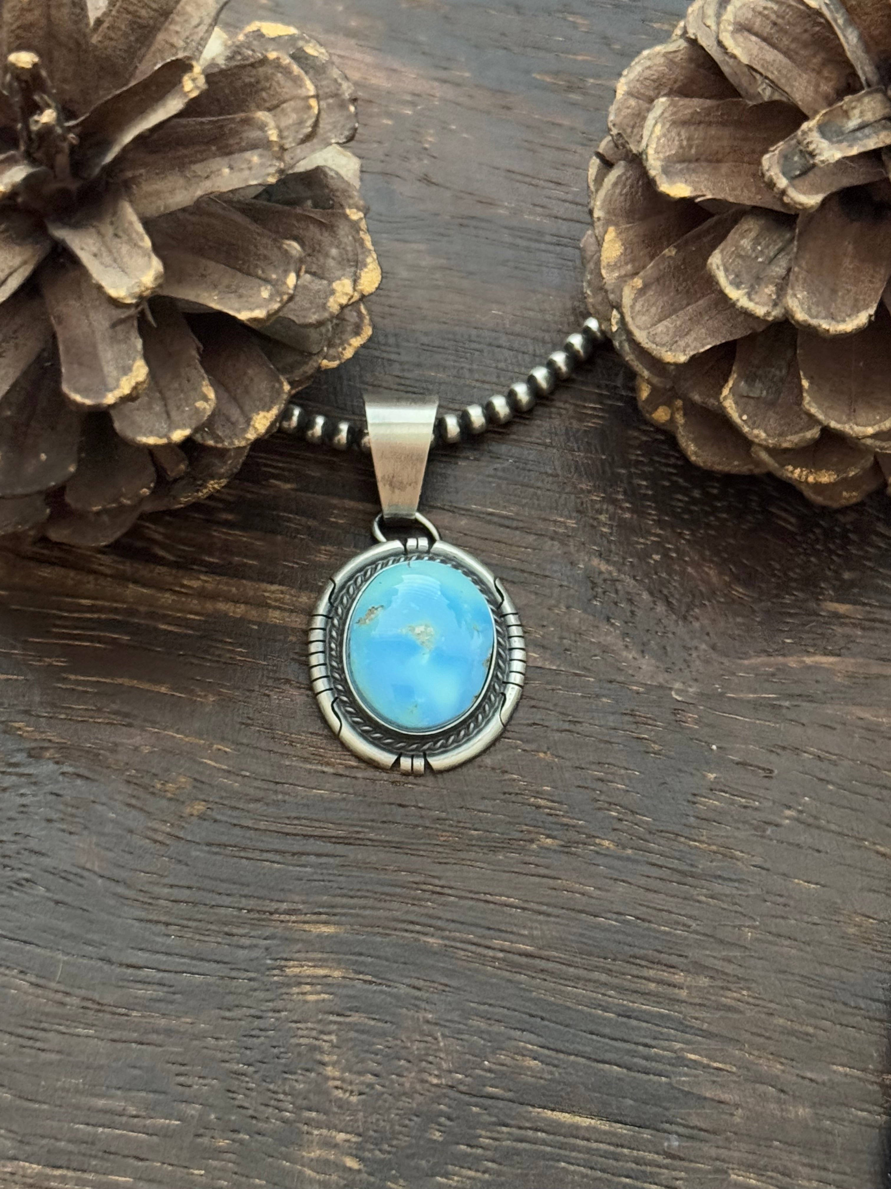 Dave Skeets Golden Hills Turquoise & Sterling Silver Pendant. It measures 1 5/8 inches long and 7/8 of an inch wide. Pendant Only!! Signed by the artist and stamped sterling silver.