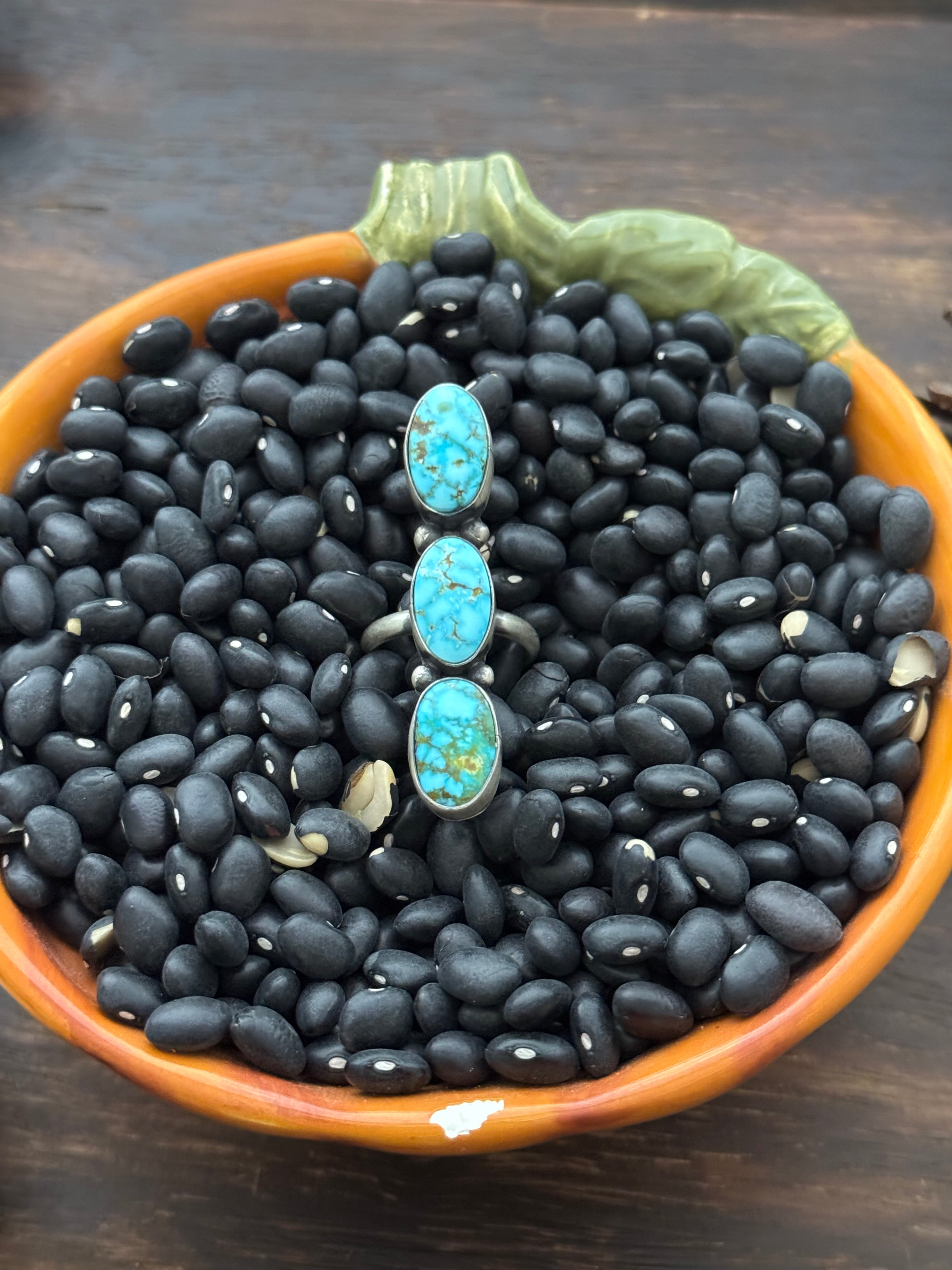 A stunning piece. Dave Skeets Birdseye Kingman Turquoise and Sterling Silver Ring Size 8.25. It measures 2 inches long and 1/2 of an inch wide. Signed by the artist and stamped sterling silver.