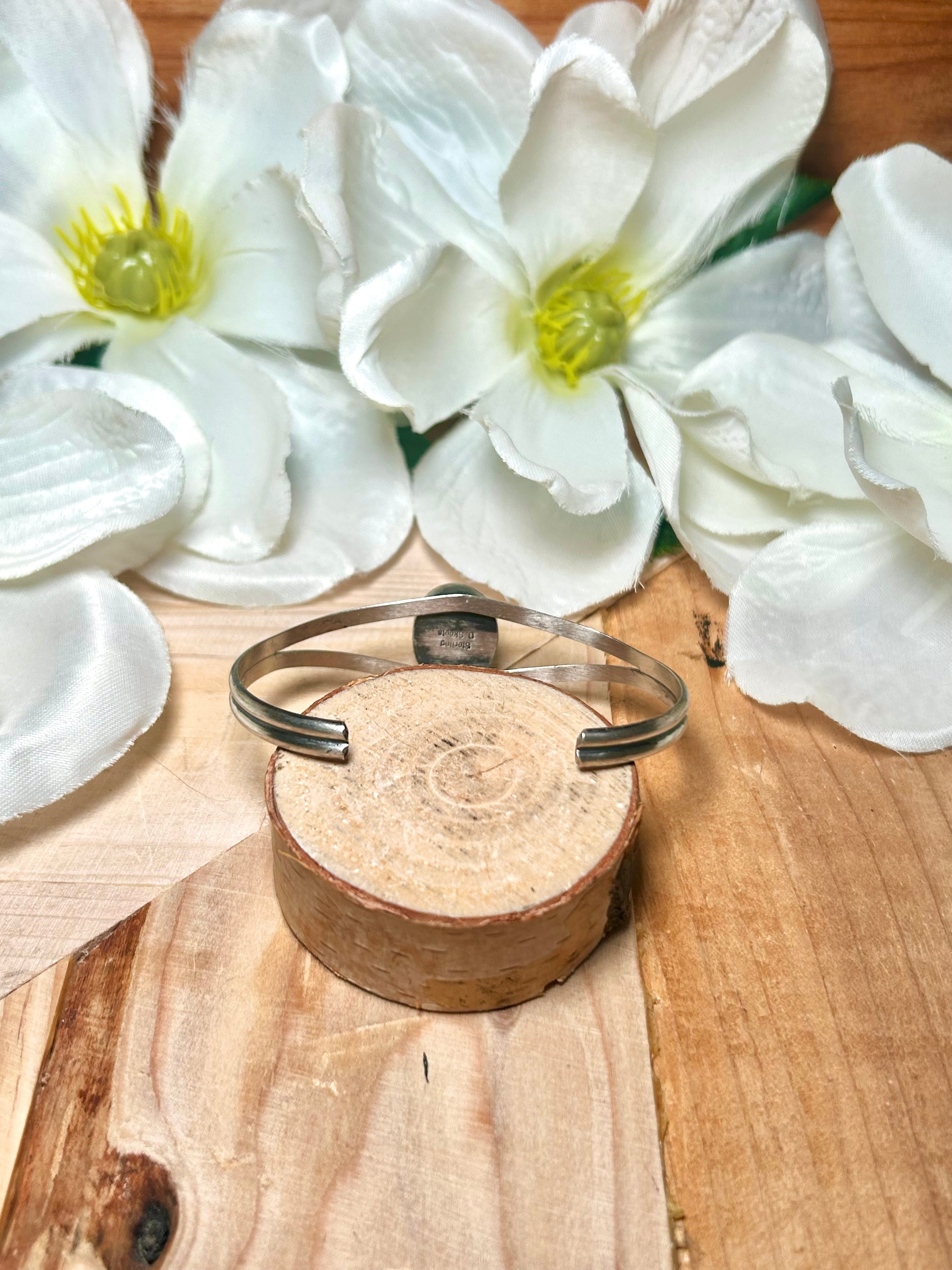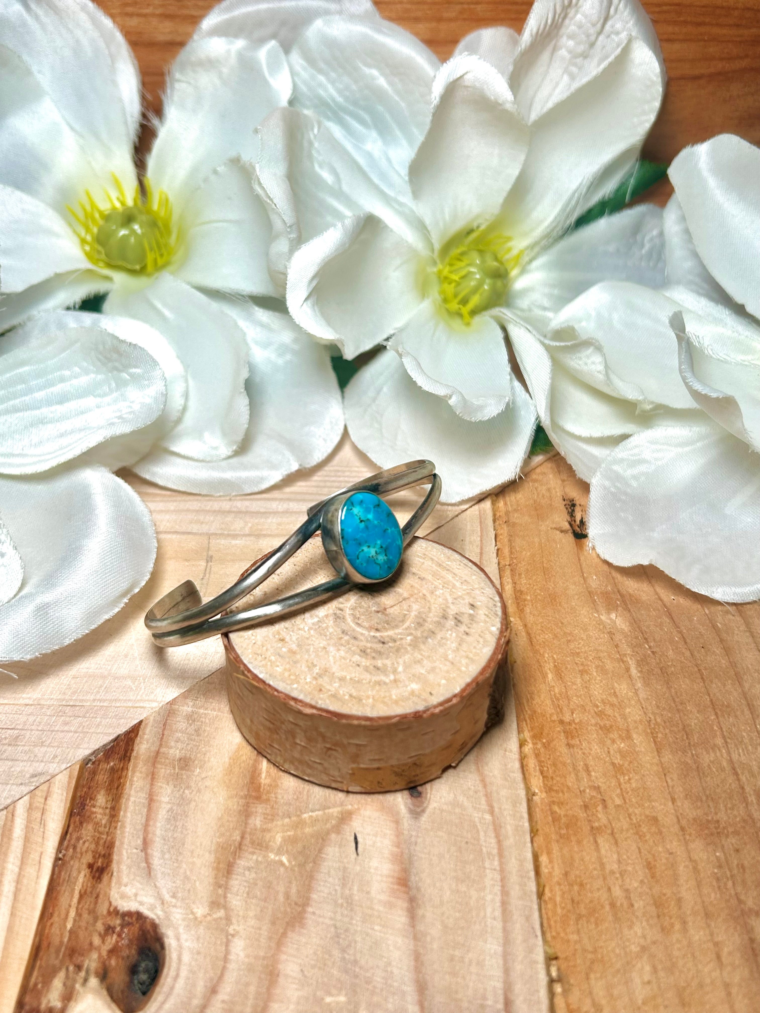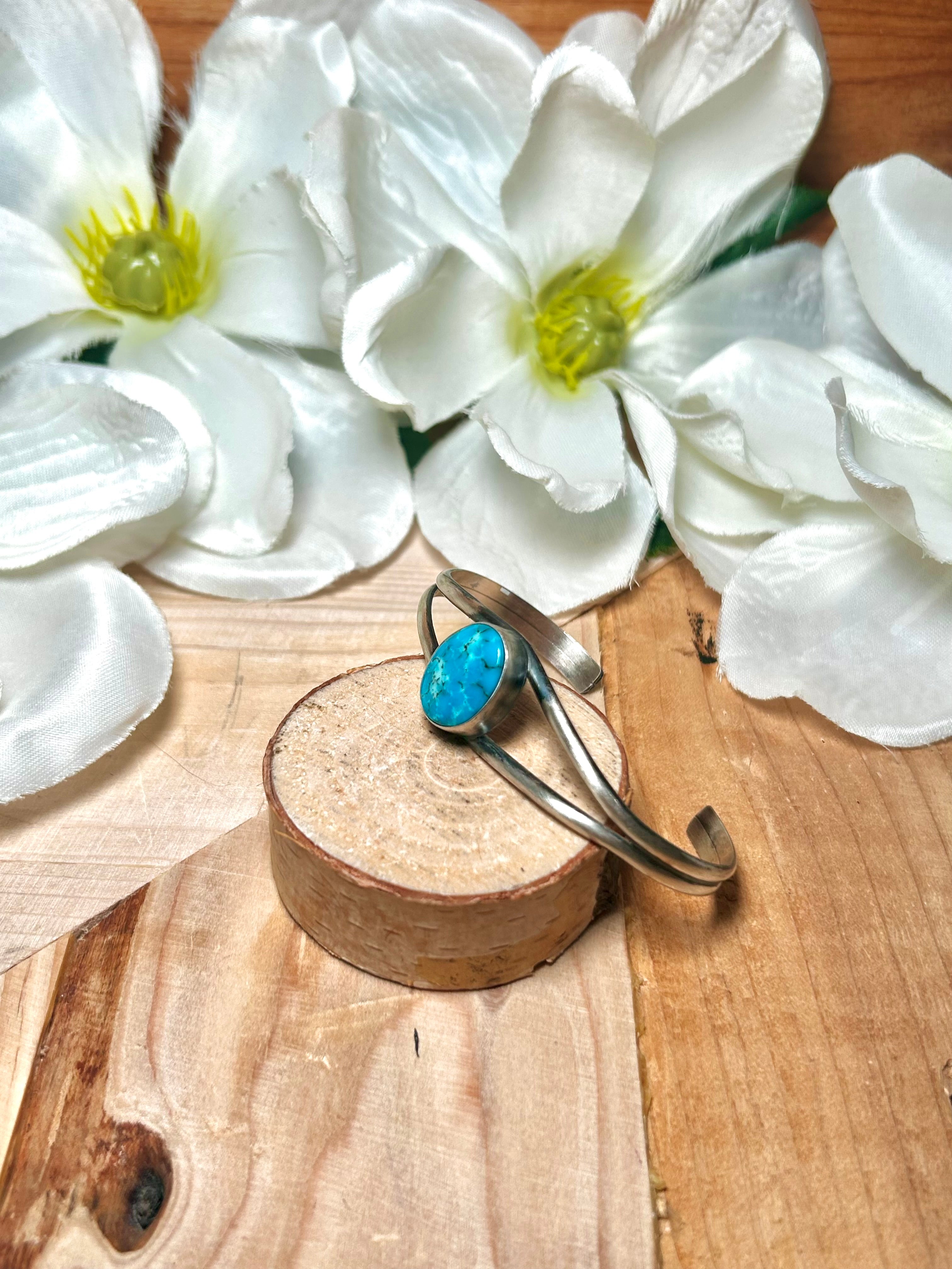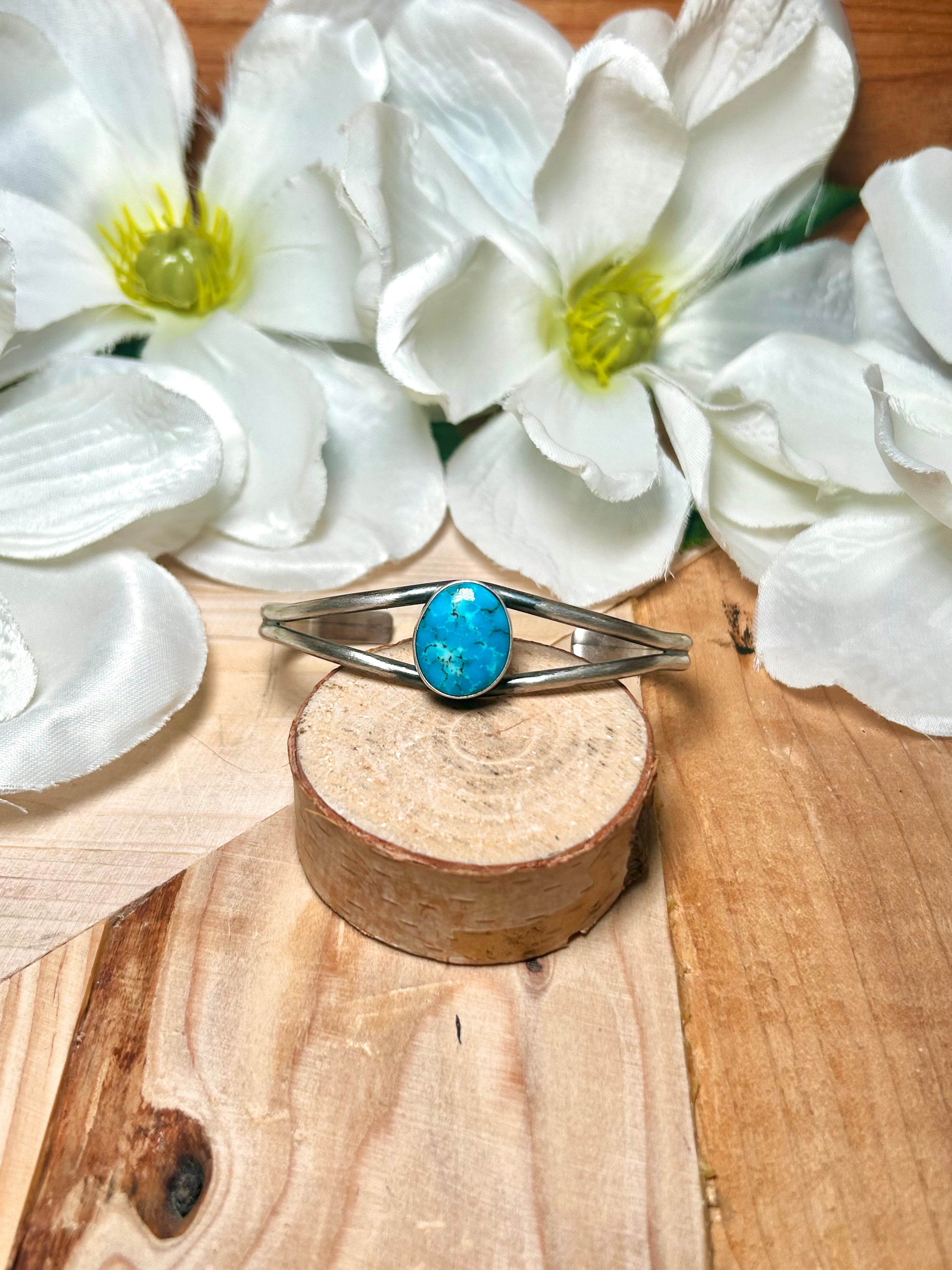 Dave Skeets Kingman Turquoise & Sterling Silver Cuff Bracelet. It measures 3/4 of an inch wide with an inside circumference of 5 3/4 inches and a gap of 1 1/4 inches. Signed by the artist and stamped sterling silver.