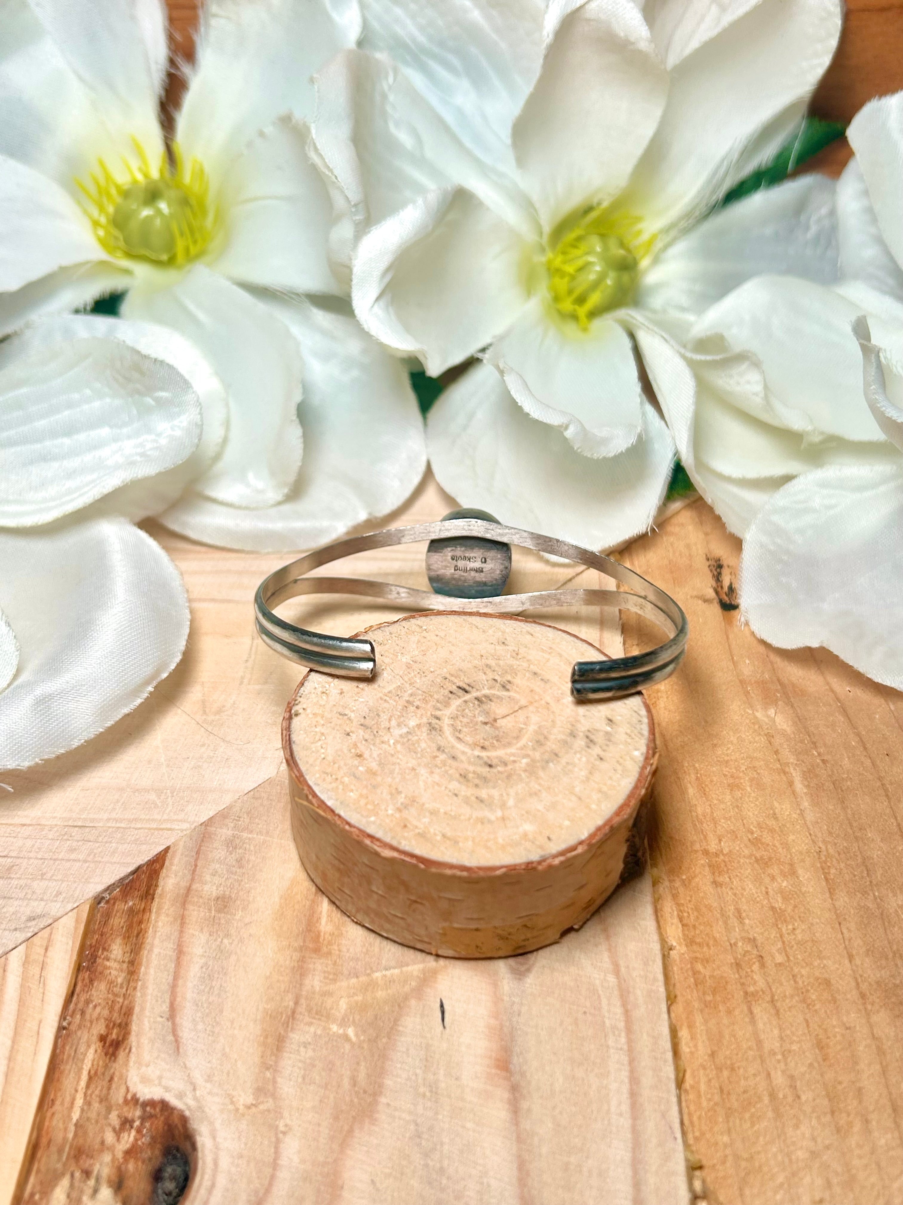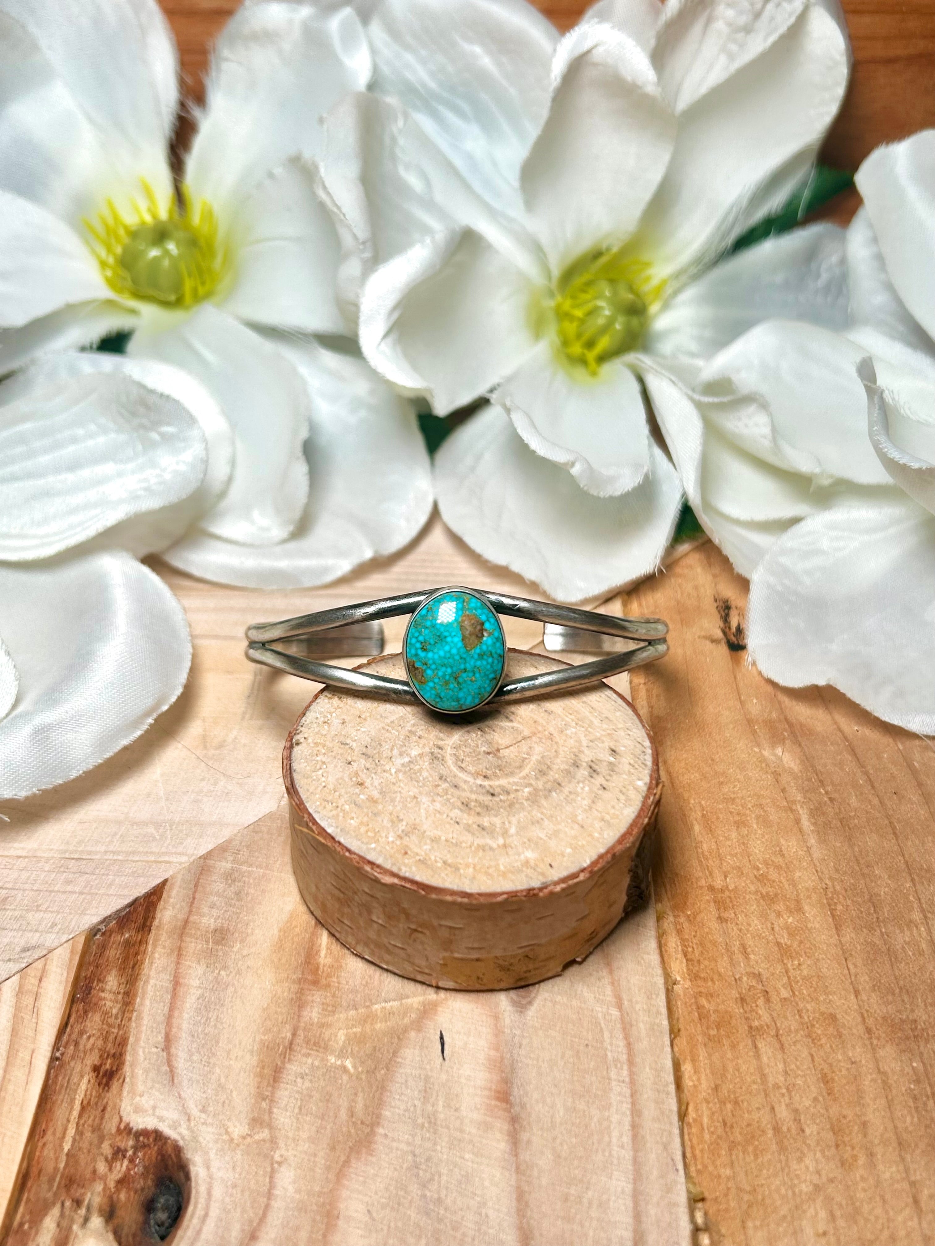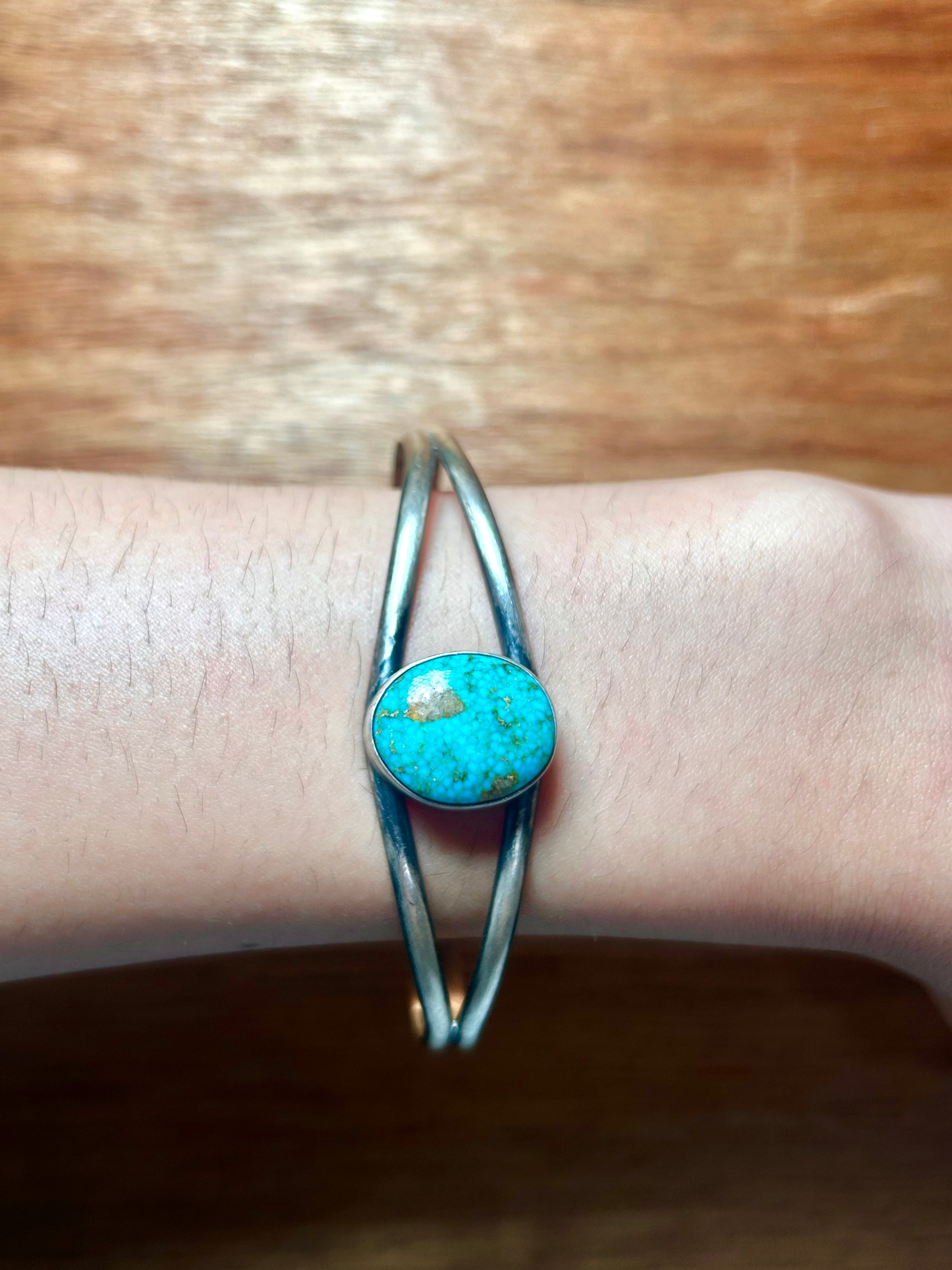 Dave Skeets Kingman Turquoise & Sterling Silver Cuff Bracelet. It measures 3/4 of an inch wide with an inside circumference of 5 3/4 inches and a gap of 1 1/4 inches. Signed by the artist and stamped sterling silver.