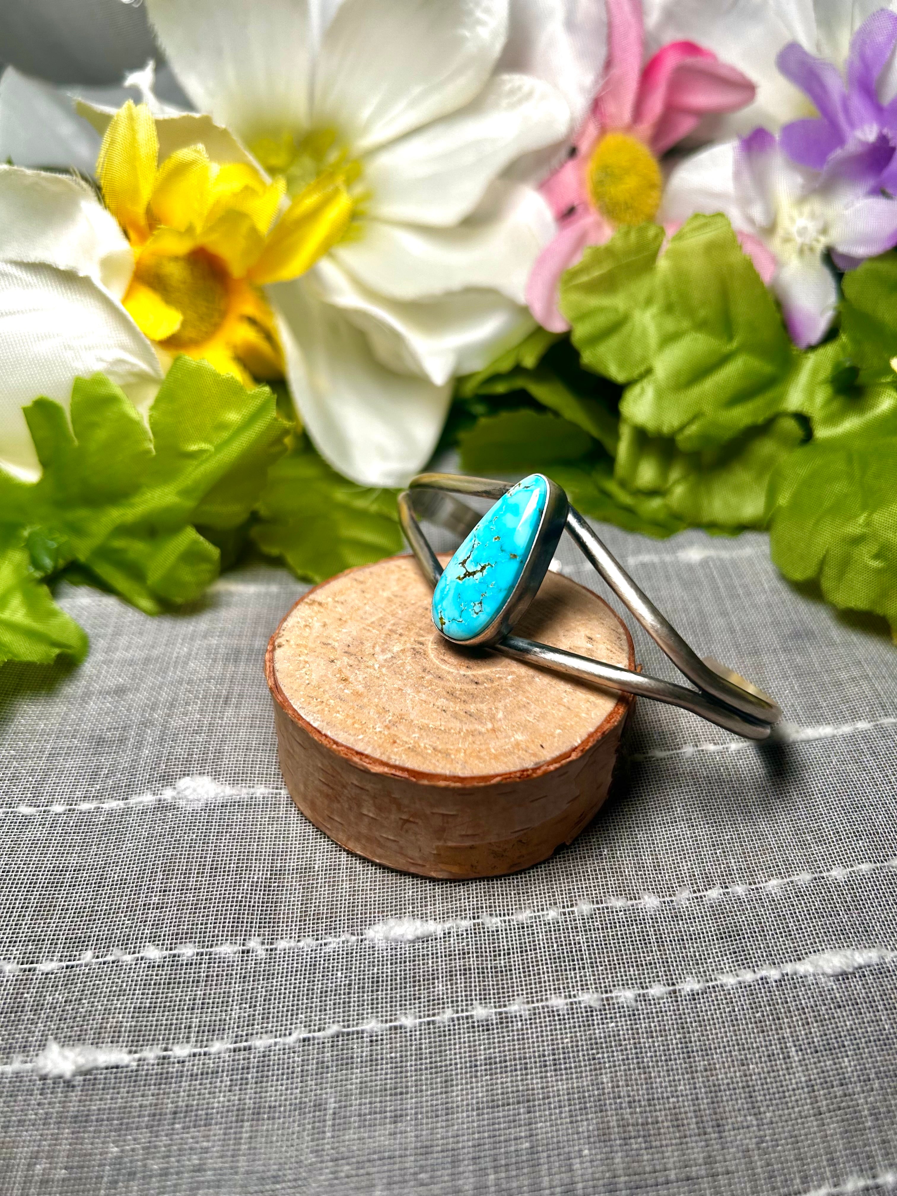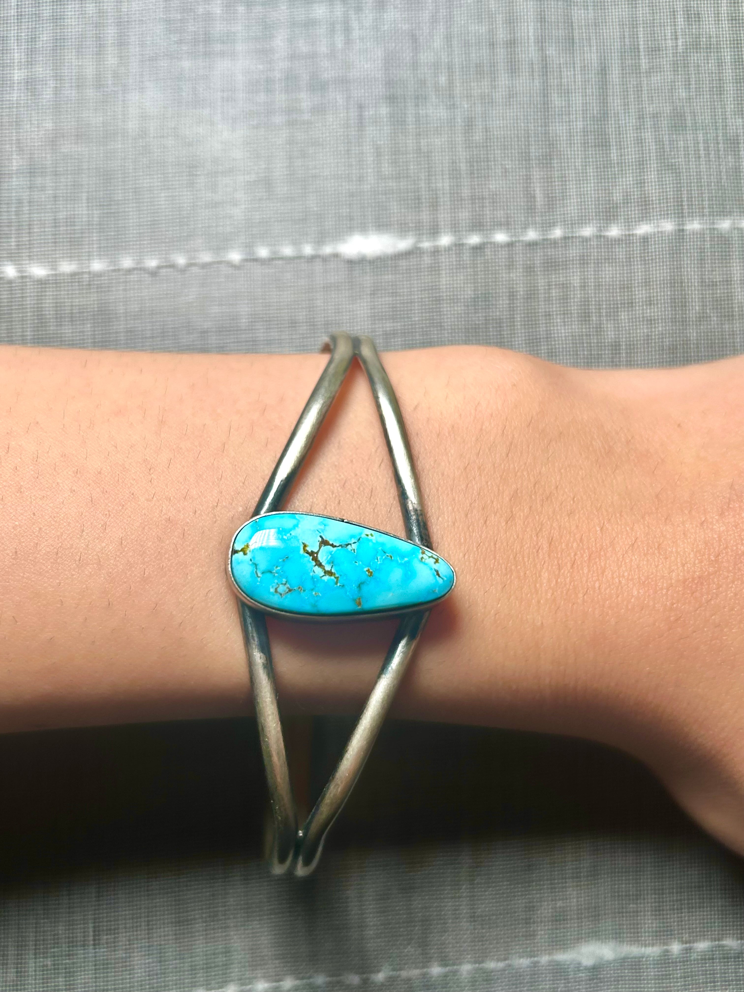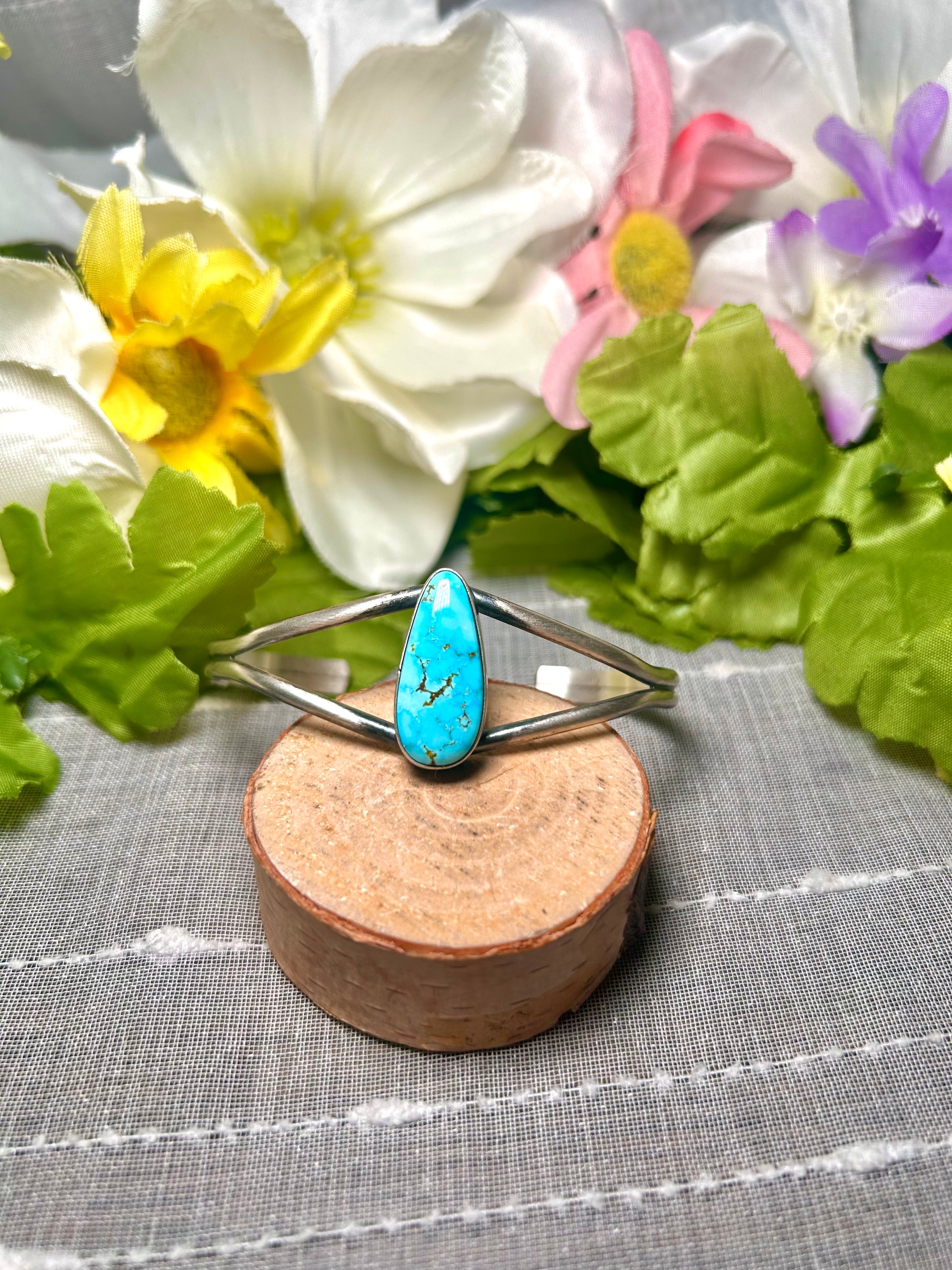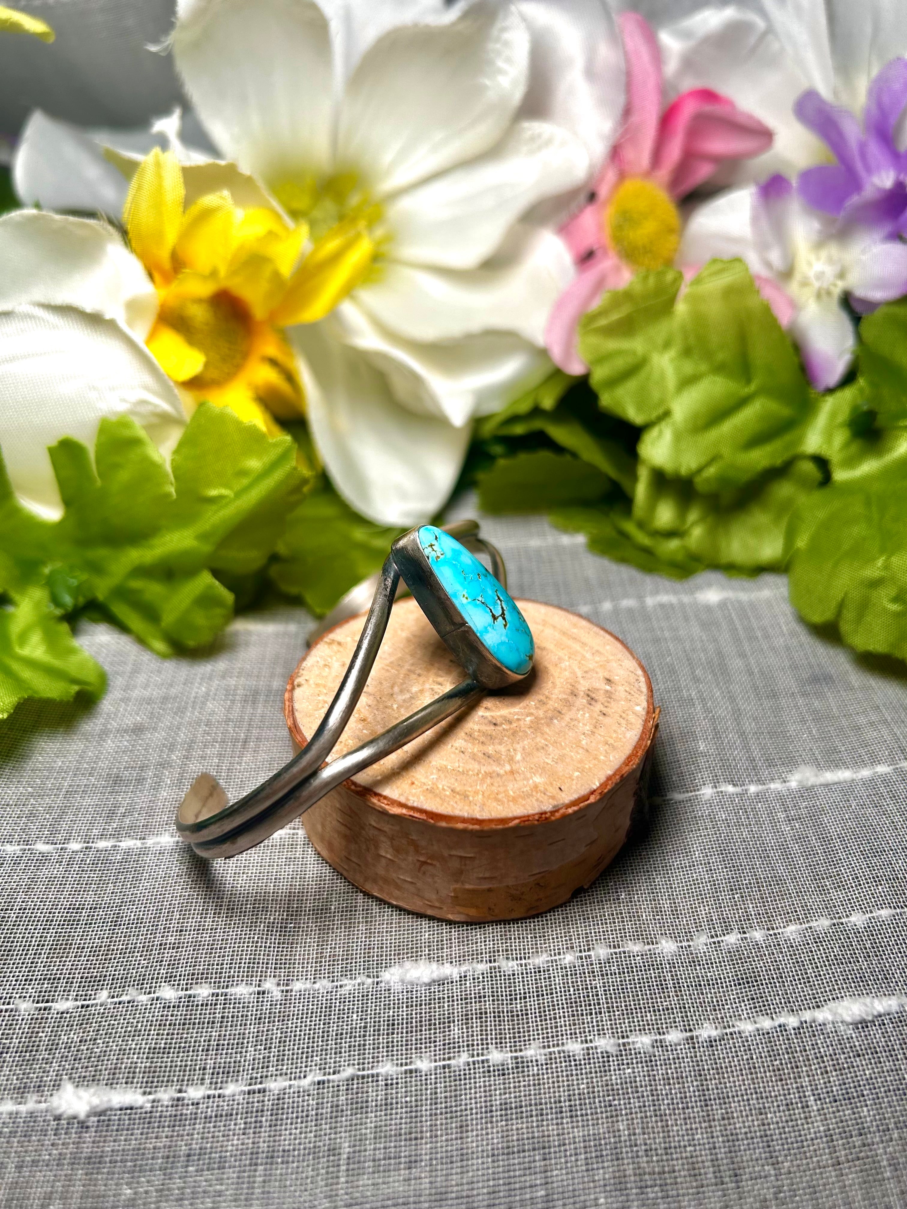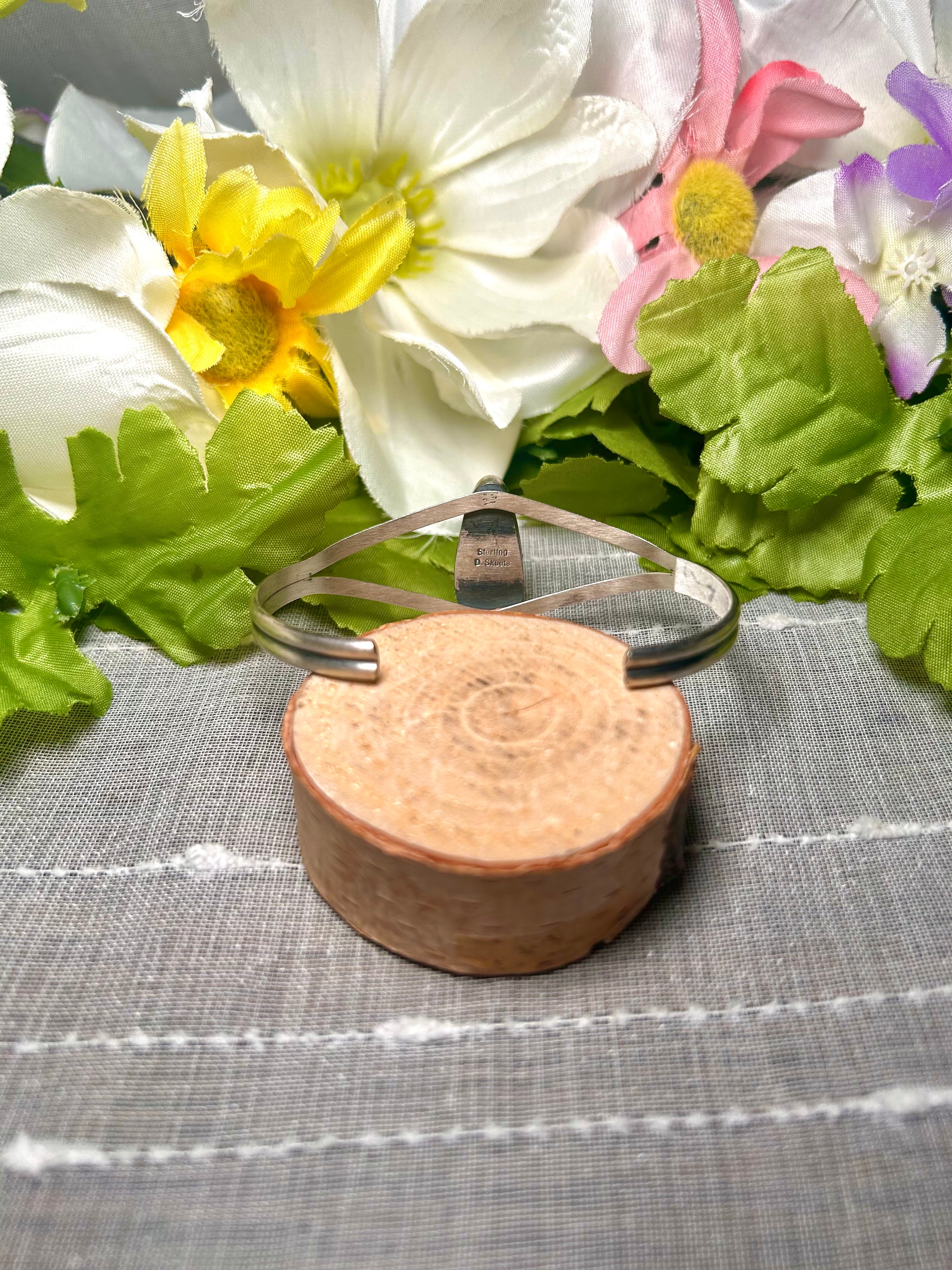 Dave Skeets Kingman Turquoise & Sterling Silver Cuff Bracelet. It measures 1 inch wide with an inside circumference of 5 3/4 inches and a gap of 1 1/4 inches. Signed by the artist and stamped sterling silver.