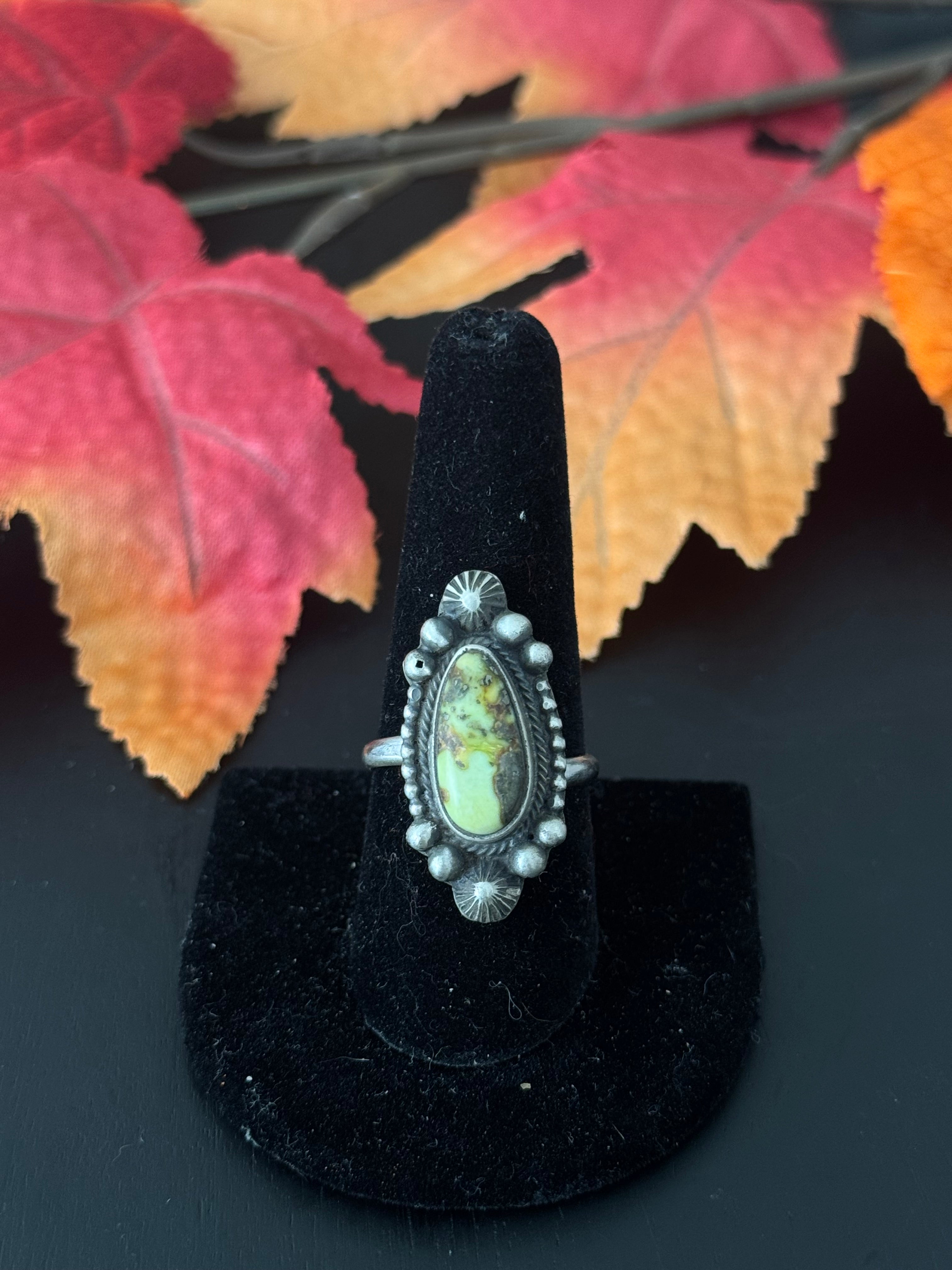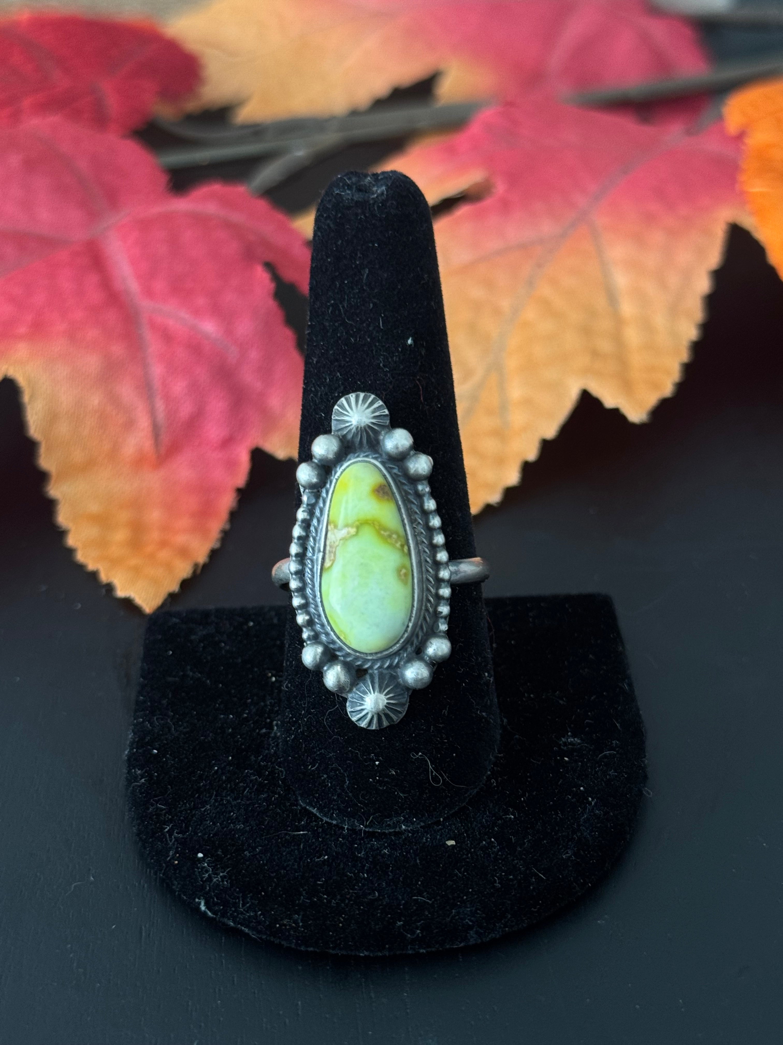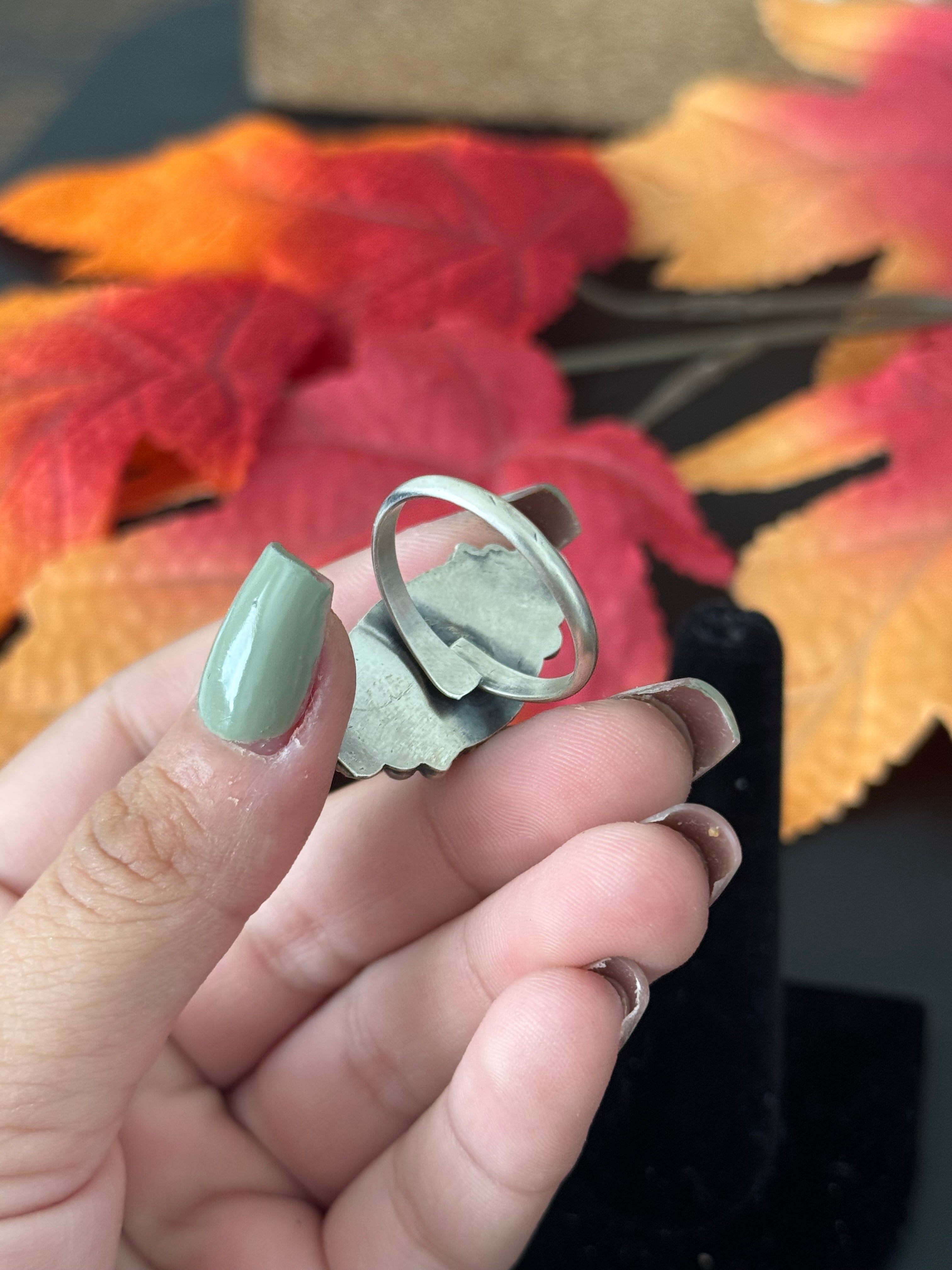 Beautiful ring. Scott Skeets Palomino Variscite & Sterling Silver Adjustable Ring. It measure 1 3/8 inches long and 5/8 of an inch wide.