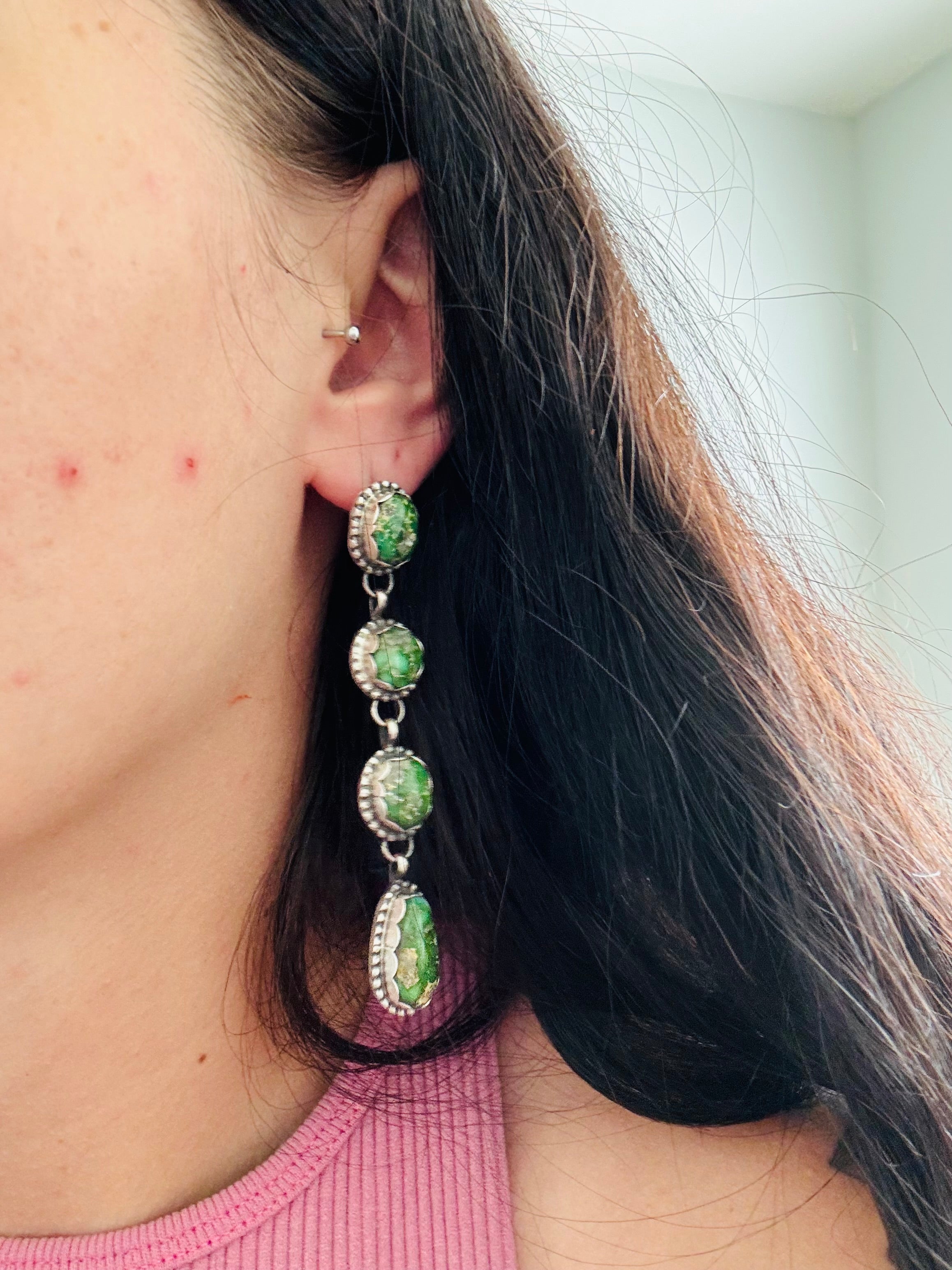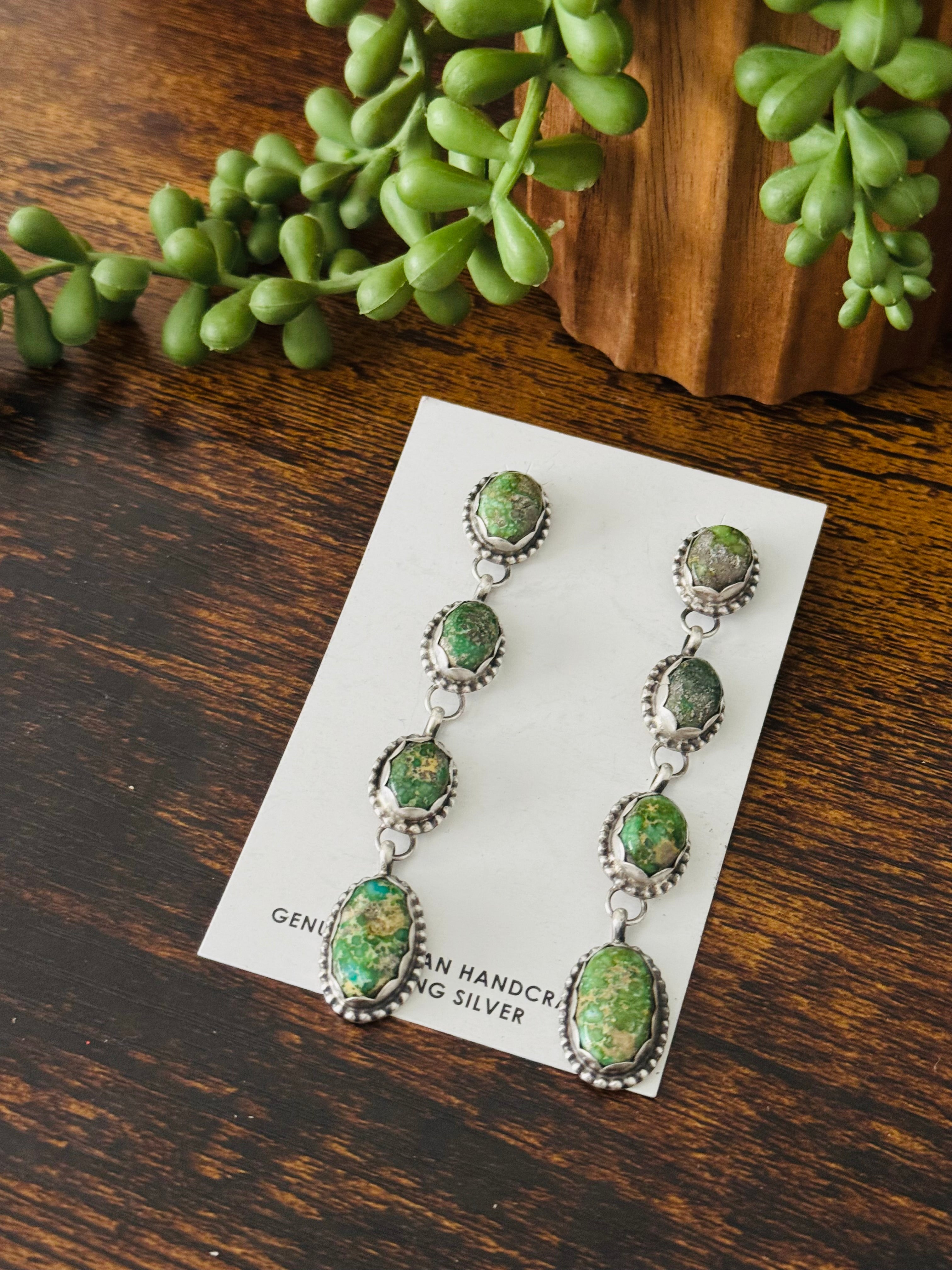 Beautiful lightweight Dangle Earrings. Dave Skeets Sonoran Gold Turquoise & Sterling Silver Post Dangle Earrings. It measures 3 1/8 inches long and 1/2 of an inch wide. Stamped sterling silver and signed.