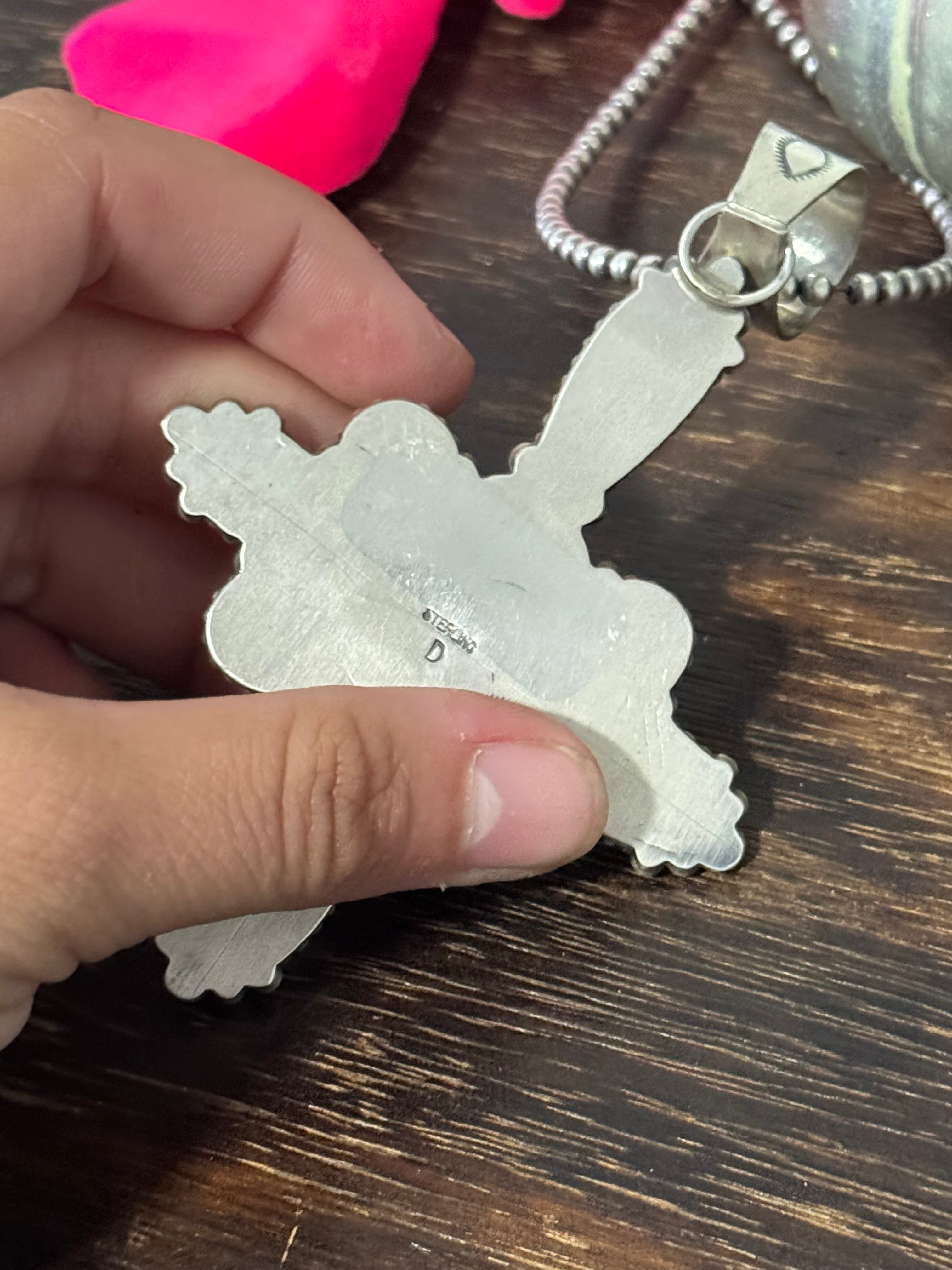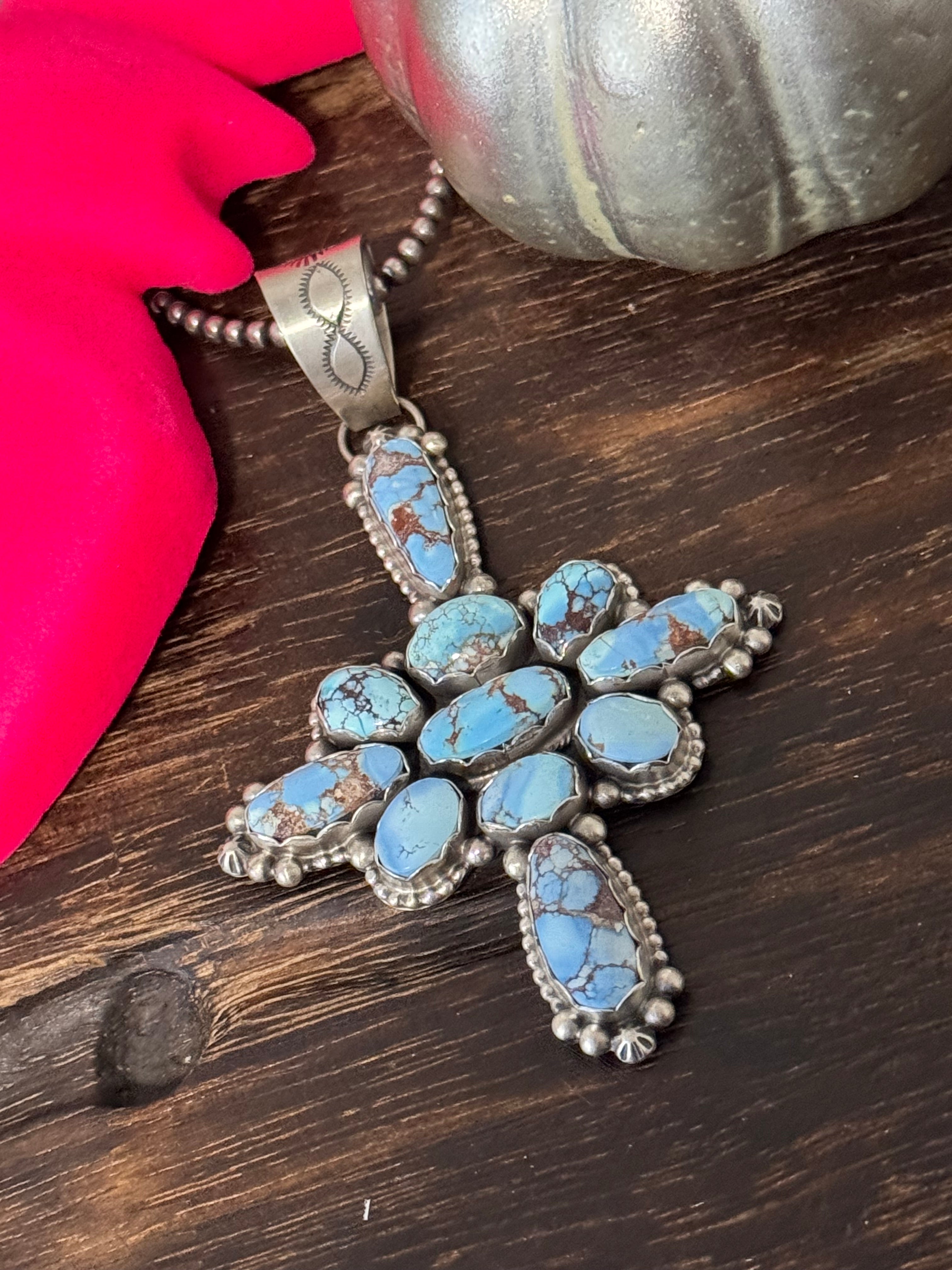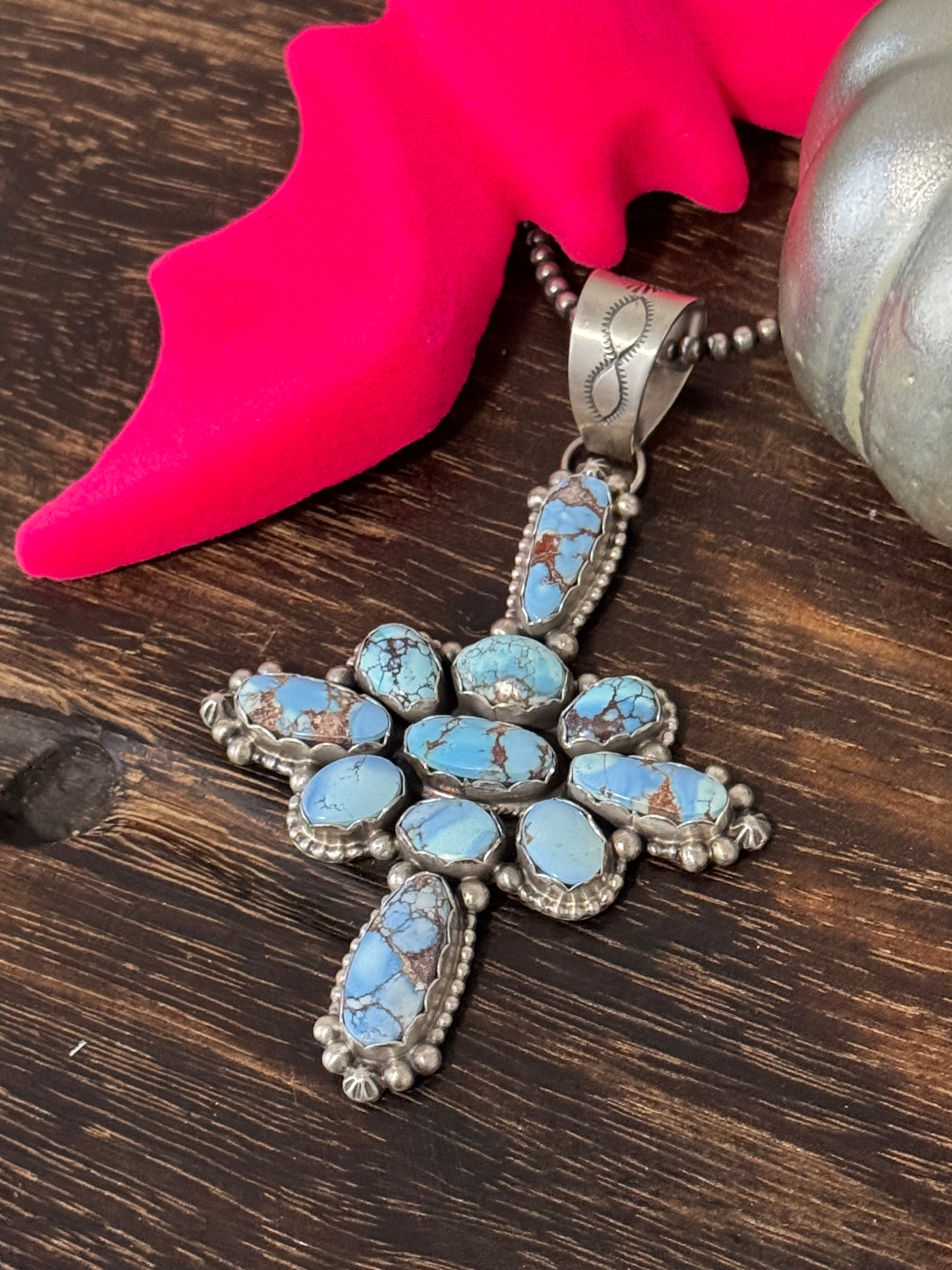 Dave Skeets Golden Hills Turquoise & Sterling Silver Cluster Pendant. It measures 3 3/4 inches long and 2 1/2 inches wide. Pendant Only!! Signed by the artist and stamped sterling silver.